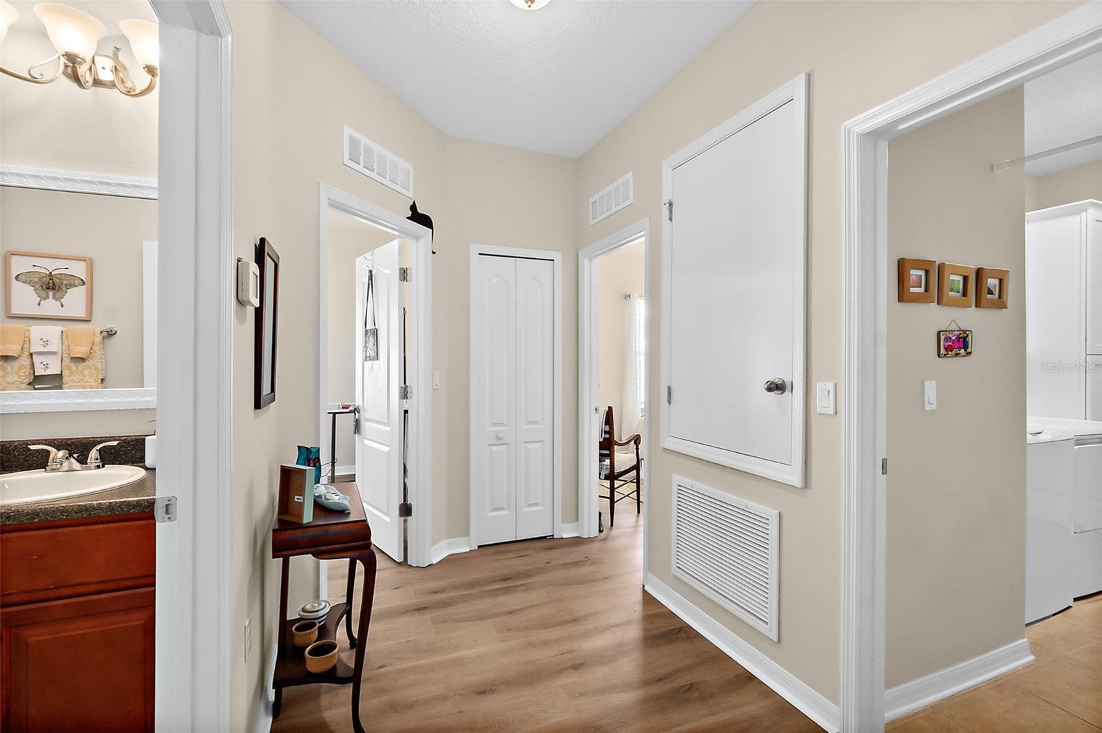 This 2016 Seagate built home in the highly desireable Pine Lakes subdivision of Palm Coast offers a spacious and modern living environment. With three bedrooms, two bathrooms, and a three-car garage, it provides an open floor plan for comfort and functionality. The home includes an office/bonus room, ideal for working from home or additional living space. Recent updates include luxury vinyl plank (LVP) flooring throughout, a top of the line Bosch dishwasher, along with some new light fixtures and ceiling fans, adding a fresh and stylish touch. The laundry room has been upgraded with extra cabinets for added storage space. Outside, the fully fenced yard features a large 10 x 12 shed and a generously sized screened lanai, perfect for outdoor relaxation. Enjoy easy access to local amenities, including shopping, dining, walking/biking trails, golf courses and parks. The expansive Flagler County beaches make this location perfect for those who love coastal living. This is truly living in Paradise!