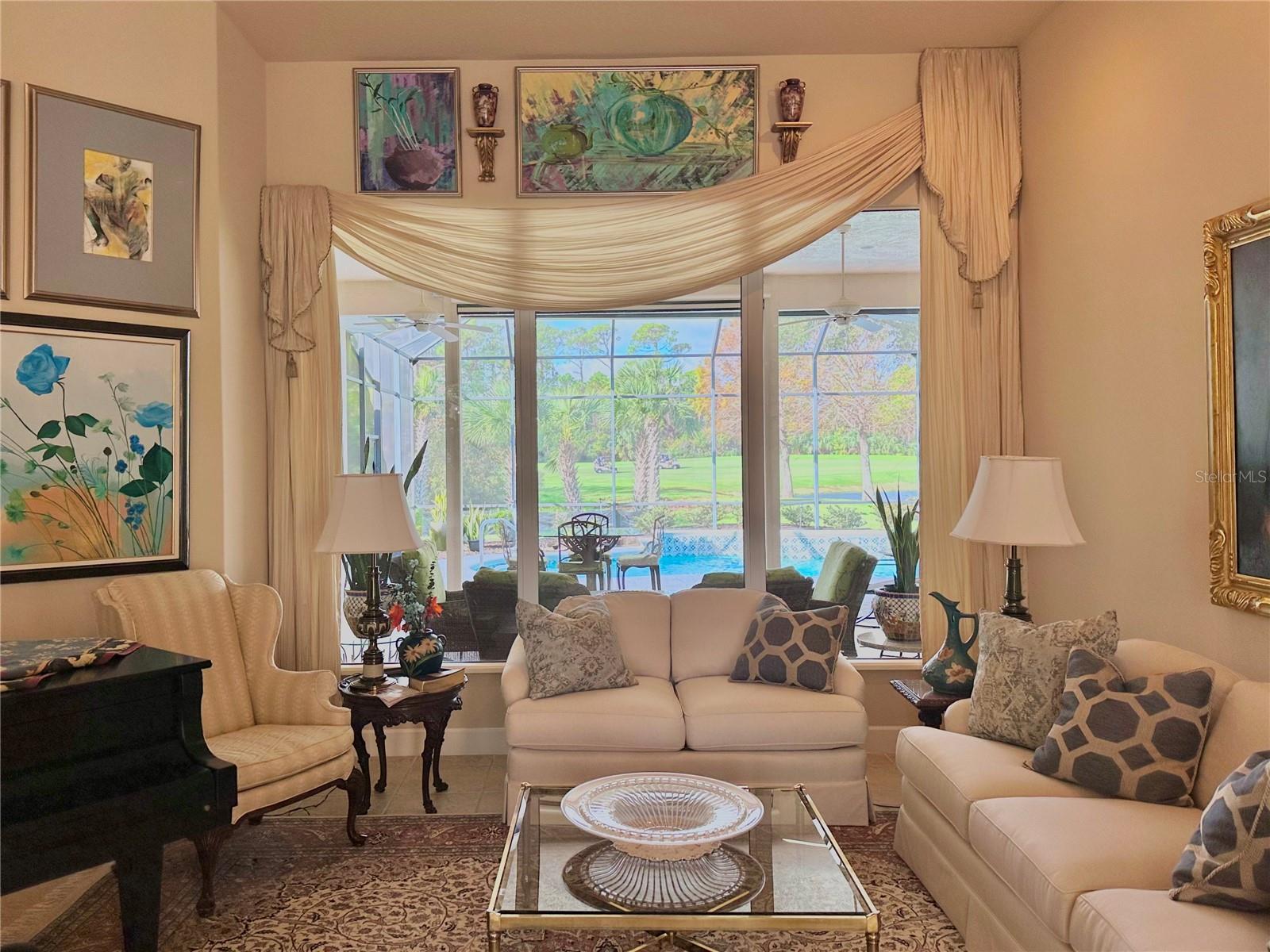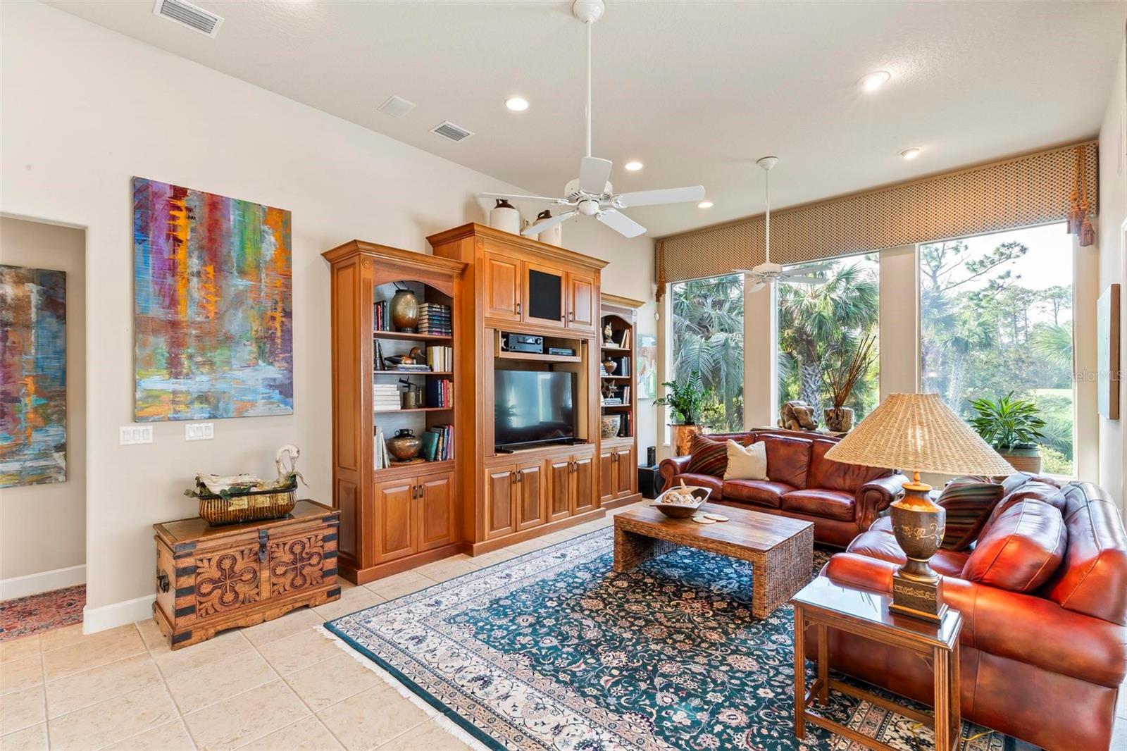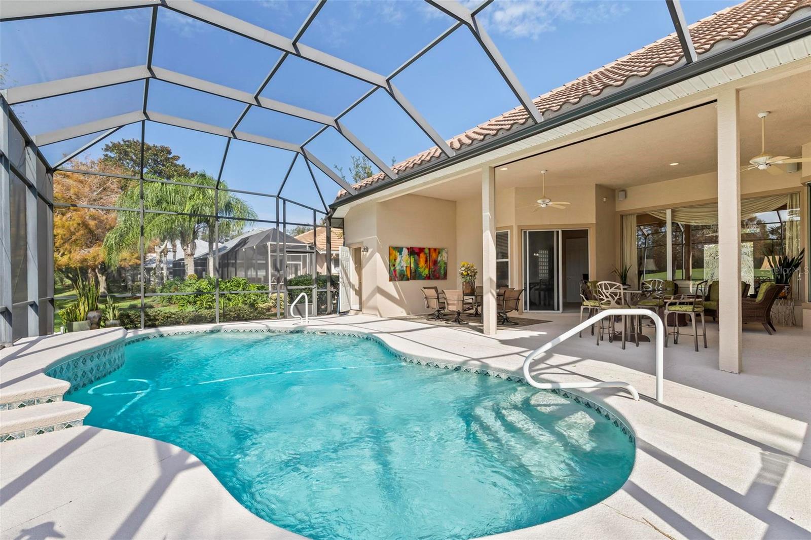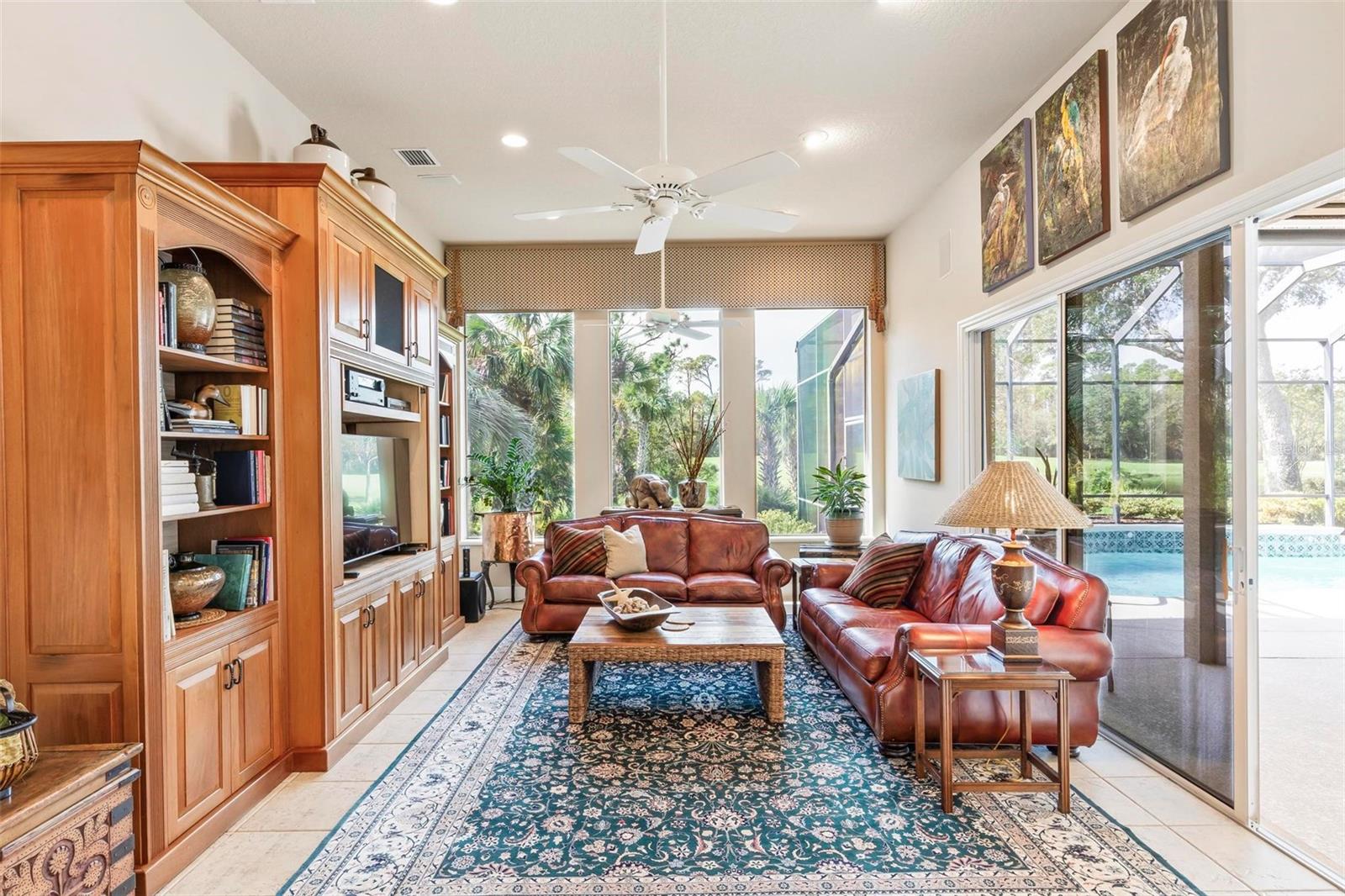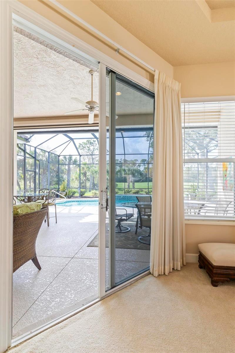 Situated within the exclusive Waterfront Golf Course Community of Grand Haven, 24 Osprey Circle is a masterpiece of custom craftsmanship and luxury living, offering sweeping views of tranquil water and the par-5, 7th hole of the renowned Jack Nicklaus Grand Haven Golf Club with no homes across the way. This thoughtfully enhanced ICI Preakness II model stands out with a multitude of custom features, including an extended family room and an under-air full bathroom accessible exclusively from the pool area for effortless indoor-outdoor living. The home greets you with striking 8-foot double etched glass entry doors that open into a grand living space with 12-foot ceilings, floor-to-ceiling windows framed with upgraded wwhite marble sills, and an abundance of natural light flooding the formal dining room. The primary suite is a true sanctuary, highlighted by elegant trayed ceilings, direct access to the pool, and a luxurious bathroom with dual sinks, a soaking tub, a newly upgraded glass shower, and a spacious walk-in closet. Just down the hall, you'll find a versatile room currently used as an office, which can seamlessly transform into a bedroom, studio, or any space that suits your needs, with a full bathroom conveniently located right outside. The open-concept kitchen is perfect for culinary enthusiasts, featuring solid wood cabinetry with custom trim, an island, a built-in oven and microwave, a cooktop, and 2021-replaced stainless steel appliances. A reverse osmosis water filtration system ensures pure, fresh water at your fingertips. The adjacent family room is a showstopper with its expansive, tinted floor-to-ceiling windows, dual ceiling fans, and a bespoke mahogany entertainment center, expertly crafted by North Carolina’s renowned cabinet makers. Behind a newly added barn door, you’ll discover two secondary bedrooms with that share a well-appointed full bathroom. Beyond the kitchen lies an additional studio space that can serve as a bedroom or a creative retreat. The customized laundry room offers plentiful cabinet storage, a utility sink, and marble countertops. Step outside to a sprawling, screened-in lanai equipped with an electric roll-down screen to provide shade during sunsets. The pristine pool overlooks the serene lake and the manicured fairway of the 7th hole, creating a picturesque backdrop for relaxation or entertaining. Completing this exceptional property is an extended side-facing, oversized 2-car garage with an additional access door and ample space for storage. Notable features include a durable tile roof, dual air handlers (2014 and 2015), a 2021 hot water heater, and an elegant paver driveway with a welcoming sitting area. As a resident of Grand Haven, enjoy access to two premier amenity centers featuring pools, fitness facilities, tennis courts, and a variety of community activities. This meticulously customized estate offers a rare blend of sophistication, comfort, and the coveted lifestyle of Grand Haven. Don’t miss your chance to make this exceptional home yours.