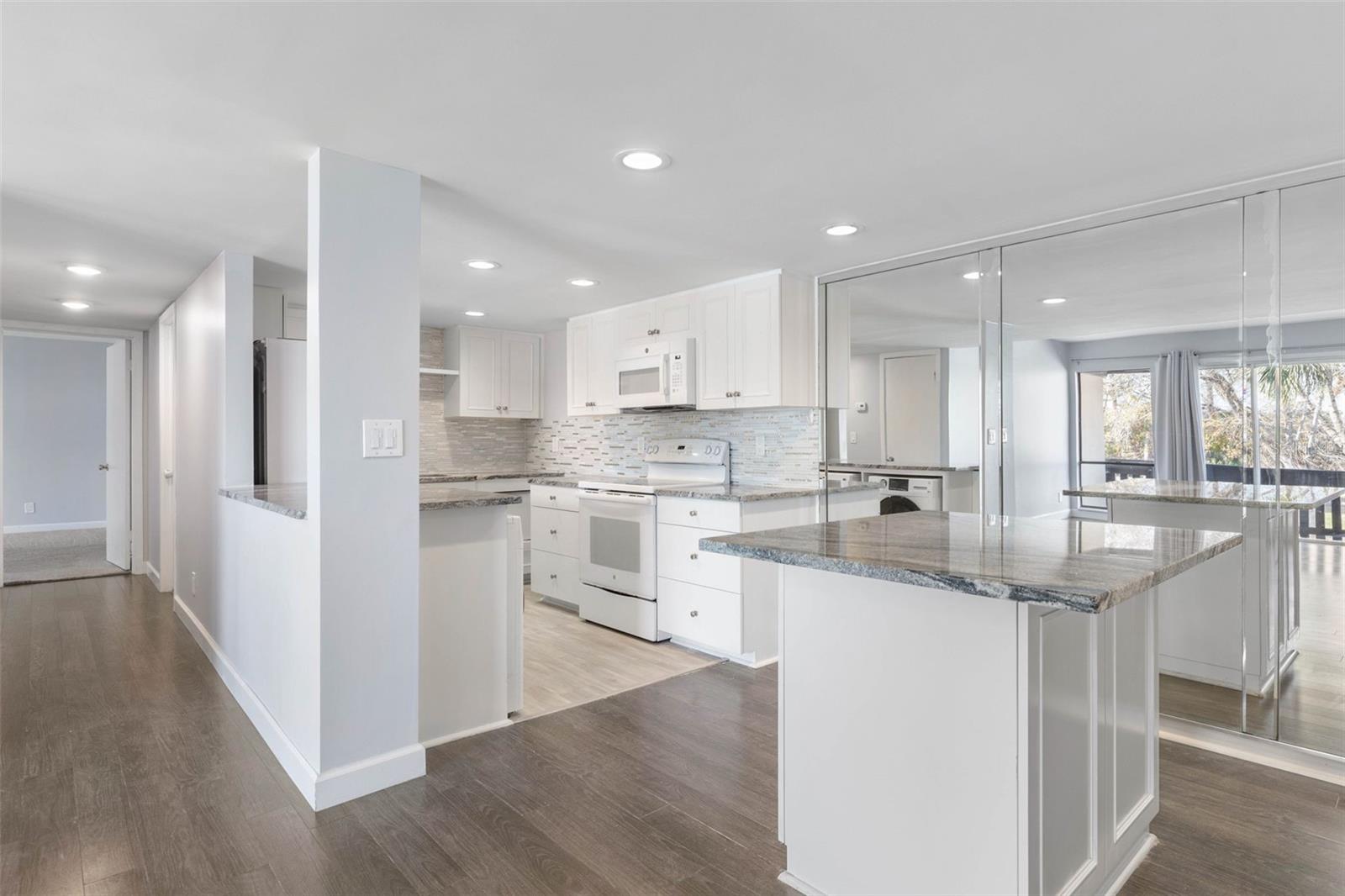 Discover this beautifully renovated condominium in the heart of Palm Coast! Located in the sought-after Palm Club Community, this breathtaking 2nd-floor residence is right out of your favorite style magazine or designer show. Thoughtfully updated throughout, this gorgeous condo offers a perfect blend of modern design and functional living spaces. As you step inside, you’ll be greeted by a bright and inviting open-concept living area with “like-wood” luxury flooring throughout. Sliding glass doors lead to a private balcony where you can enjoy serene water views—an ideal spot for your morning coffee or relaxing after a long day. Adjacent to the living space is a versatile island, perfect for use as a high-top dining area—just add barstools! The kitchen is efficiently designed, featuring crisp white appliances such as a refrigerator, microwave, and dishwasher. Maximizing space, the kitchen also integrates the laundry area, with counters providing room for both meal prep and folding laundry. Custom backsplash, designer white cabinetry and stunning polished blue jasper granite counters make this kitchen absolutely sparkle. Down the hall, the plush master suite awaits, offering an oversized carpeted bedroom with its own sliding glass doors that open to a second private balcony. The walk-in closet is truly one of a kind, showcasing custom built-ins for optimal organization. The en-suite bathroom boasts ample counter space, generous storage, and a walk-in shower. The second bedroom is nicely carpeted, fully updated, and conveniently located near the second full bathroom, which includes a combination shower and bathtub. This wonderful property is a part of the highly desirable Palm Harbor community, which features a community pool and grilling area. Situated just minutes from the beach, local dining, and offering easy access to I-95 and other major roadways, this amazing home offers both convenience and comfort. Don't miss the chance to make this exceptional property your own!