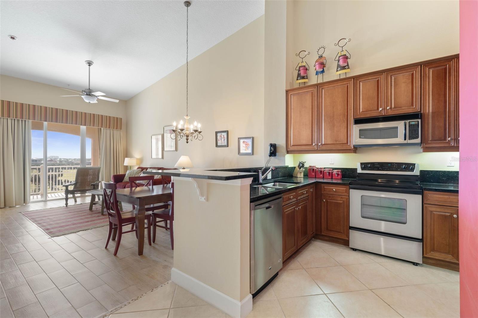 Welcome to 15 Ocean Crest Dr #1342, a breathtaking top-floor condominium in the highly desirable Villas at Hammock Beach! Offering a spacious 3 bedroom/2 bathroom floor plan with vaulted ceilings on the penthouse level, this fantastic residence features sweeping views of the Atlantic Ocean and the Jack Nicklaus Signature Ocean Course. As you step inside, you’ll find a guest bedroom near the entrance, as well as the 2nd guest bedroom, and a full bathroom with a shower-tub combination to accommodate extended family. Just ahead, this welcoming space opens into a bright and airy wide-open main area featuring the kitchen, dining space, and living room. With ceilings that soar up to 18 feet, this residence has a grandiose feel throughout. Granite counters, stainless steel appliances and 42-inch wood cabinets are just a few of the features that make this kitchen sparkle. Your guests can pull up a stool at the breakfast bar and chat with the host as coffee is brewed in the morning, or while the evening’s feast is prepared. Dry bar offers extra cabinets and counter space to create your favorite libations. Move over to the elegant dining space with chandelier- the ideal space to enjoy great conversation over a meal. In the comfortable living area, gather ‘round for some relaxing while you enjoy the blue and green views out the window. Large sliding glass doors flood this area with natural light and lead to a spacious balcony, where you can unwind and enjoy the ocean breeze and stunning views of the Atlantic and the Ocean Course. The condo boasts “like-wood” tile flooring throughout the main living areas, with cozy carpet in the bedrooms. The master suite features expansive windows that invite in abundant natural light. A generous walk-in closet leads to the luxurious master bathroom, complete with soaking tub, glass-enclosed walk-in shower, and dual vanity. This condo is the ideal retreat for anyone seeking a beachside escape. Seize the opportunity to join the onsite Club at Hammock Beach, granting access to world-class amenities, including the Jack Nicklaus Ocean Course, multiple dining options, full-service spa, indoor and outdoor pools, lazy river, water slide, a state-of-the-art fitness center, social activities and so much more! Don’t miss this incredible opportunity to experience coastal luxury at its finest!