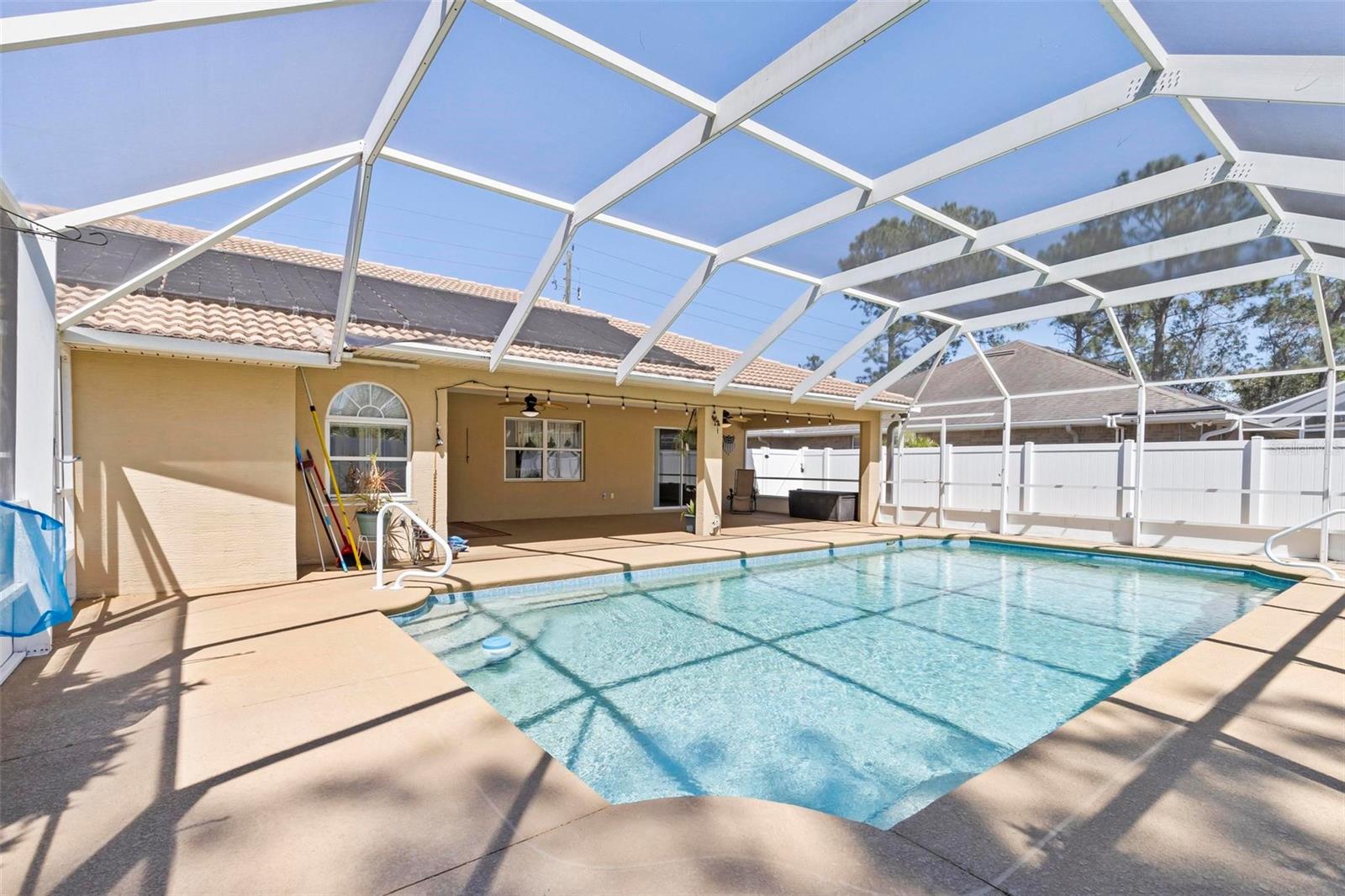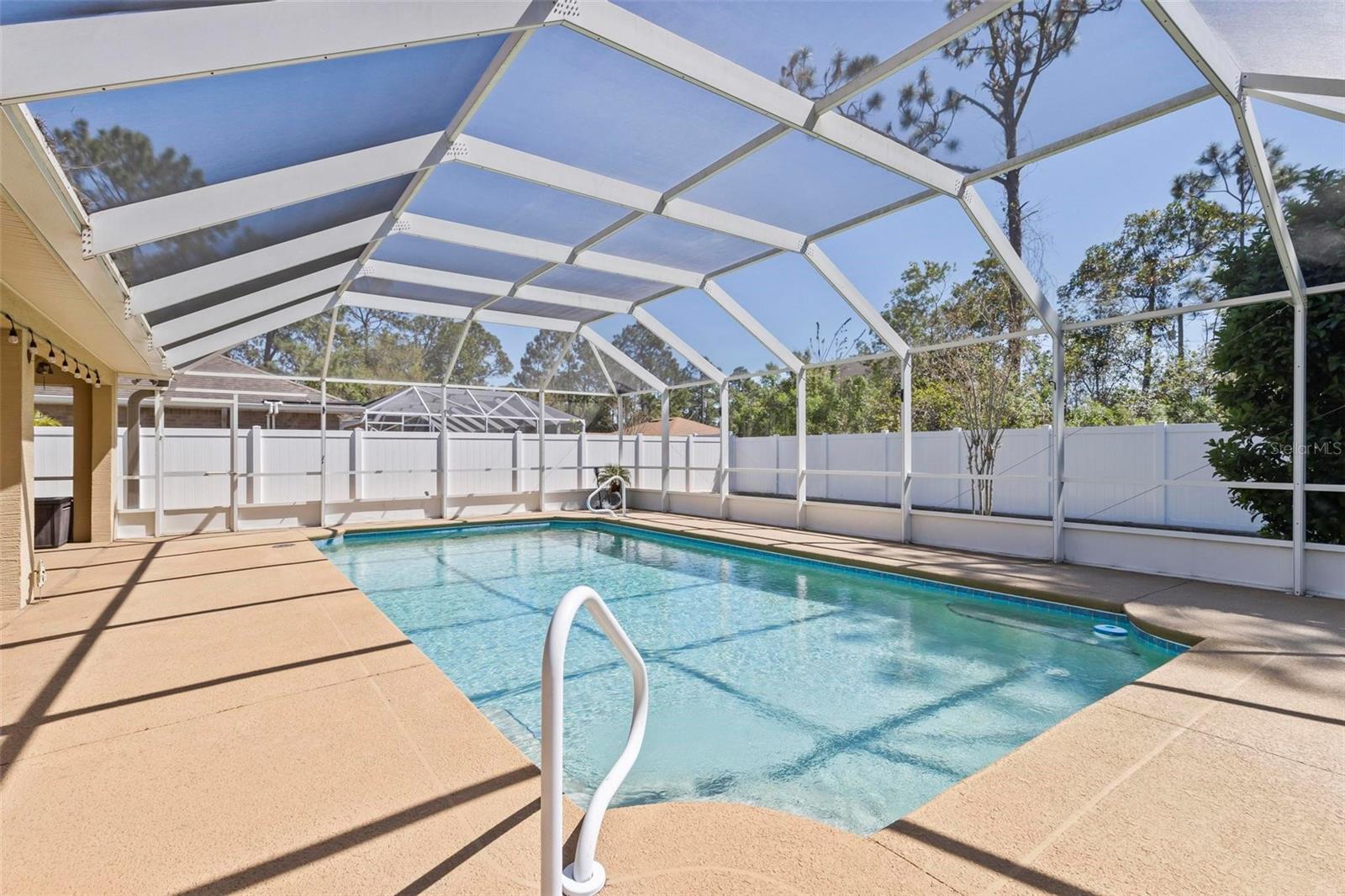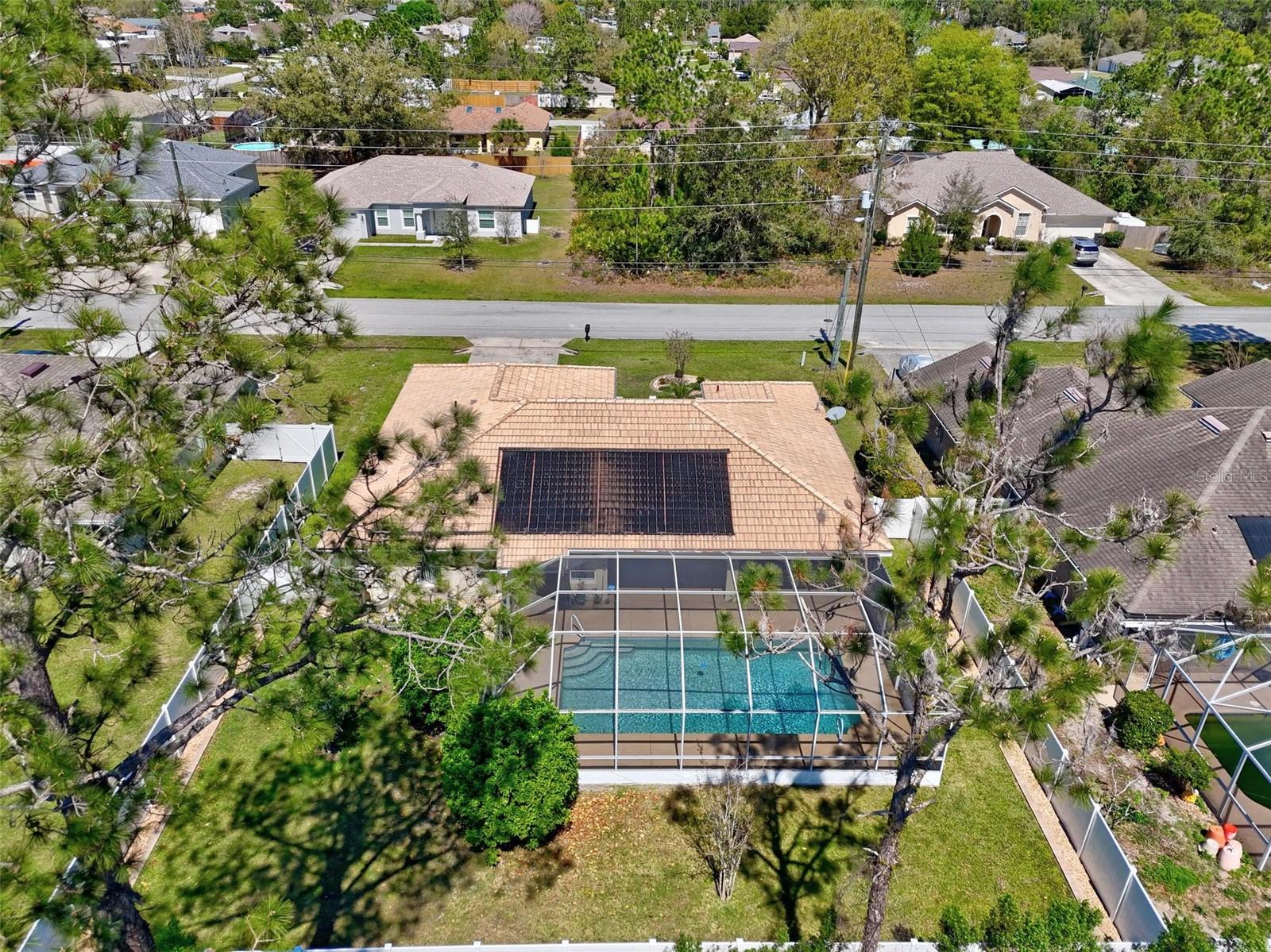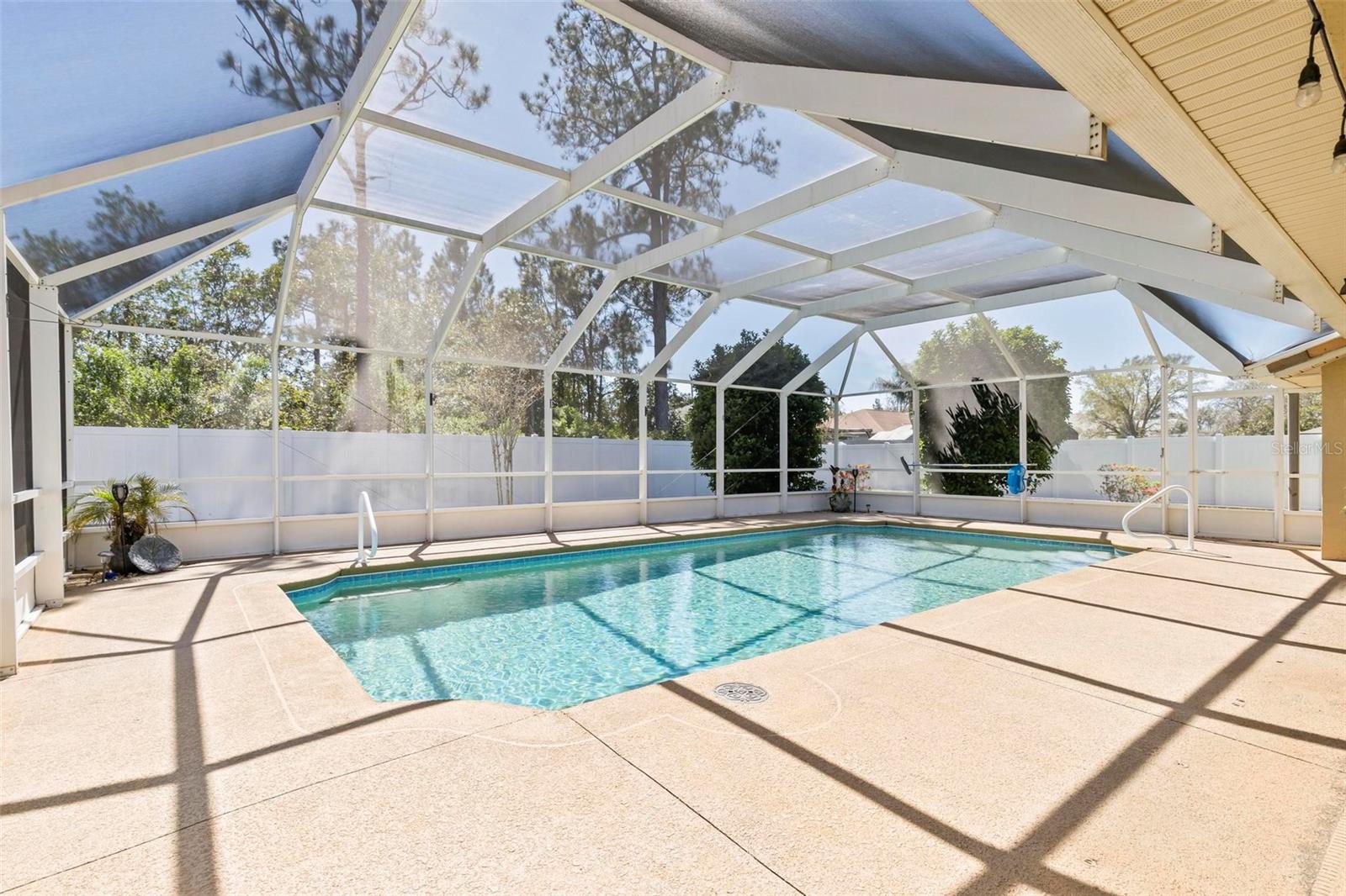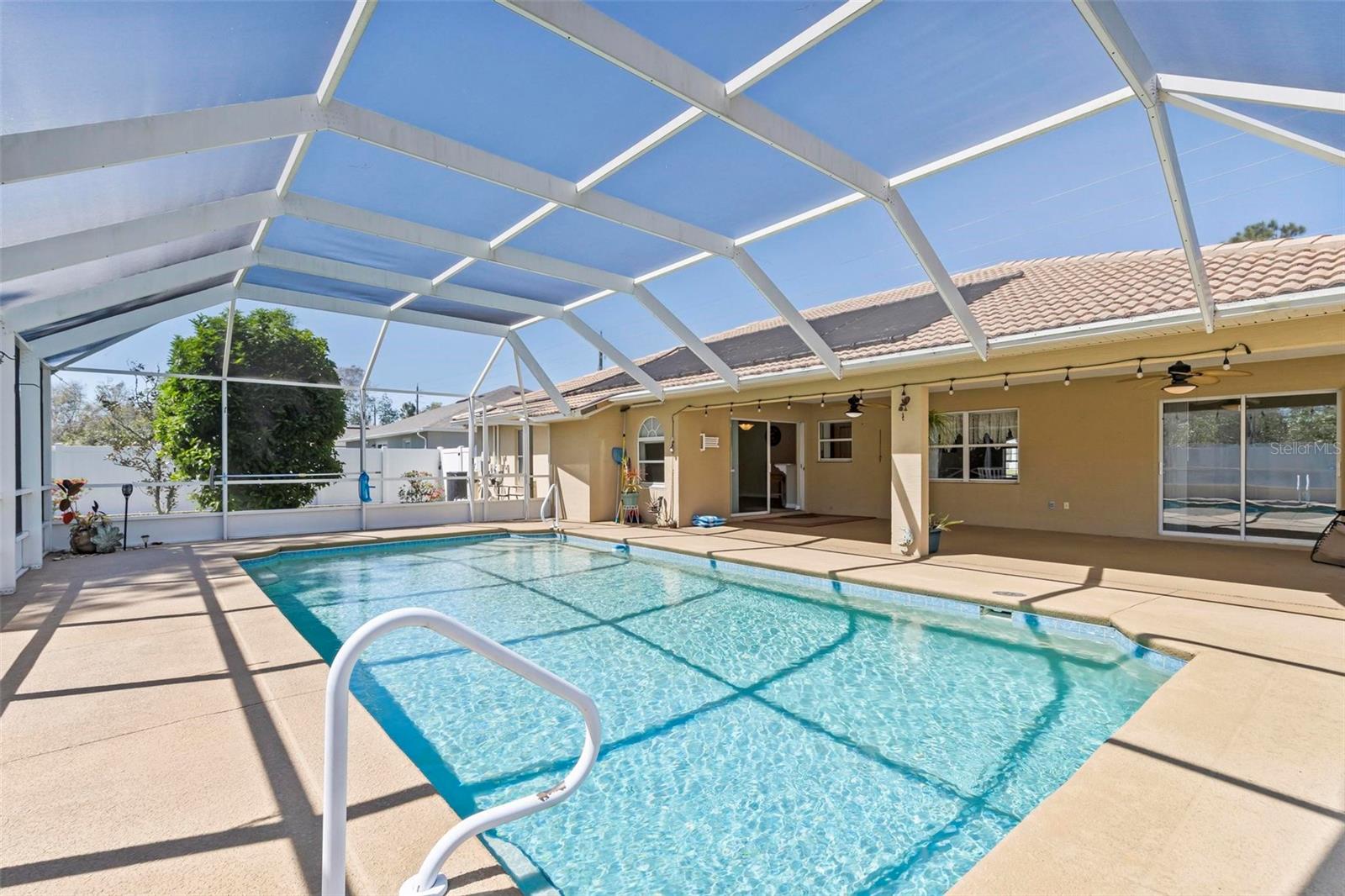 Florida living at it's finest! This pool home with a tile roof is ready for it's new family. It has a split floor plan with the primary bedroom and ensuite on one side and the other 2 bedrooms and bath on the other side. There is a living room and dining area along with a kitchen nook and family room area. The kitchen separates these spaces. Beautiful flooring, niches, vaulted ceiling, curved windows, sliding glass doors heading out to the pool and lanai from the family room and the primary bedroom, stainless steel appliances, solid surface counter tops, double sinks in the primary bath, 2 closets in the primary bedroom with one as a walk-in closet, a tiled walk-in shower in the primary bath, the amazing salt water pool is solar heated with a screened lanai, the yard is beautifully landscaped, and much more! Call to see this home soon. It could be what you have been looking for!