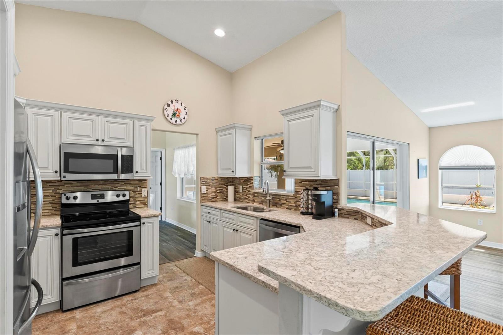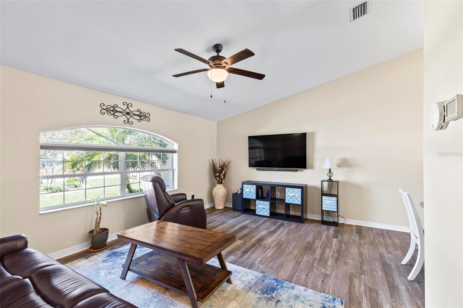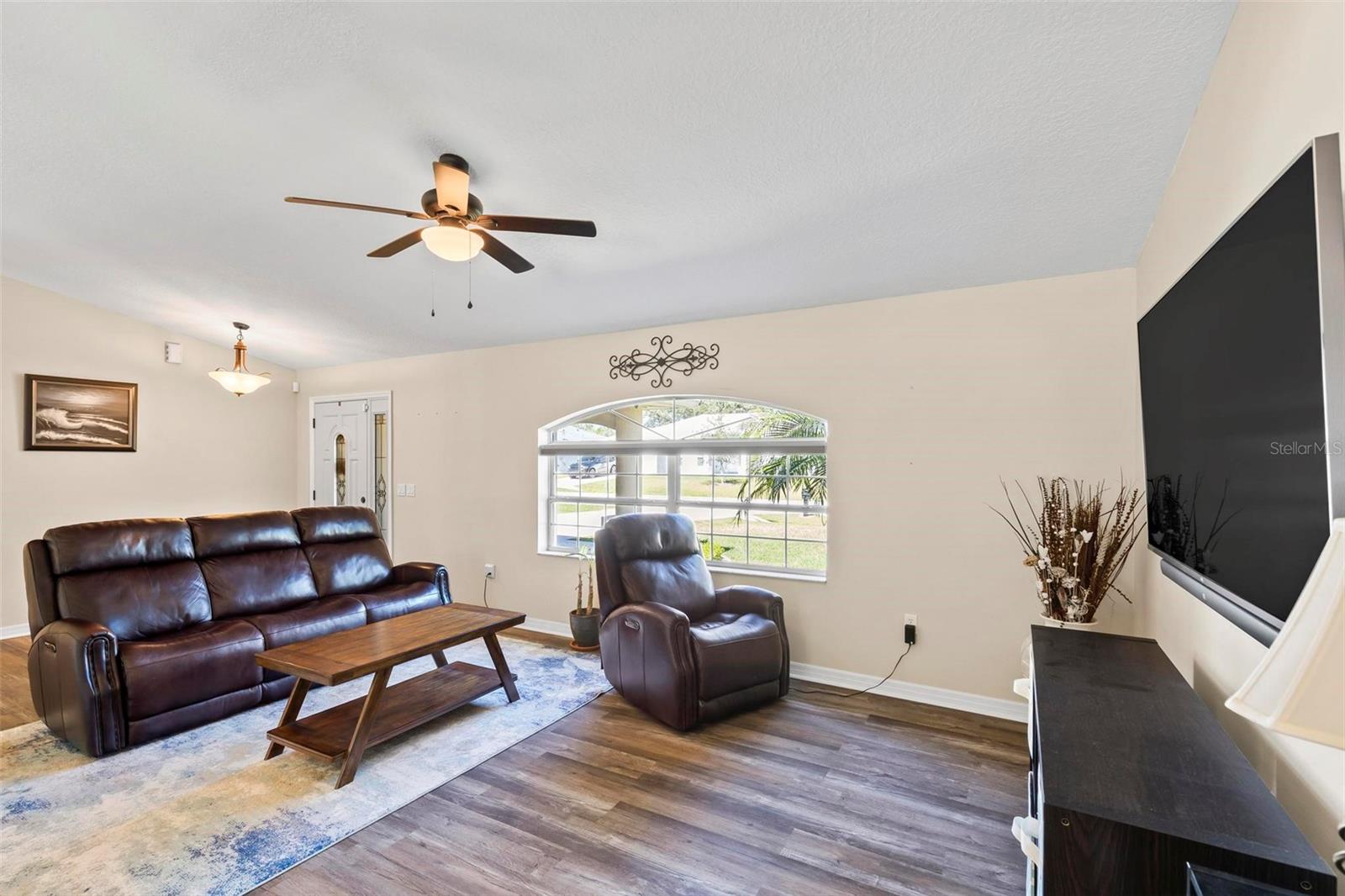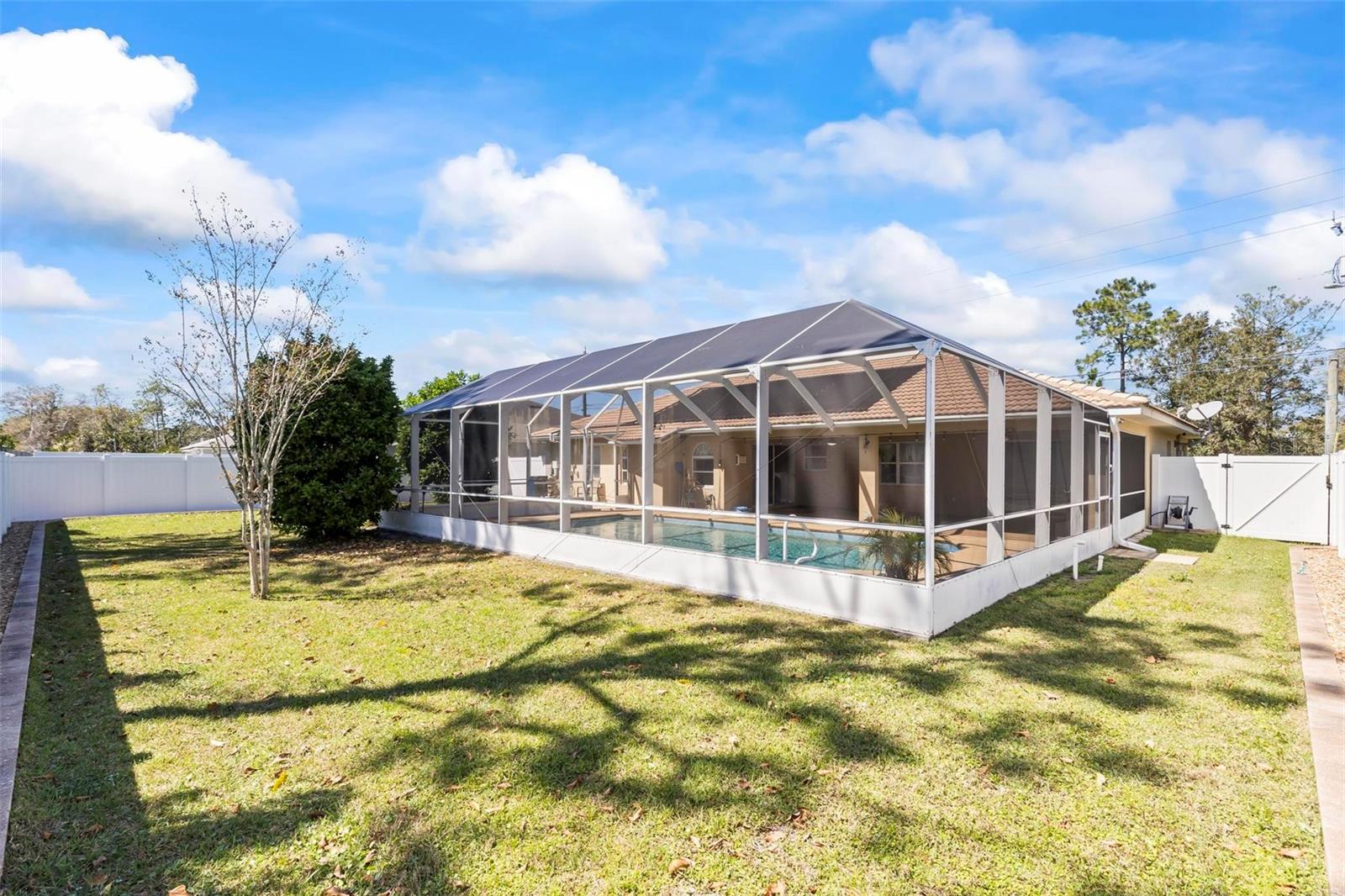 Florida living at it's finest! This pool home with a tile roof is ready for it's new family. It has a split floor plan with the primary bedroom and ensuite on one side and the other 2 bedrooms and bath on the other side. There is a living room and dining area along with a kitchen nook and family room area. The kitchen separates these spaces. Beautiful flooring, niches, vaulted ceiling, curved windows, sliding glass doors heading out to the pool and lanai from the family room and the primary bedroom, stainless steel appliances, solid surface counter tops, double sinks in the primary bath, 2 closets in the primary bedroom with one as a walk-in closet, a tiled walk-in shower in the primary bath, the amazing salt water pool is solar heated with a screened lanai, the yard is beautifully landscaped, and much more! Call to see this home soon. It could be what you have been looking for!