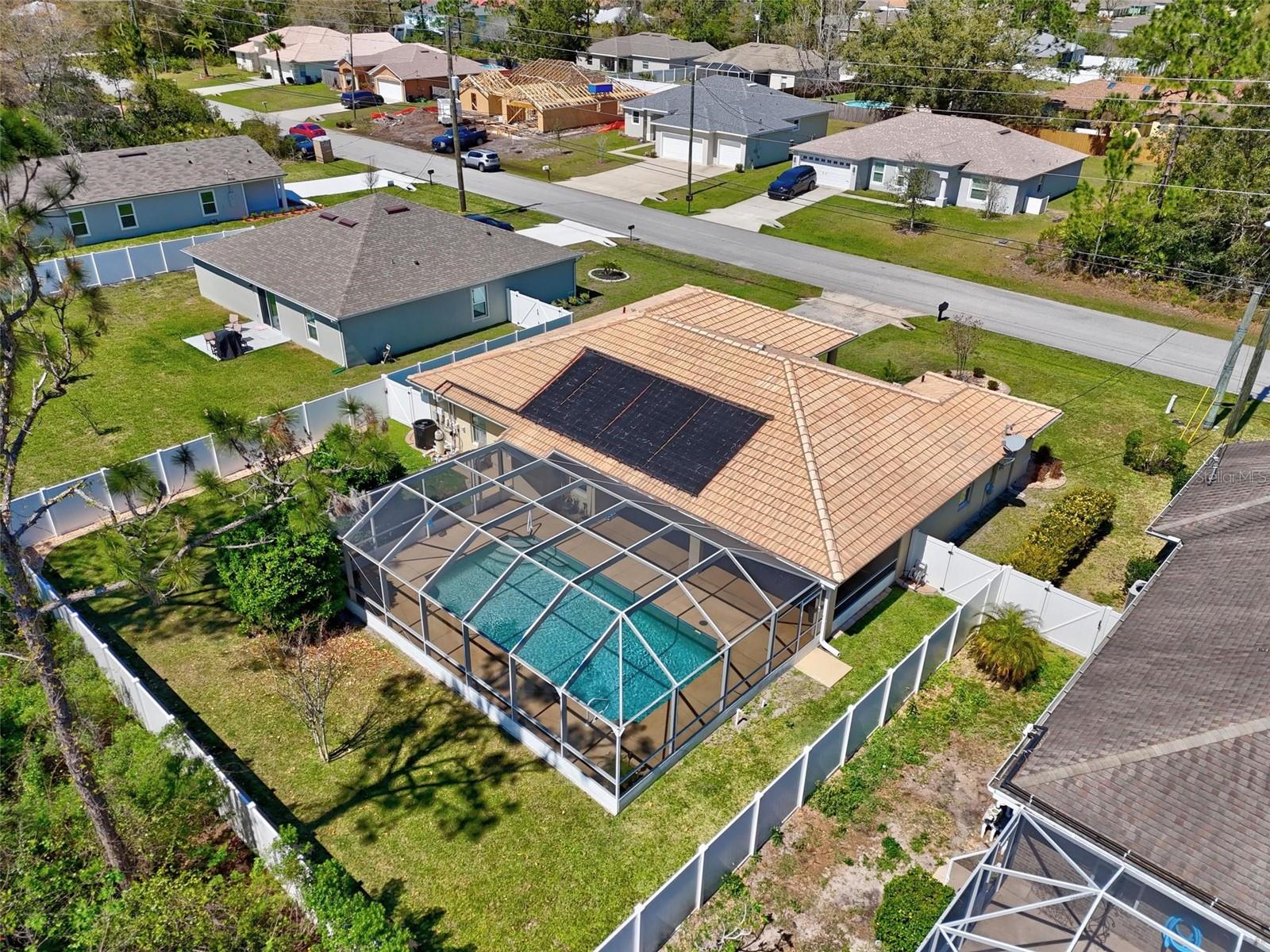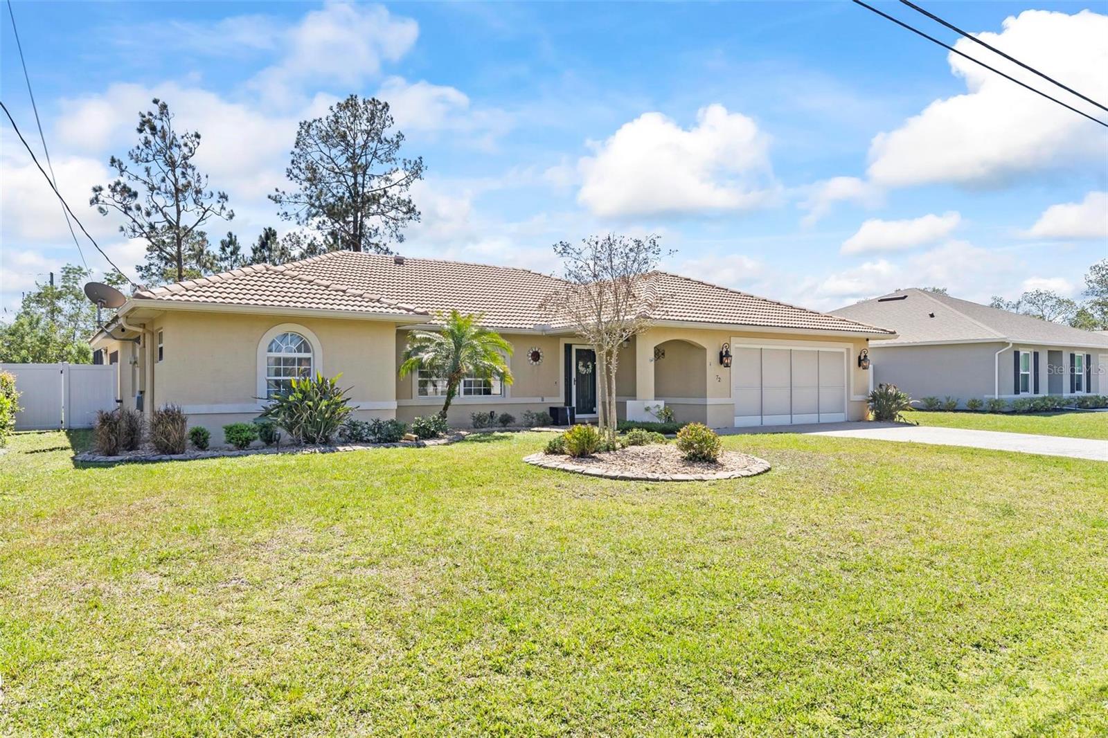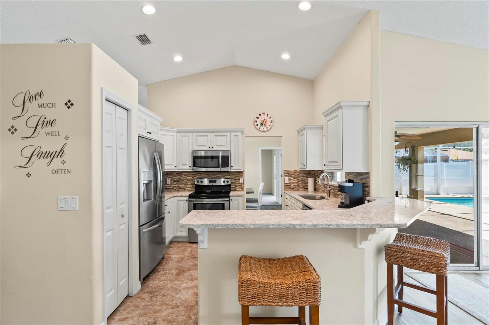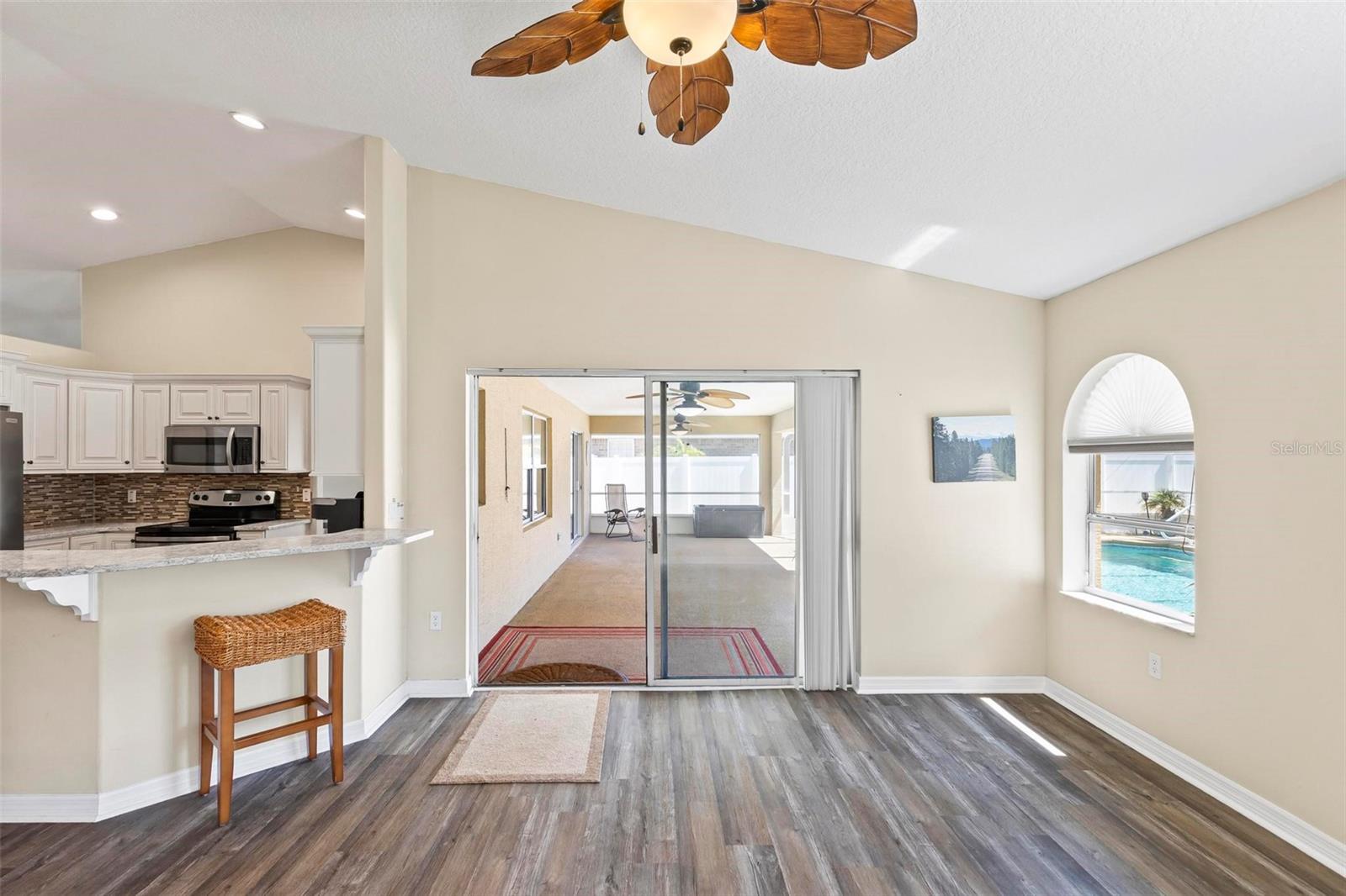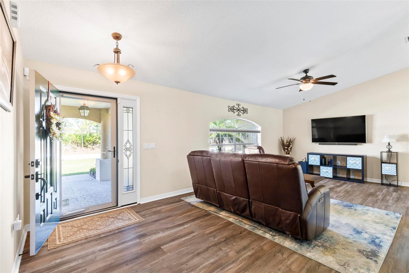 Florida living at it's finest! This pool home with a tile roof is ready for it's new family. It has a split floor plan with the primary bedroom and ensuite on one side and the other 2 bedrooms and bath on the other side. There is a living room and dining area along with a kitchen nook and family room area. The kitchen separates these spaces. Beautiful flooring, niches, vaulted ceiling, curved windows, sliding glass doors heading out to the pool and lanai from the family room and the primary bedroom, stainless steel appliances, solid surface counter tops, double sinks in the primary bath, 2 closets in the primary bedroom with one as a walk-in closet, a tiled walk-in shower in the primary bath, the amazing salt water pool is solar heated with a screened lanai, the yard is beautifully landscaped, and much more! Call to see this home soon. It could be what you have been looking for!