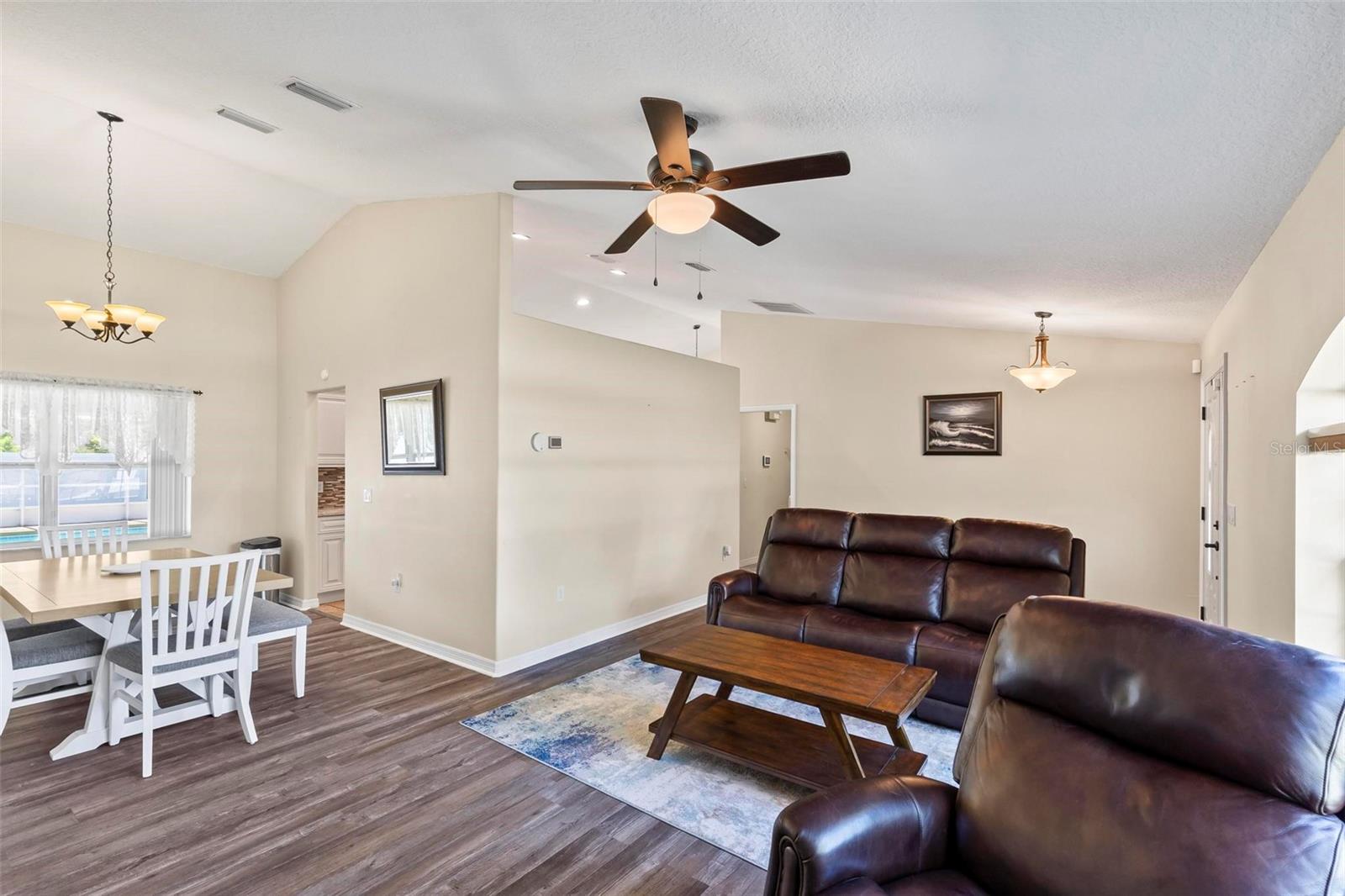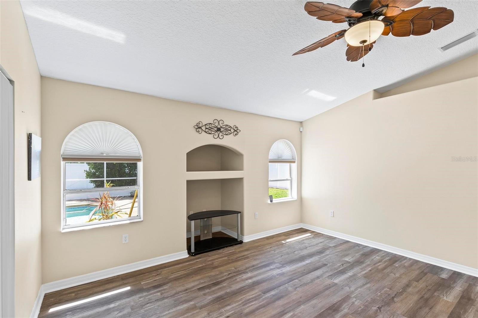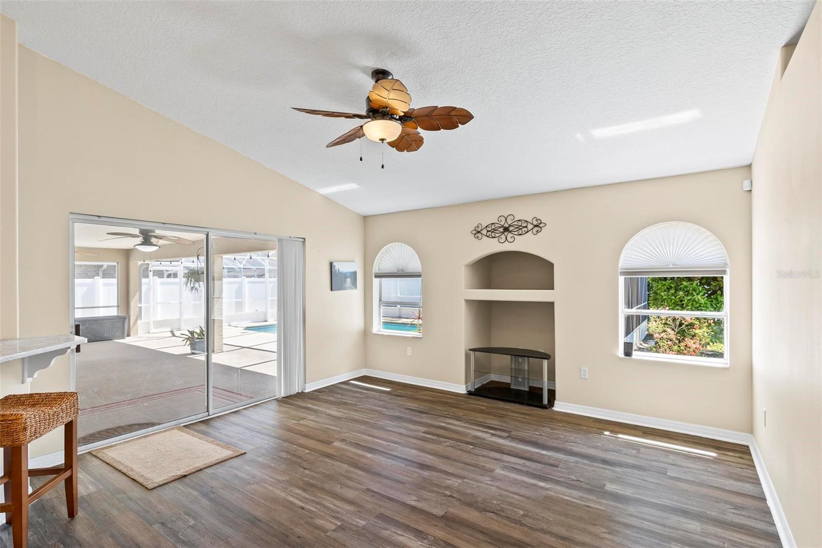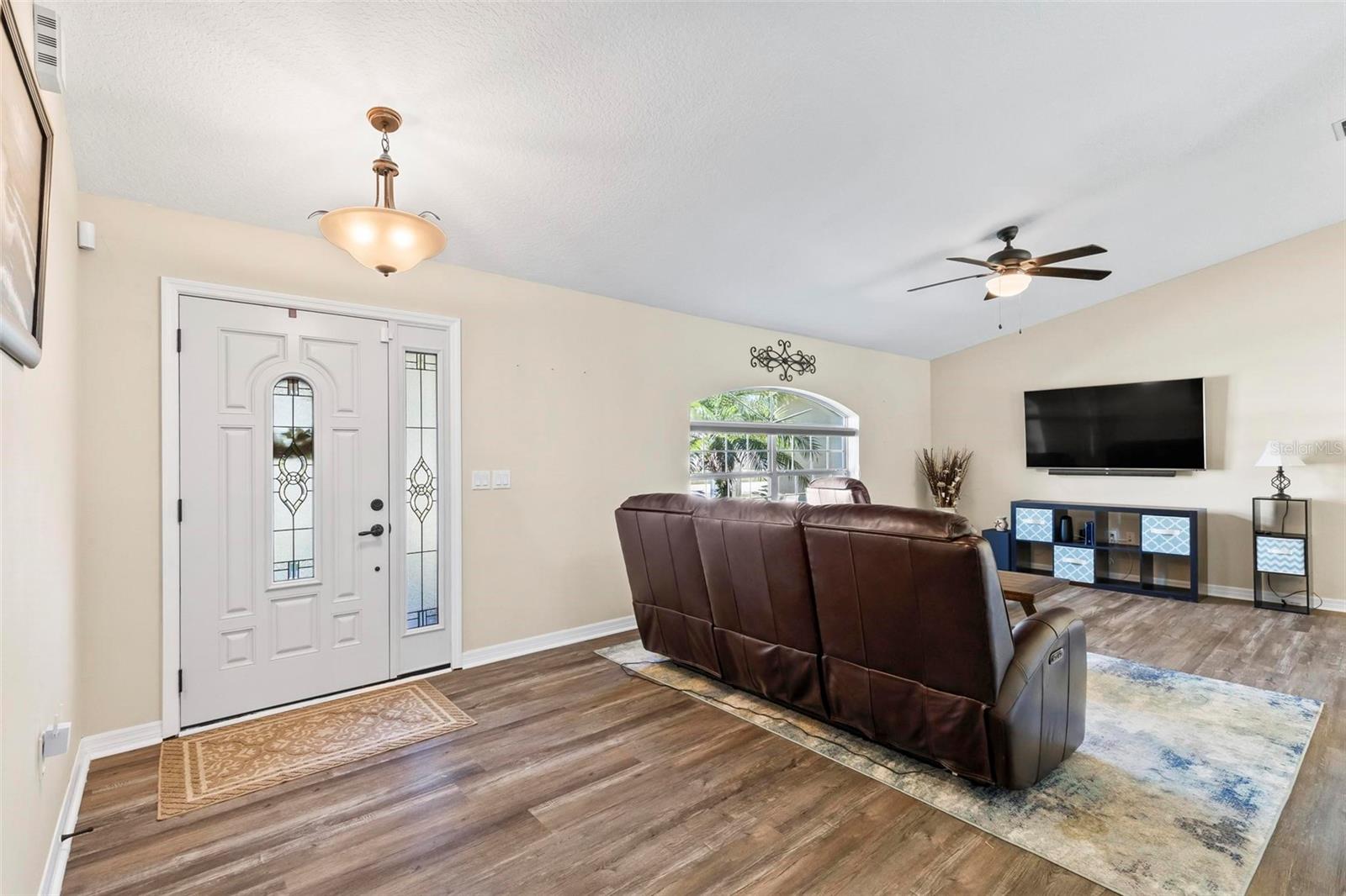 Florida living at it's finest! This pool home with a tile roof is ready for it's new family. It has a split floor plan with the primary bedroom and ensuite on one side and the other 2 bedrooms and bath on the other side. There is a living room and dining area along with a kitchen nook and family room area. The kitchen separates these spaces. Beautiful flooring, niches, vaulted ceiling, curved windows, sliding glass doors heading out to the pool and lanai from the family room and the primary bedroom, stainless steel appliances, solid surface counter tops, double sinks in the primary bath, 2 closets in the primary bedroom with one as a walk-in closet, a tiled walk-in shower in the primary bath, the amazing salt water pool is solar heated with a screened lanai, the yard is beautifully landscaped, and much more! Call to see this home soon. It could be what you have been looking for!