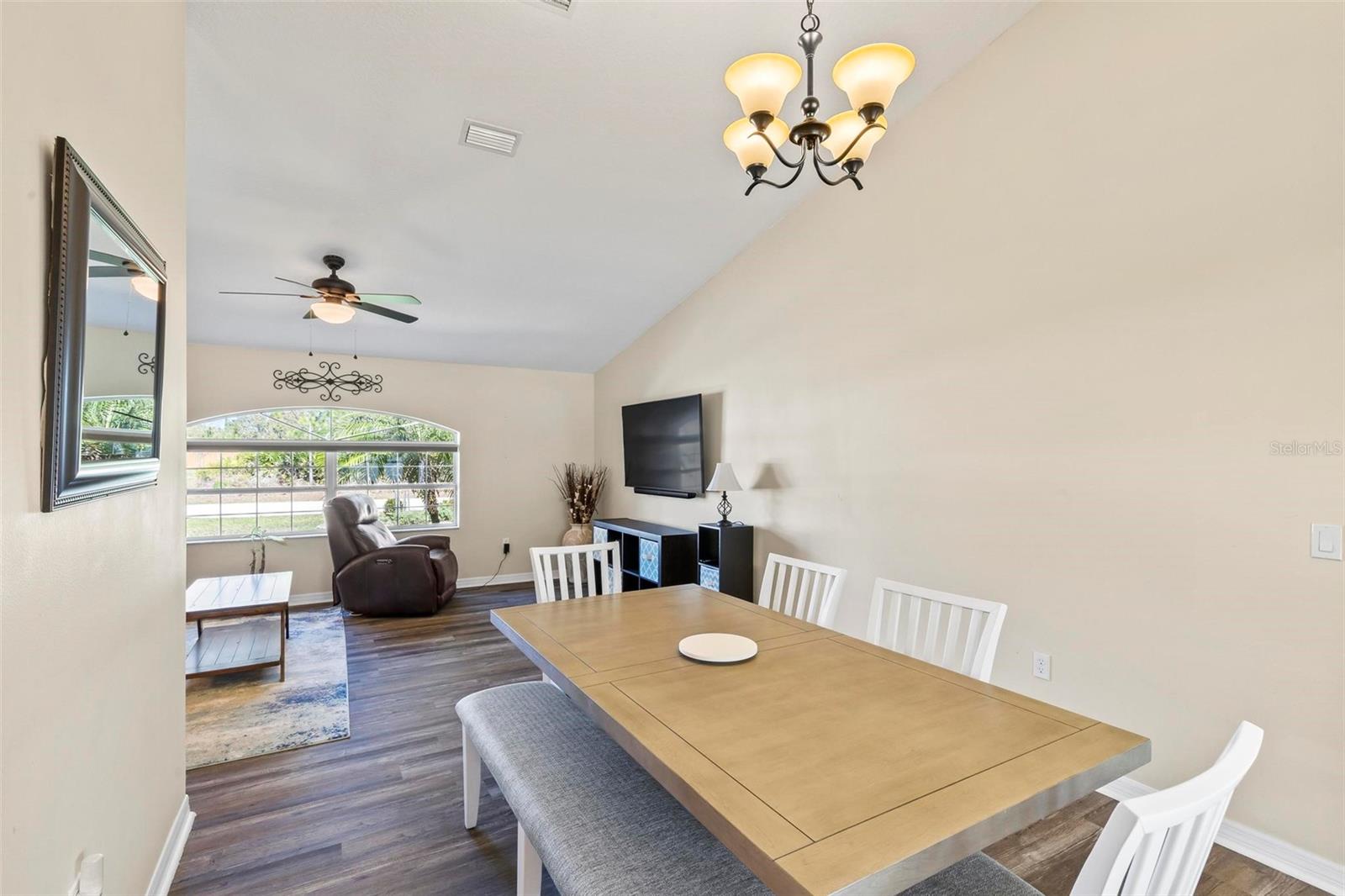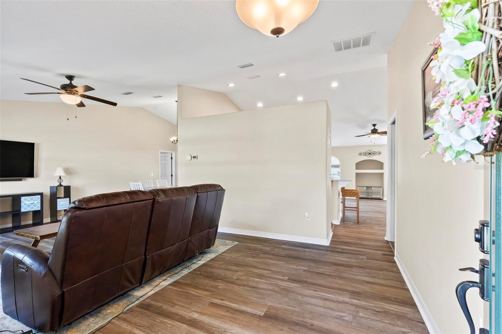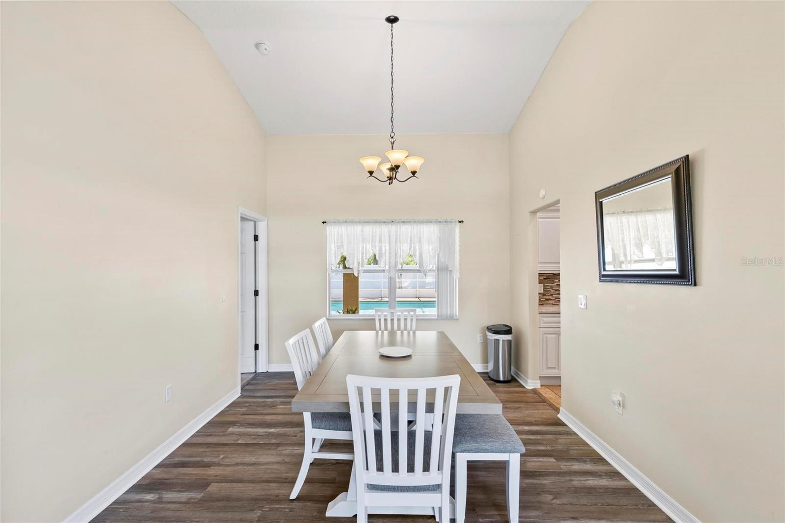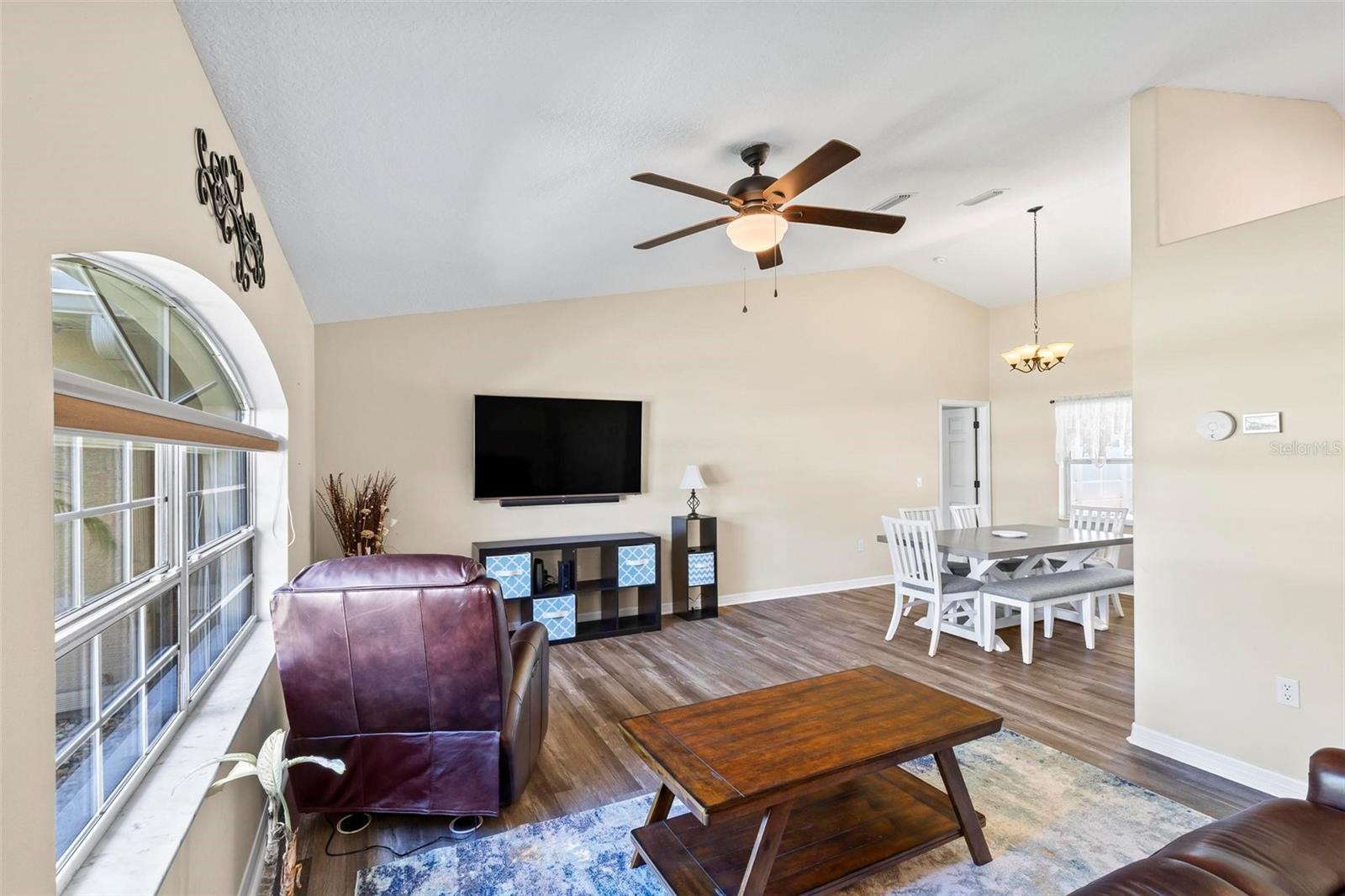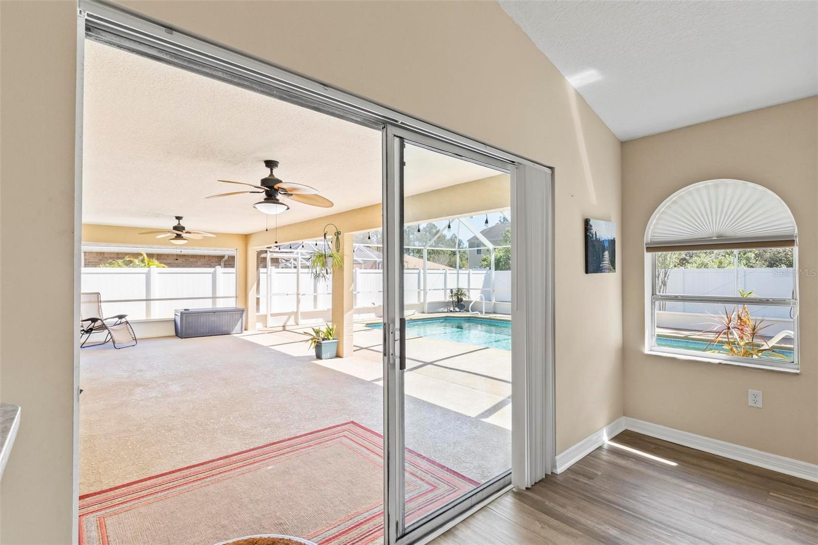 Florida living at it's finest! This pool home with a tile roof is ready for it's new family. It has a split floor plan with the primary bedroom and ensuite on one side and the other 2 bedrooms and bath on the other side. There is a living room and dining area along with a kitchen nook and family room area. The kitchen separates these spaces. Beautiful flooring, niches, vaulted ceiling, curved windows, sliding glass doors heading out to the pool and lanai from the family room and the primary bedroom, stainless steel appliances, solid surface counter tops, double sinks in the primary bath, 2 closets in the primary bedroom with one as a walk-in closet, a tiled walk-in shower in the primary bath, the amazing salt water pool is solar heated with a screened lanai, the yard is beautifully landscaped, and much more! Call to see this home soon. It could be what you have been looking for!