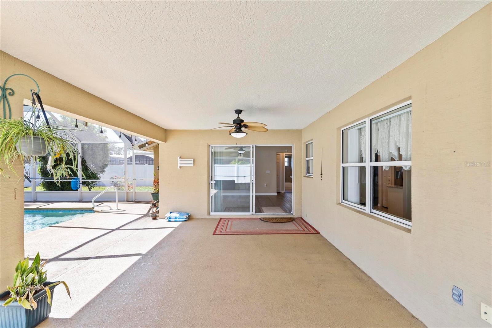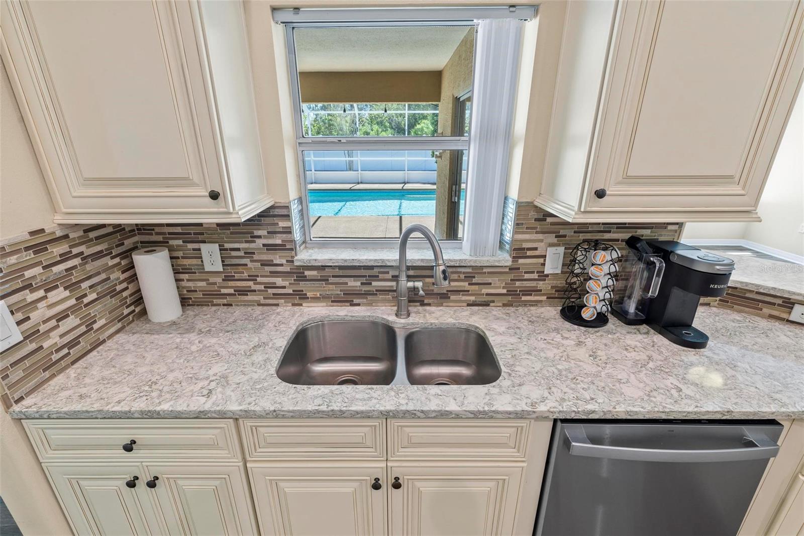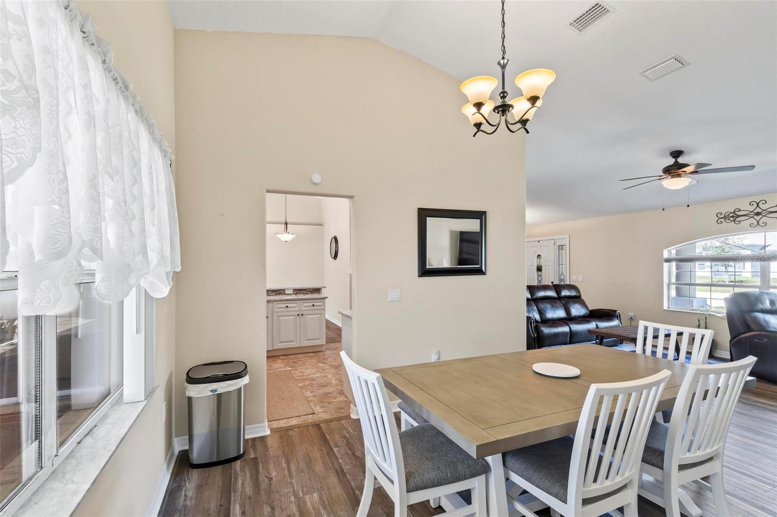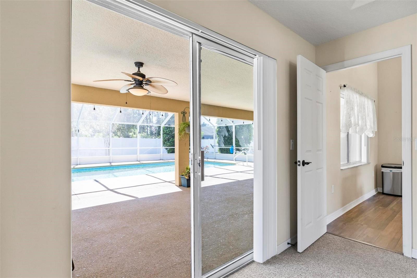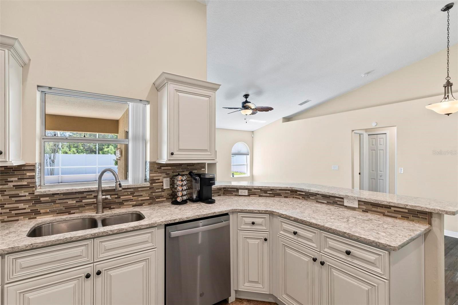 Florida living at it's finest! This pool home with a tile roof is ready for it's new family. It has a split floor plan with the primary bedroom and ensuite on one side and the other 2 bedrooms and bath on the other side. There is a living room and dining area along with a kitchen nook and family room area. The kitchen separates these spaces. Beautiful flooring, niches, vaulted ceiling, curved windows, sliding glass doors heading out to the pool and lanai from the family room and the primary bedroom, stainless steel appliances, solid surface counter tops, double sinks in the primary bath, 2 closets in the primary bedroom with one as a walk-in closet, a tiled walk-in shower in the primary bath, the amazing salt water pool is solar heated with a screened lanai, the yard is beautifully landscaped, and much more! Call to see this home soon. It could be what you have been looking for!