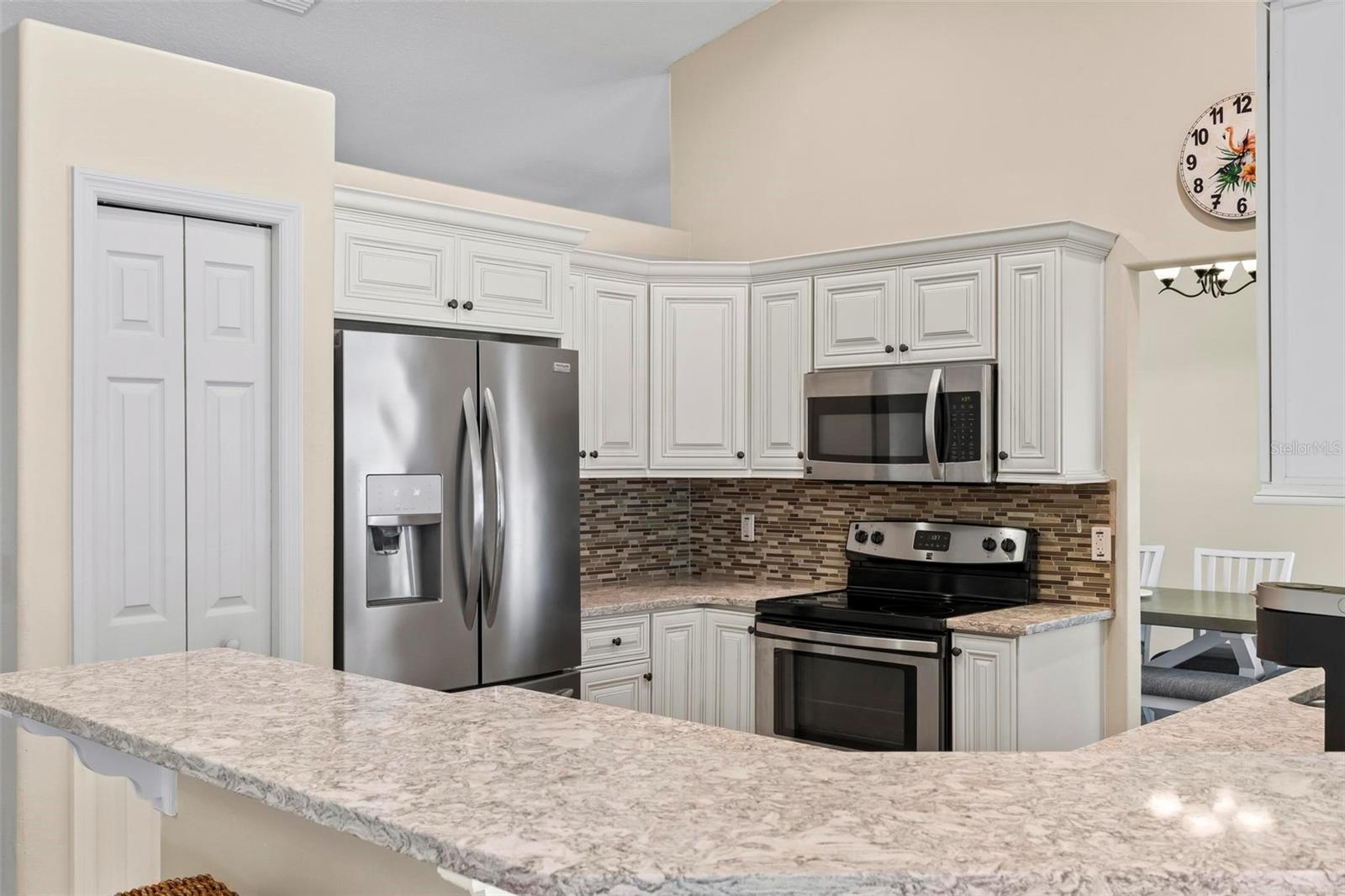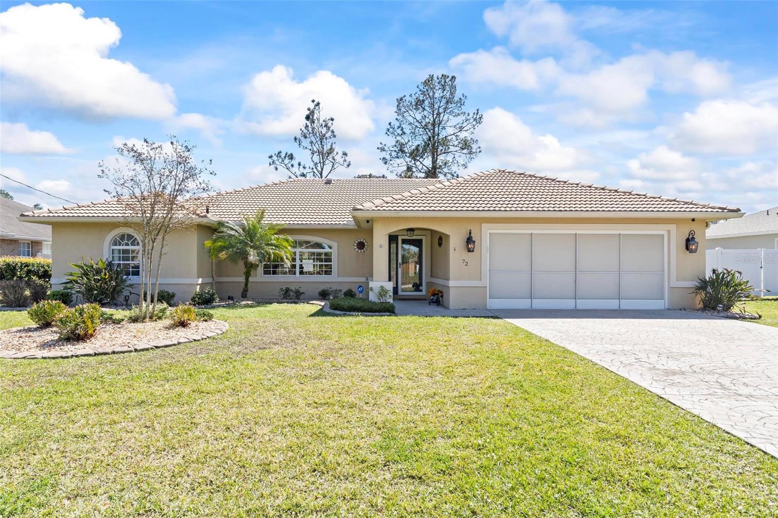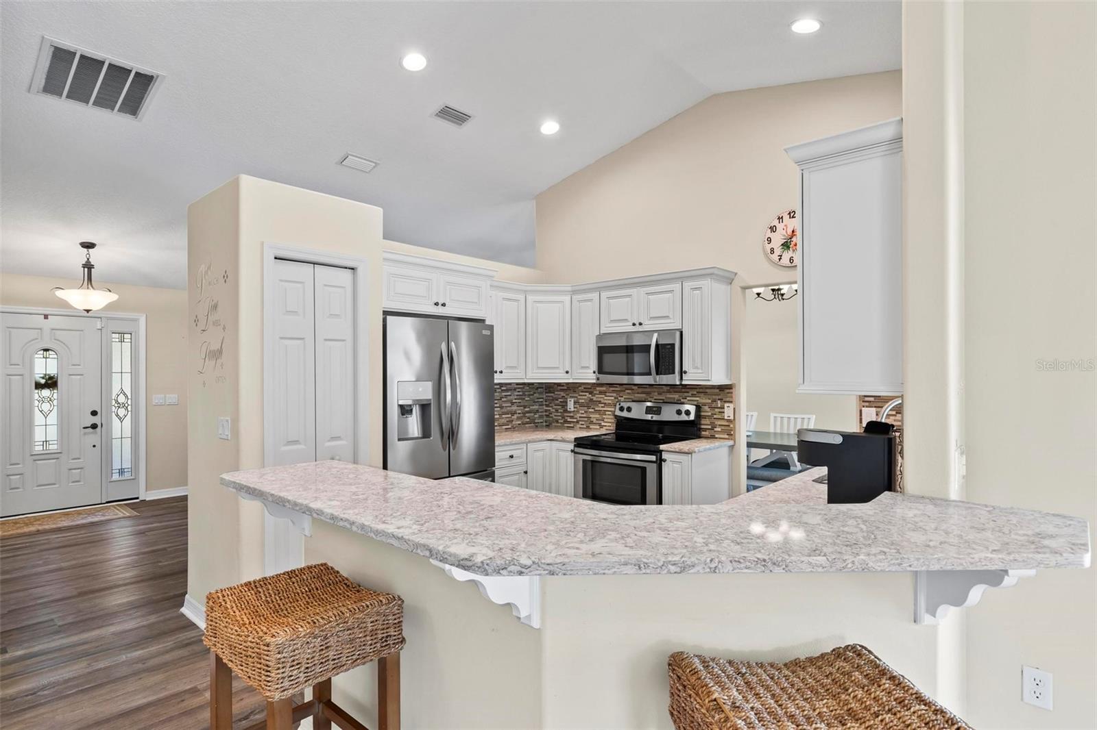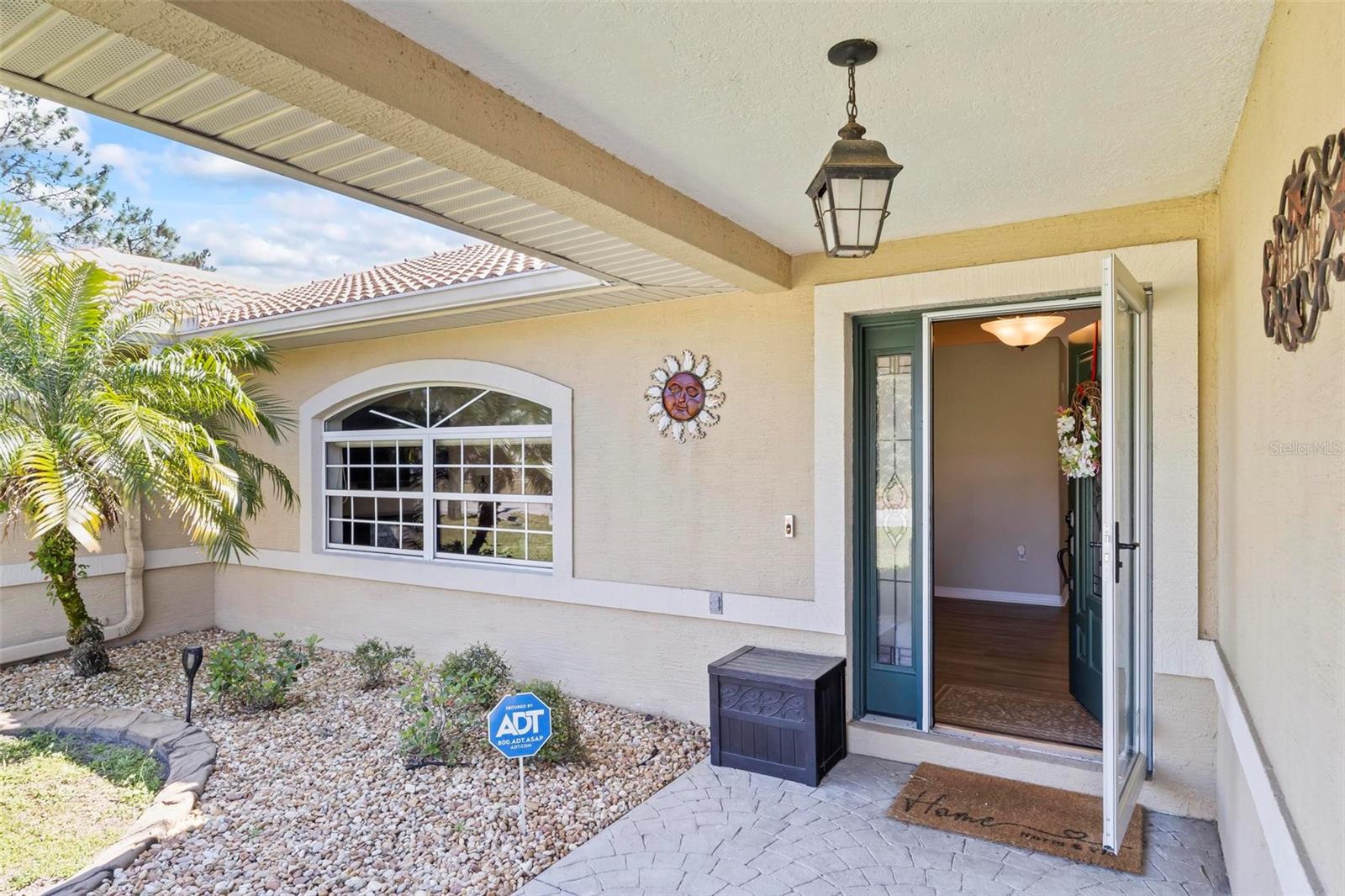 Florida living at it's finest! This pool home with a tile roof is ready for it's new family. It has a split floor plan with the primary bedroom and ensuite on one side and the other 2 bedrooms and bath on the other side. There is a living room and dining area along with a kitchen nook and family room area. The kitchen separates these spaces. Beautiful flooring, niches, vaulted ceiling, curved windows, sliding glass doors heading out to the pool and lanai from the family room and the primary bedroom, stainless steel appliances, solid surface counter tops, double sinks in the primary bath, 2 closets in the primary bedroom with one as a walk-in closet, a tiled walk-in shower in the primary bath, the amazing salt water pool is solar heated with a screened lanai, the yard is beautifully landscaped, and much more! Call to see this home soon. It could be what you have been looking for!