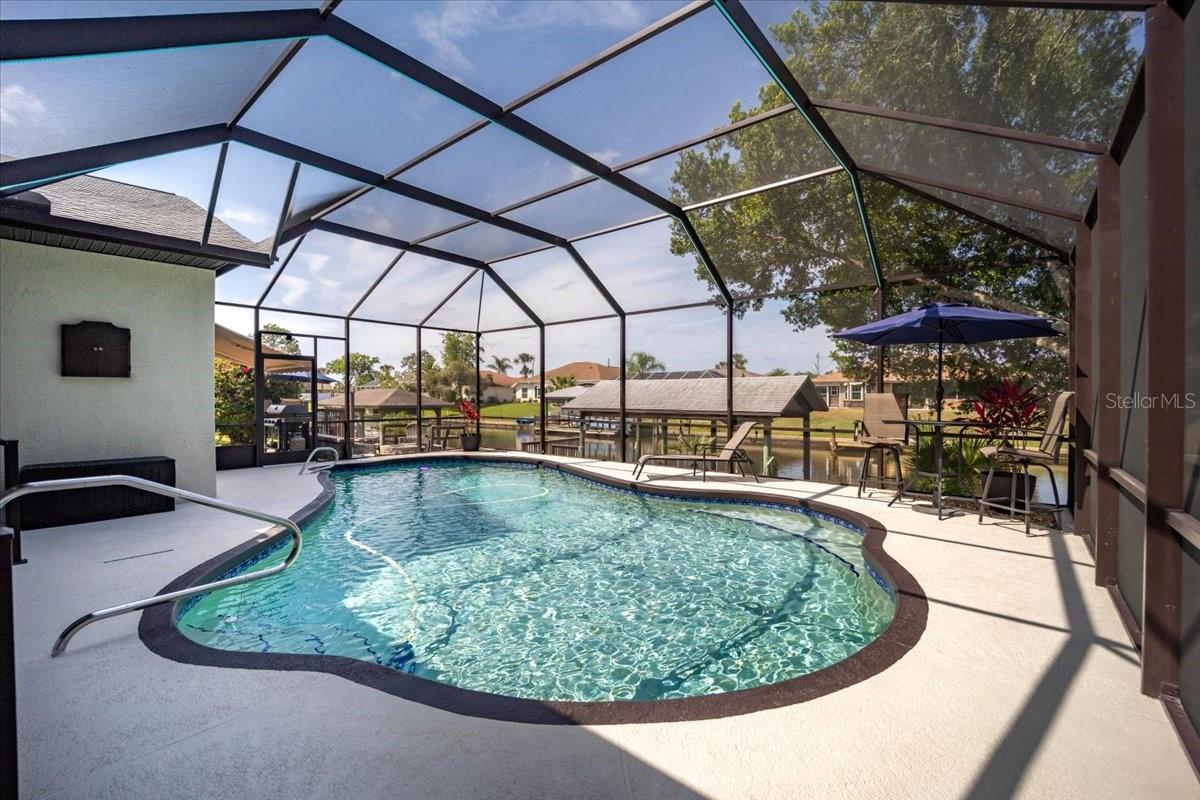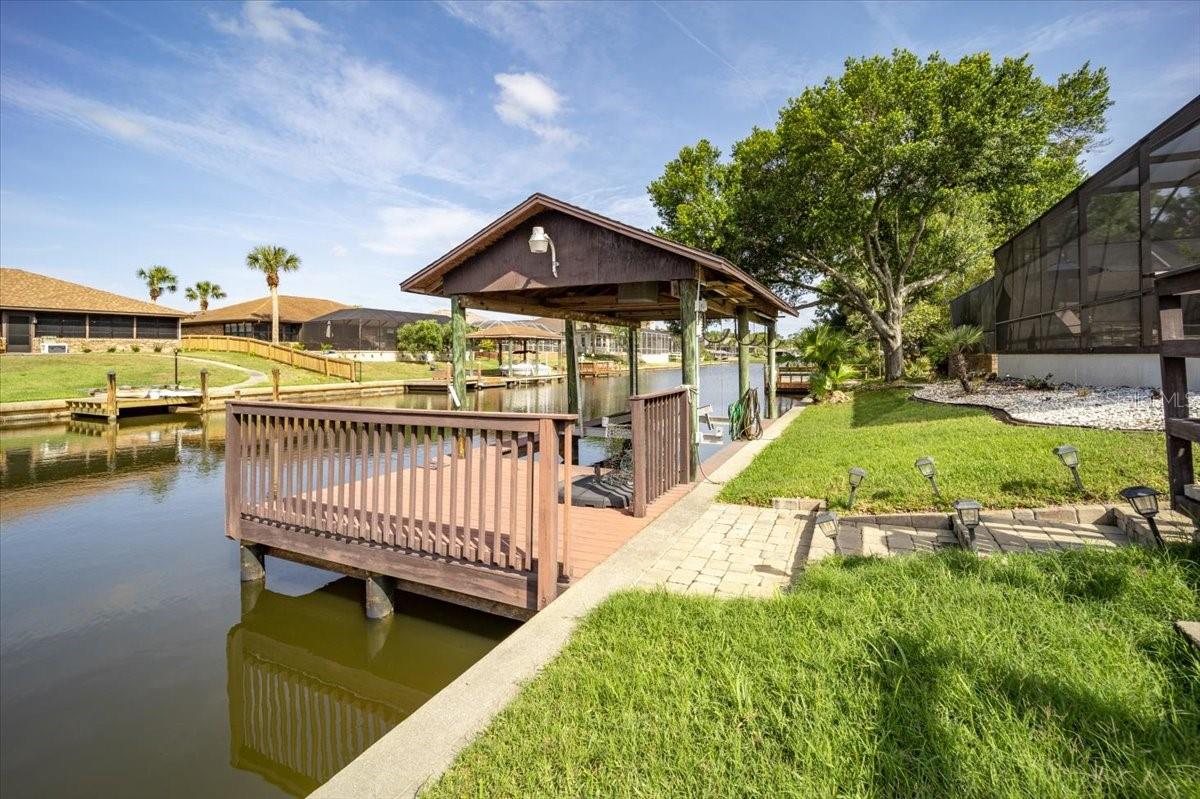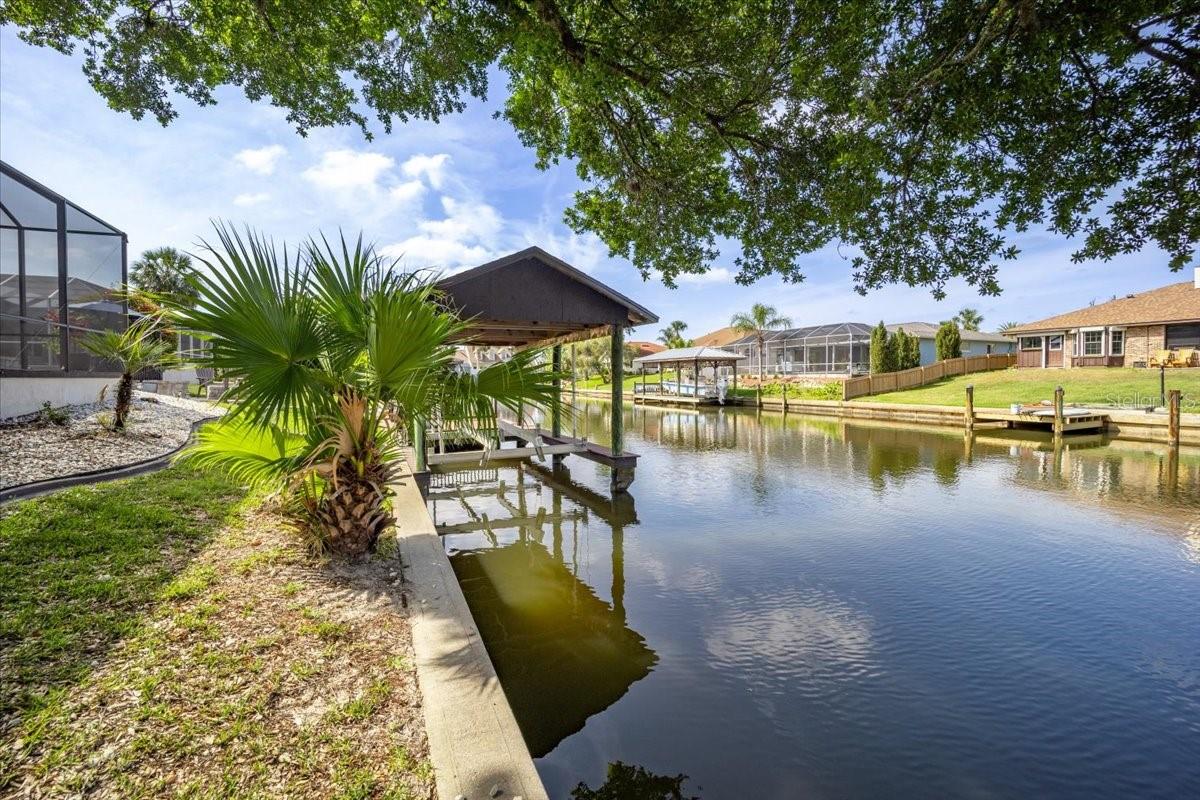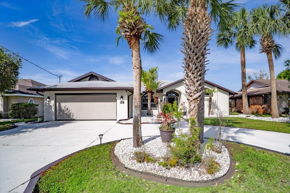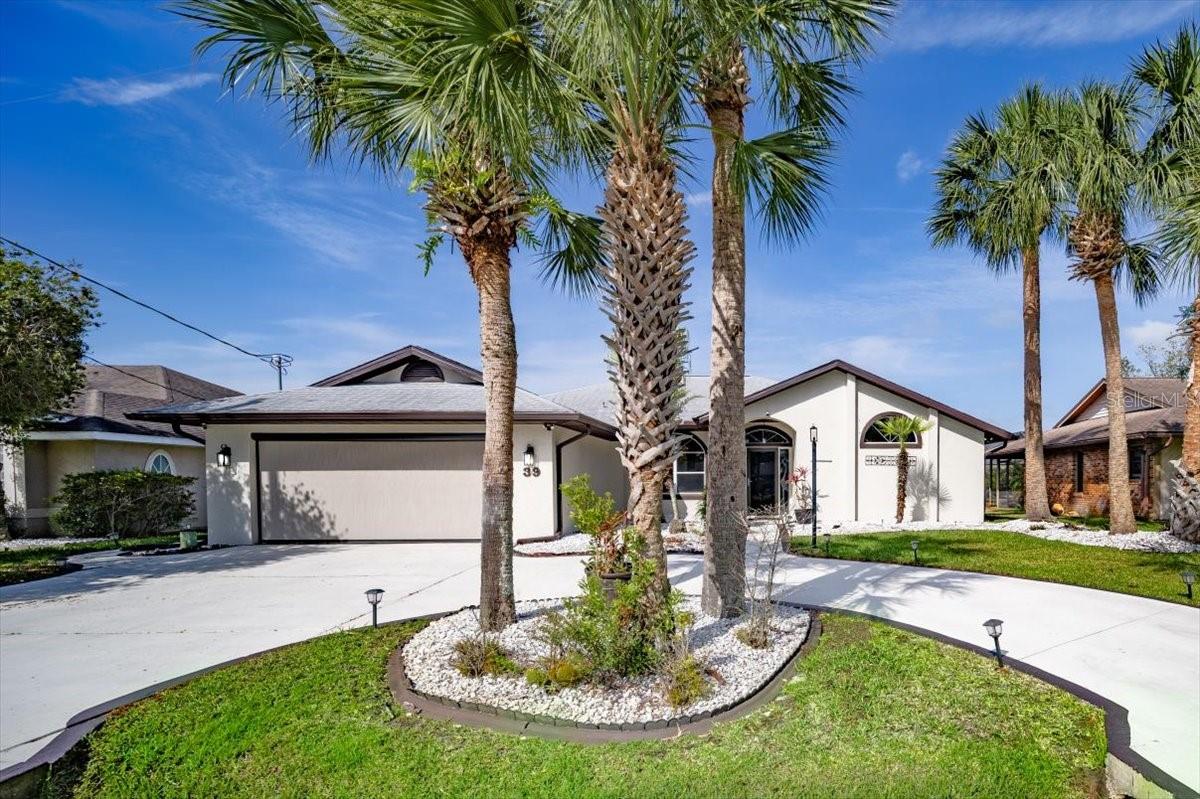 Live the Waterfront Lifestyle You've Been Dreaming Of! Welcome to your own slice of paradise on the saltwater canal—where boating, beach days, and backyard entertaining come together in one spectacular move-in ready home. Just a short ride to the Intracoastal Waterway and only ten minutes from the beach, this stunning 3-bedroom, 2.5-bath concrete block home offers over 2,000 square feet of upgraded coastal luxury in a no HOA, no CDD neighborhood where short-term rentals are allowed. Step outside and fall in love with the resort-style backyard, featuring a 10,000-pound boat lift with Trex decking, a sparkling saltwater pool heated with gas, and a gorgeous paver patio with a fire pit that’s perfect for evening gatherings. The fully equipped granite summer kitchen—complete with a dedicated pool bath—makes entertaining effortless, while the electric awning and custom exterior lighting create the perfect setting for day or night relaxation. Inside, you'll find an open, airy layout with tray ceilings, luxury vinyl plank flooring, and a designer kitchen that boasts quartz countertops, stainless steel appliances, and a double oven. The owner's suite is a true retreat, offering a jetted tub, a walk-in shower, and dual sinks for comfort and convenience. An additional en-suite bedroom provides flexibility for guests or family, and the spacious indoor laundry room with sink and storage makes everyday living easy. This home is packed with upgrades, including a whole-house generator powered by a 200-gallon gas tank, a new A/C system installed in 2020, and a roof from 2016. A massive circular driveway adds both charm and convenience, offering plenty of parking for guests or toys. Whether you're seeking a full-time residence, a vacation escape, or an investment opportunity, this home delivers luxury, location, and lifestyle . Schedule your private showing today—because waterfront living like this won’t last long! Possibly an Assumable VA Loan at 2.375%