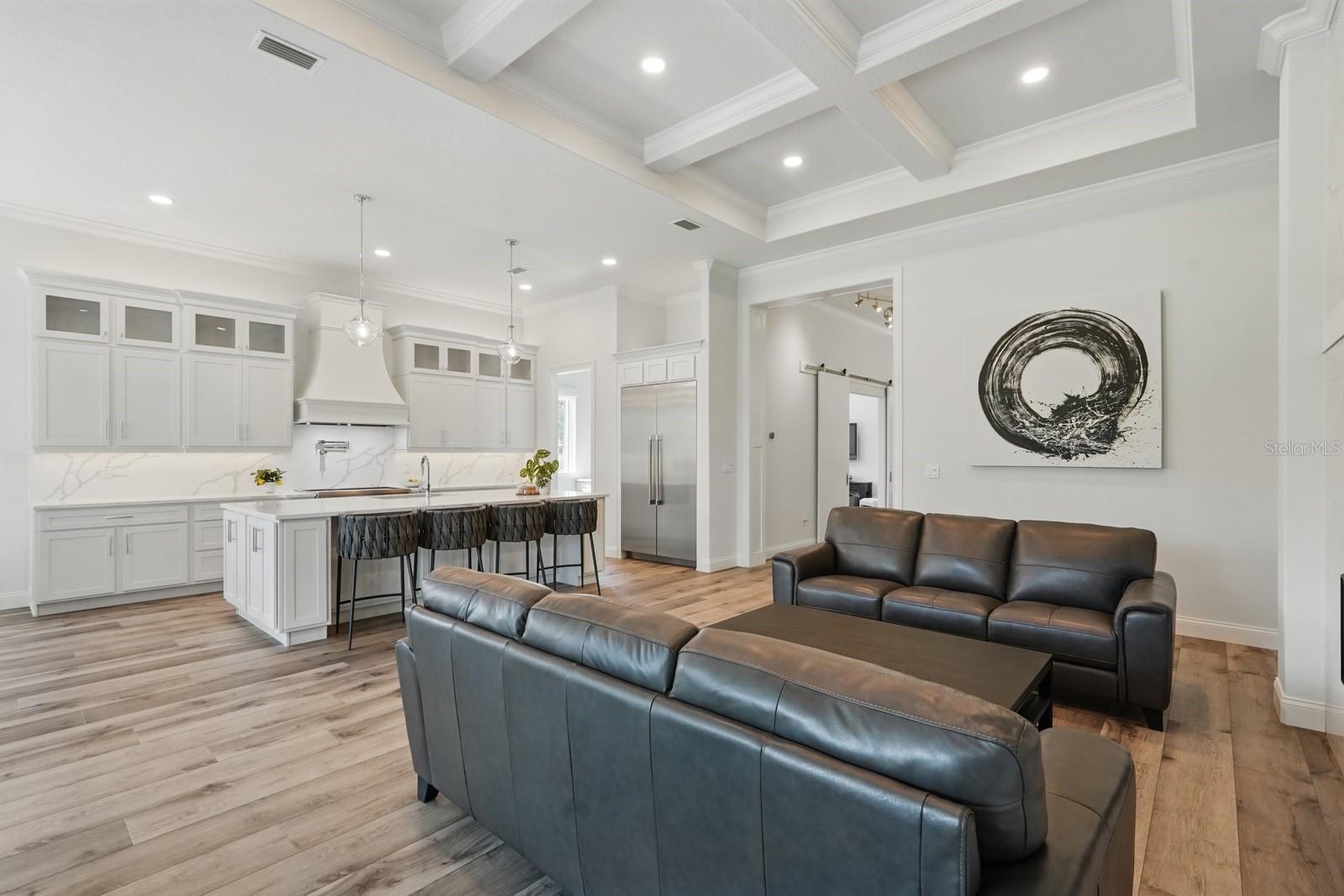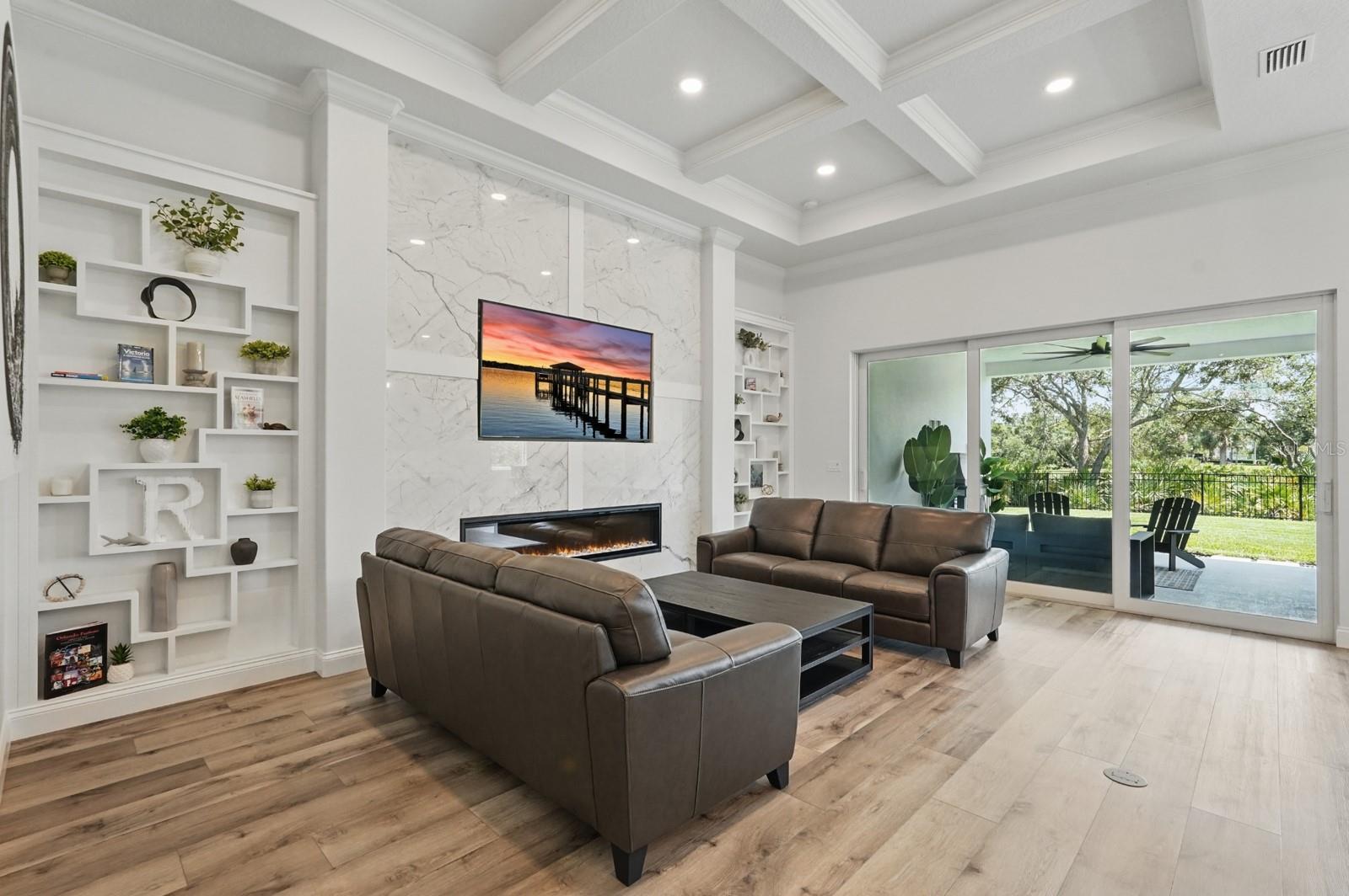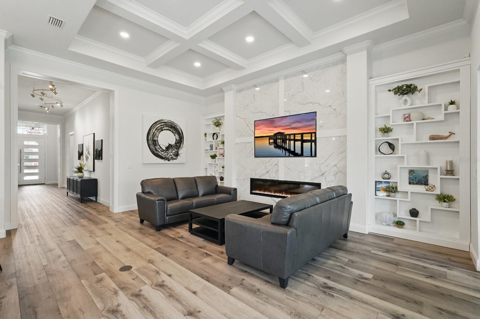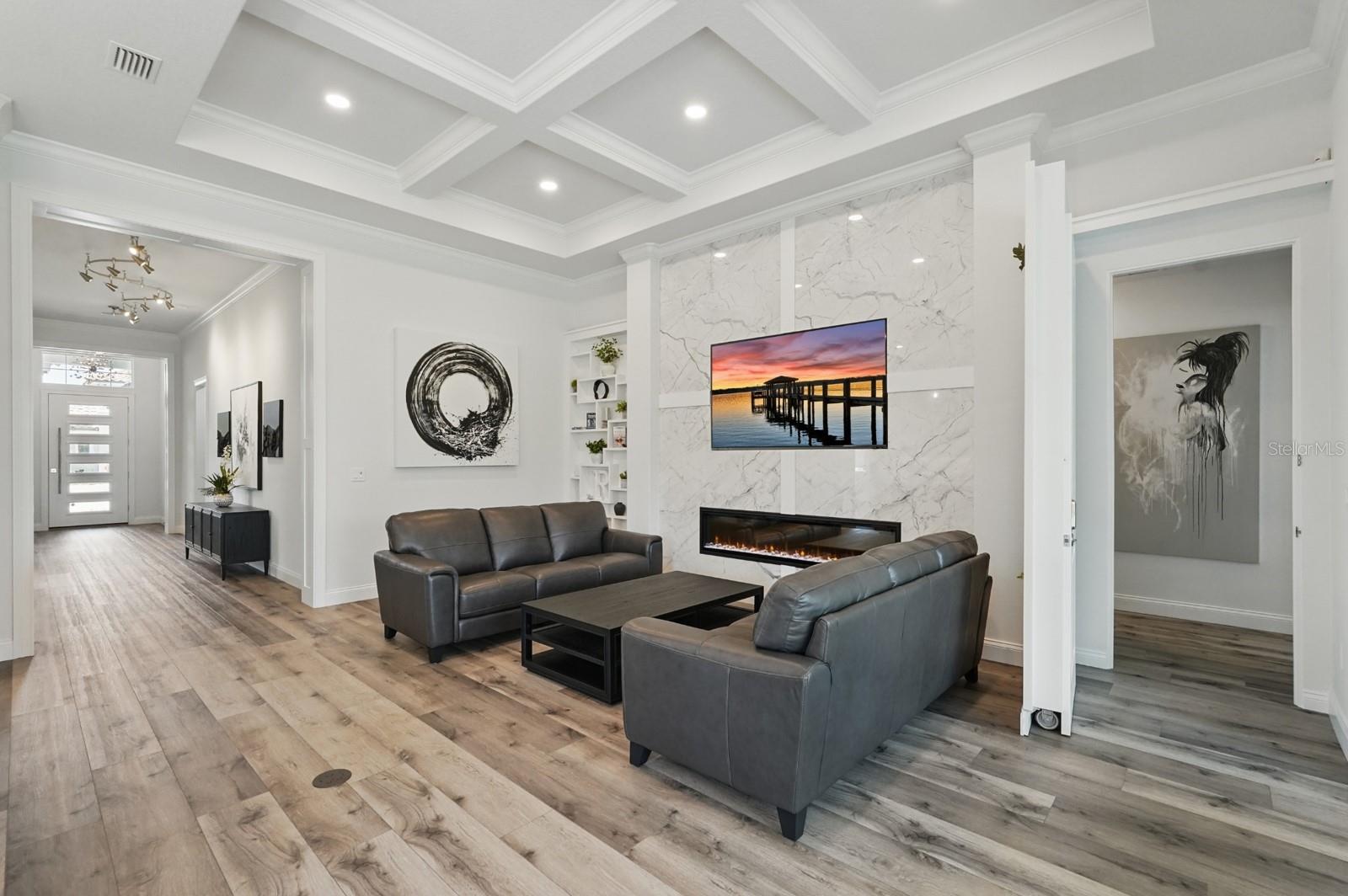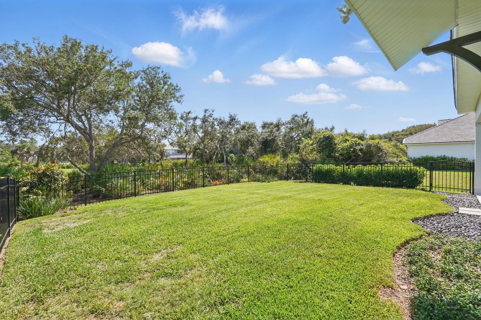 This is the one you've been waiting for! Welcome to 17 Kingfisher Lane, a breathtaking single-story home that combines modern sophistication with coastal charm, just steps from the beach! This coastal sanctuary offers stylish contemporary design features and views of the famous Jack Nicklaus Signature Ocean Course, less than 1/2 of a mile from the ocean. Built in 2023, this pristine home is practically brand-new, and offers 3 spacious bedrooms plus a dedicated office across 2,438 luxurious sq. ft. under air. Step inside through the striking front door and you'll be greeted by soaring 12-foot ceilings, elegant crown molding, and luxury vinyl plank flooring throughout. Natural light fills the open-concept living area thanks to large impact-glass windows and an 8-foot, three-panel sliding door that seamlessly connects the interior to the outdoor living space. The chef’s kitchen is a true showpiece, featuring custom soft-close cabinetry, quartz countertops and backsplash, a large island with four-sided storage, and high-end stainless-steel appliances - the refrigerator, dishwasher and microwave are Thermador and the range/oven is Ilvey. A stylish open pantry with floating shelves and a microwave station adds both functionality and design appeal. The family room centers around a dramatic linear fireplace, beautifully framed in 48” porcelain slabs with a recessed TV. Flanking the fireplace are two custom-built bookcases made of exotic Benack wood imported from Brazil—one of which cleverly conceals a hidden passage to the serene primary suite! The master bedroom is a private retreat with a spa-inspired ensuite bathroom showcasing modern tile floors, a double vanity with quartz counters, sconce lighting, a large walk-in shower, and a private water closet. Additional highlights of the home include a beautiful office space, plush guest suite with ensuite bathroom, and a versatile bonus room that could be utilized as a den or 3rd bedroom. Situated along the 3rd hole of the renowned Ocean Course, the home offers fairway views from its expansive covered lanai. The spacious fenced-in backyard has ample room for the young ones or furry friends. Or design your own pool and create the oasis of your dreams. Outdoor fireplace and the potential for a full summer kitchen make this the perfect place for entertaining friends and family. Located just 0.4 miles from the ocean, in the prestigious gated community of Ocean Hammock, this home allows you to enjoy daily ocean breezes and the soothing sound of waves. Walk to the beach or take a short trip to nearby Hammock Beach Resort. Explore Florida’s top state parks, trails, and marinas, or enjoy the convenience of being just 35 minutes to St. Augustine and 30 minutes to Daytona Beach. This jaw-dropping one-of-a-kind home won't last- don't delay!