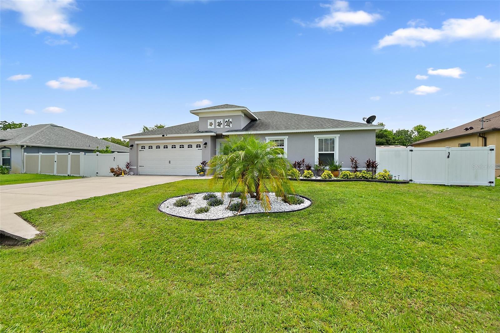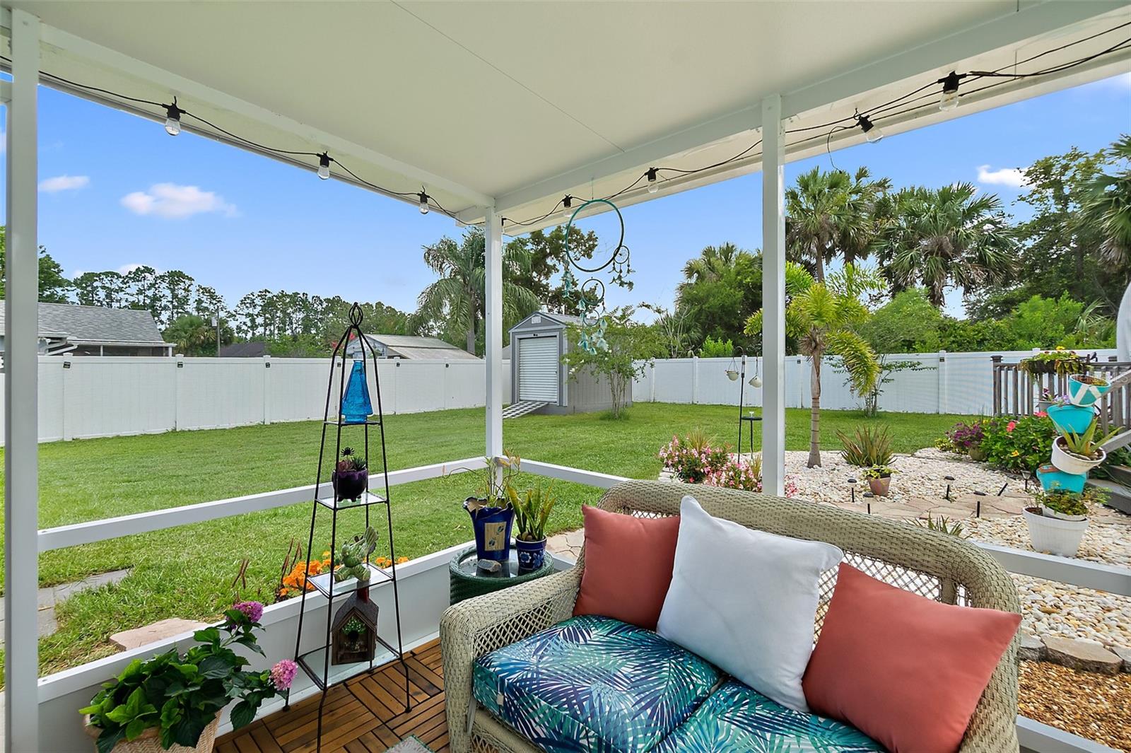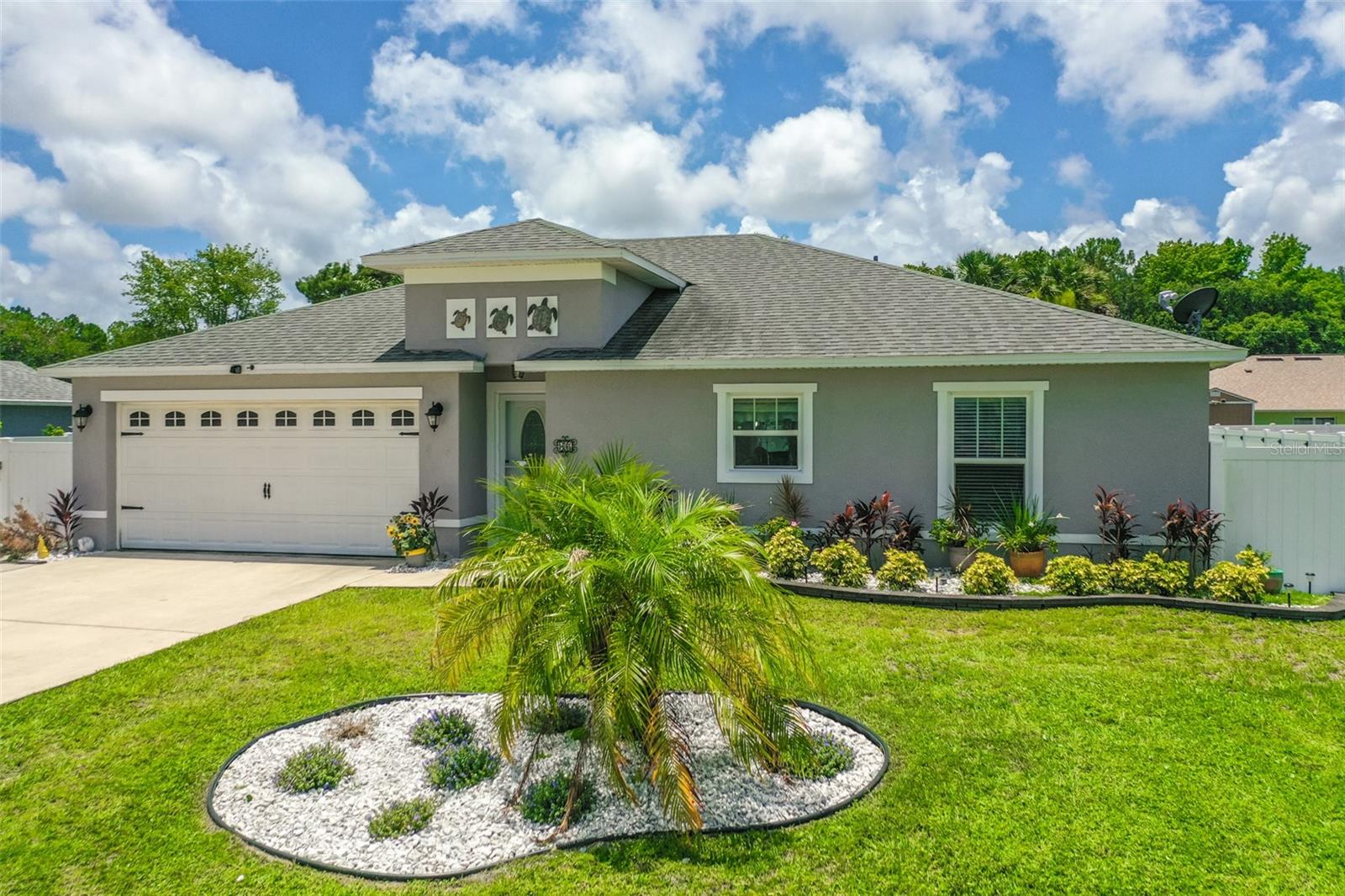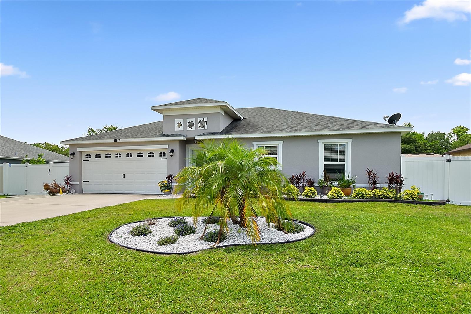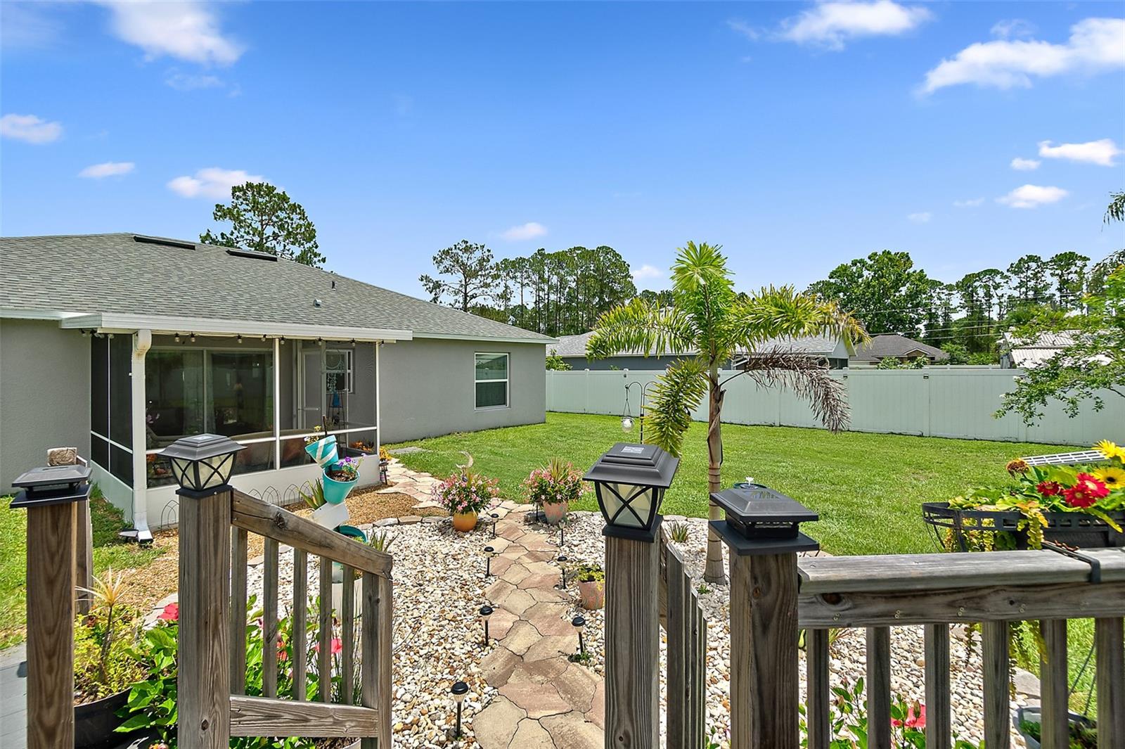MOVE-IN READY! MUST SEE!!! Built in 2020! This spacious preferred concrete block built 3-bedroom, 2-bath, 2-car garage house showcases an open floor plan designed for modern living, seamlessly incorporating outside, starting with customized Florida room, transitioning to whimsical backyard with all weather elevated lanai, and solar lighting, making the magic come alive in the evening! Generously sized driveway - framed by beautiful and well manicured lawn. All of the multitude of plants around the house - emphasized by stamped concrete flower beds borders, and ample no expense spared landscape stones. This home offers the perfect blend of elegance, convenience, and ease of maintenance. Luxury wood-alike plank laminate flooring seamlessly spreading throughout the rooms. The cozy foyer starts the story of thoughtful updates by custom split shelving wall, adding style and functionality. Upgraded designer light fixtures in all parts of the house add to its charm and personality. The modern kitchen has tall solid wood classic shaker style cabinets crowned by molding and conveniently highlighted by glossy tile backsplash, anchored by custom luxurious quartz countertops. Deep dual stainless kitchen sink, hiding a garbage disposal. The quartz granite-alike countertop center island offers the stylish breakfast bar, adding more storage. A convenient coffee station is decorated with textured glass and marble interlocking mosaic backsplash adds a lot of storage as well with the same timeless beauty. The sparkling and cheery pendant lights, stainless steel appliances, shiplap ceiling, good size food pantry and convenient rollout stainless shelves in the cabinetry make this kitchen a dream come true. The elegant dining area speaks for itself! Highlighted by the formal uplifting chandelier. The extra wide (8ft) custom made sliding glass doors invite outside to join the open concept living spaces, increasing the airy open feeling! The primary suite offers custom barn doors to the walk-in closet and a deluxe private bathroom, featuring high end quartz countertops with dual sinks and an oversized tiled shower, with a beautiful and special glass enclosure half-door. Designated linen closet adds a touch of comfort. Split bedroom floor plan, provides privacy to the owners, with generously sized two additional bedrooms sharing an easy access to a full bath with an extra closet and the laundry room in the hallway. Enjoy a charming view of the beautiful backyard lounging in a lovely covered back lanai, far from busy roads, making it a peaceful and virtually dust-free experience. Outdoor living is truly exceptional and inviting here because of many flowering and rare nurtured plants! A beautiful deck with stairs is so attractive and nicely decorated. Growing palm will spread its wings shading the seating in the near future! The house is immaculate inside and out. The property is fenced all around with impressive high-quality vinyl. There is a single fence gate on the left side of the house and a double fence gate on the right side. There is a 8x12 lofted shed in the back yard for storage. The screened lanai features a special wooden floor. The house offers easy access to schools, shops, stores, banks, and other amenities. It is close enough to Ind. Trails Sports Complex, Palm Coast Aquatics Center, Planet Fitness. Easy access to Route 1 and I-95. Short ride to the ocean beaches. No HOA. No CDD.