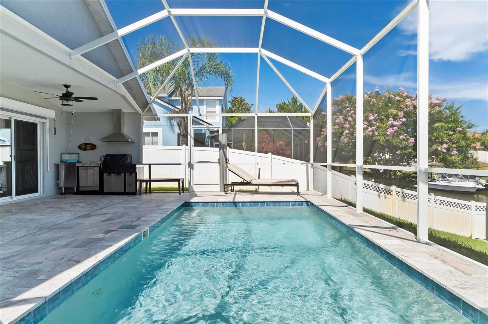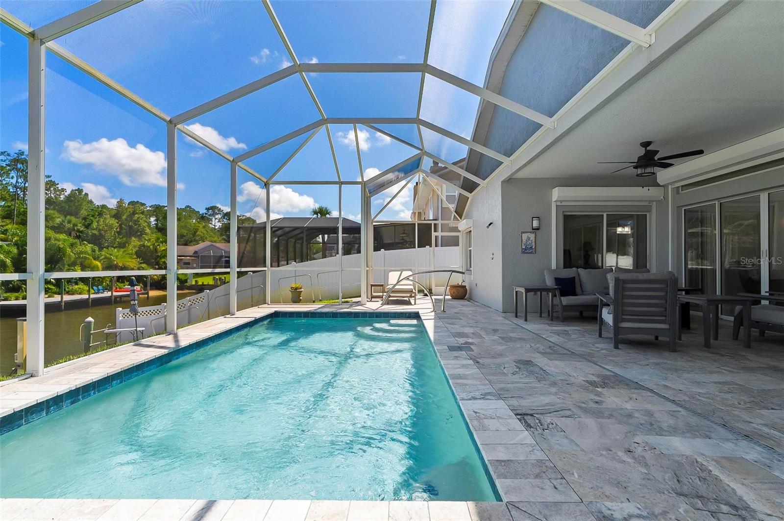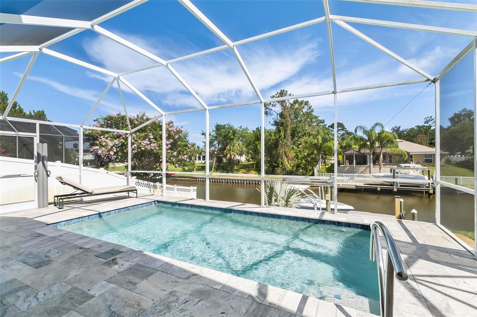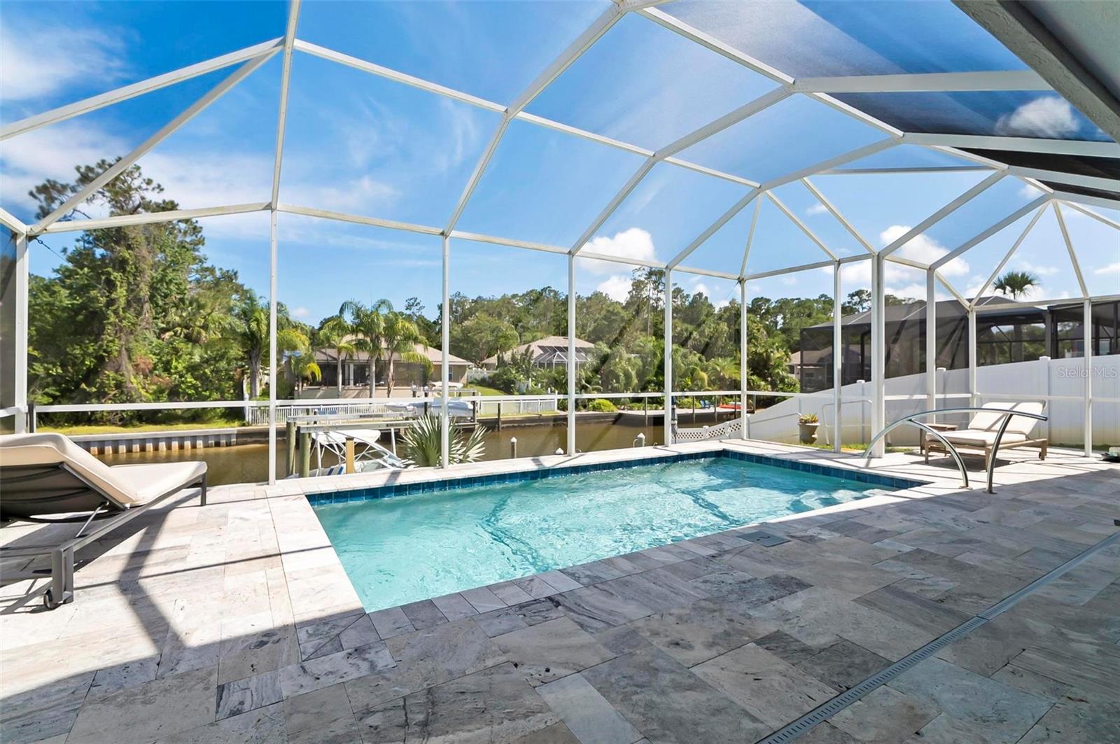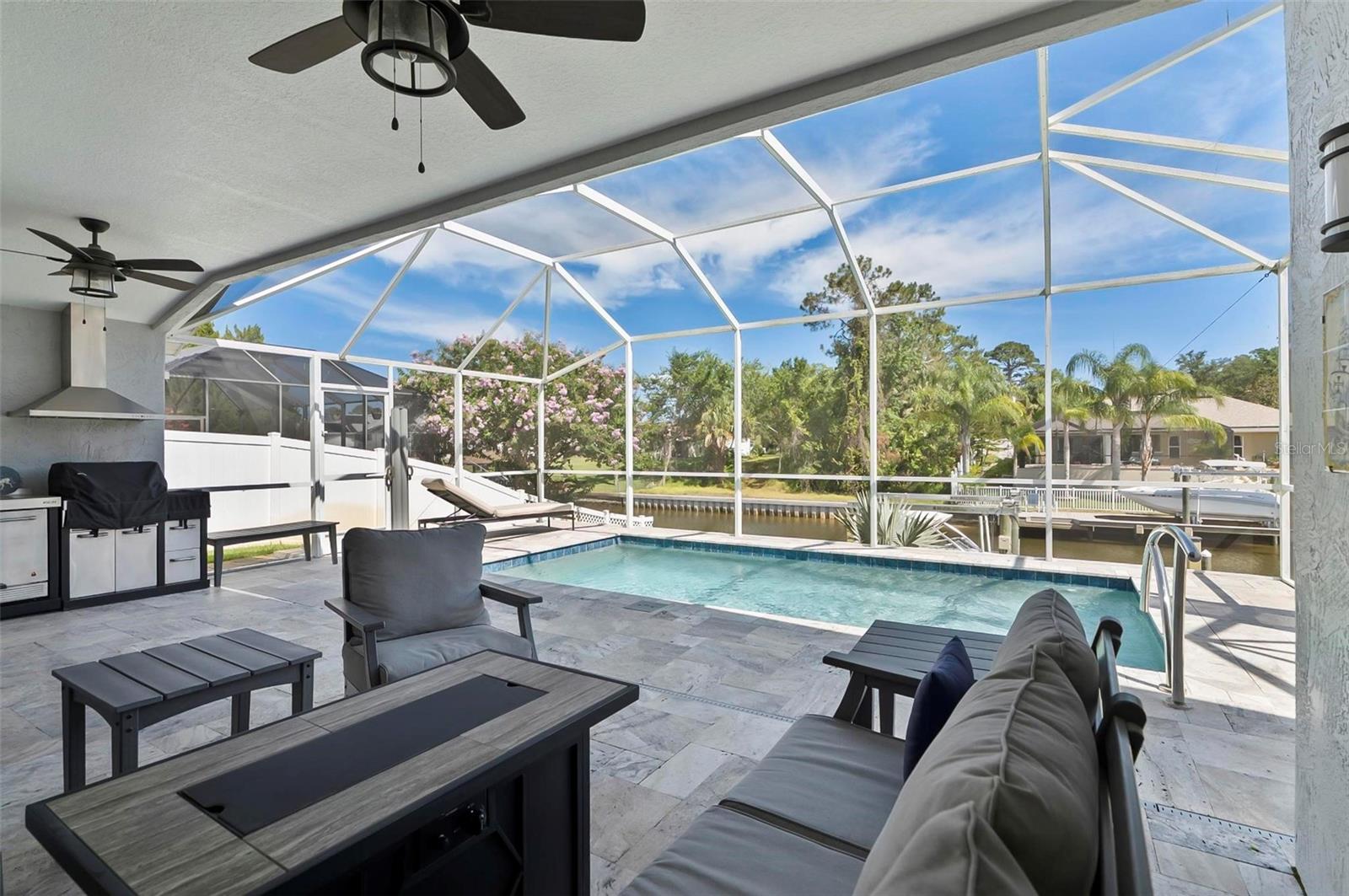 Welcome to this beautifully renovated saltwater canal and pool home, perfectly situated on a quiet cul-de-sac and designed for the ultimate coastal lifestyle. Inside, you’ll find stunning granite countertops with bar seating, sleek new stainless appliances, elegant tile flooring and crown molding throughout. The spacious great room is filled with natural light and features triple sliding doors that open seamlessly to the lanai and pool area that includes stainless steel charbroiled and travertine tile in the pool area—ideal for entertaining or relaxing by the summer kitchen. A brand-new dock includes a 10,000 lb. boat lift and dockside/shore power, making days on the water effortless. After your adventures, rinse off in the outdoor shower. Additional highlights include storm shutters on every window, a newer roof (7 years old), a resurfaced driveway (6 years ago), a new AC unit (2023), and a new sprinkler system (2024). You’ll also love the epoxy-coated garage floor, updated ceiling fans and light fixtures, custom blinds, and a stunning modern electric fireplace with stone surround. This home is impeccably clean and truly move-in ready—there’s nothing left to do but enjoy. Don’t miss this rare opportunity to own a gorgeous canal-front retreat. View the virtual video for more details of this property and surrounding area.