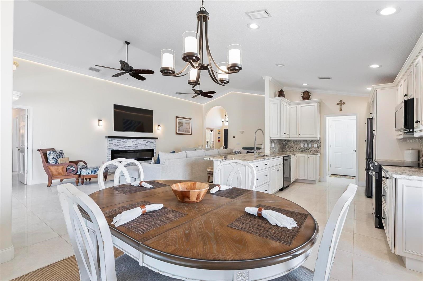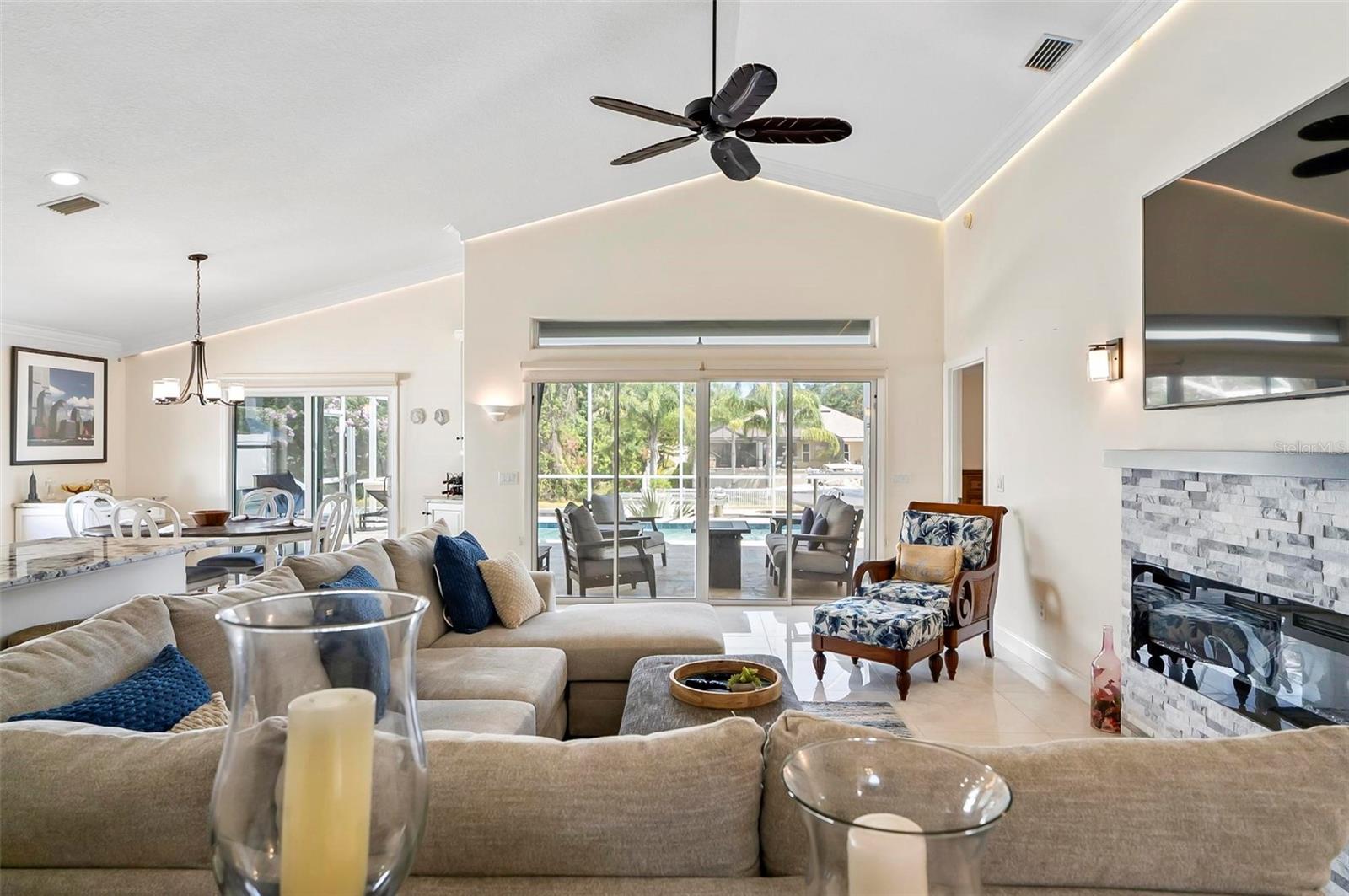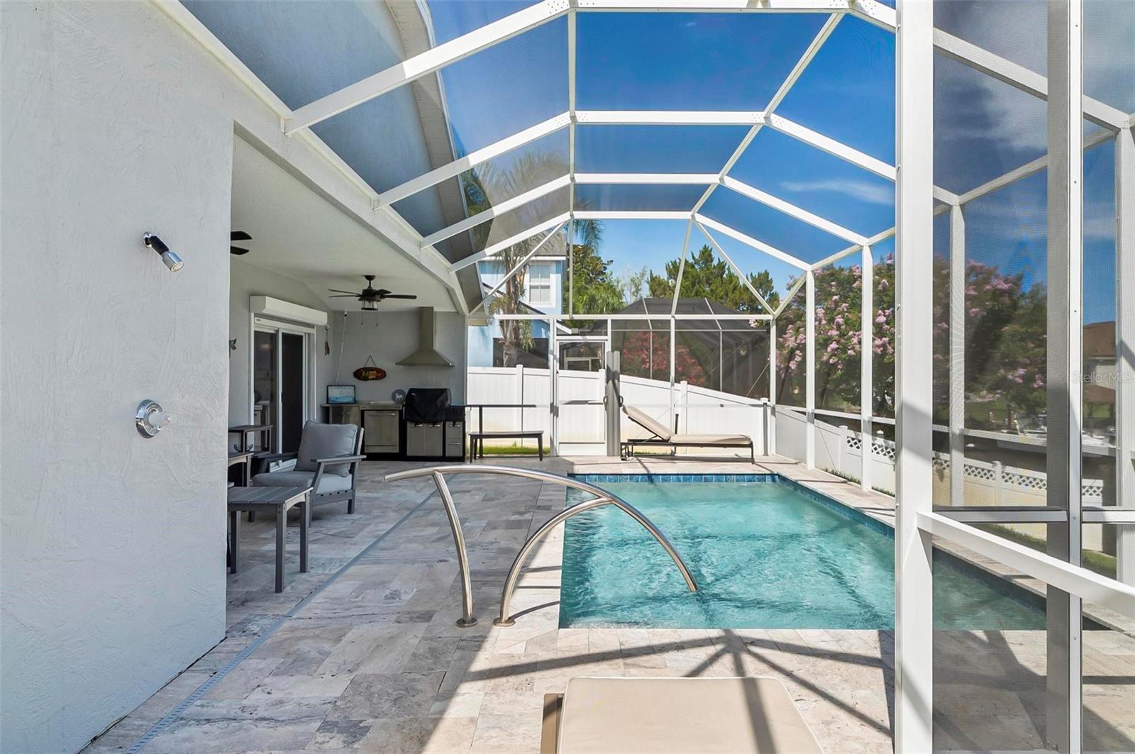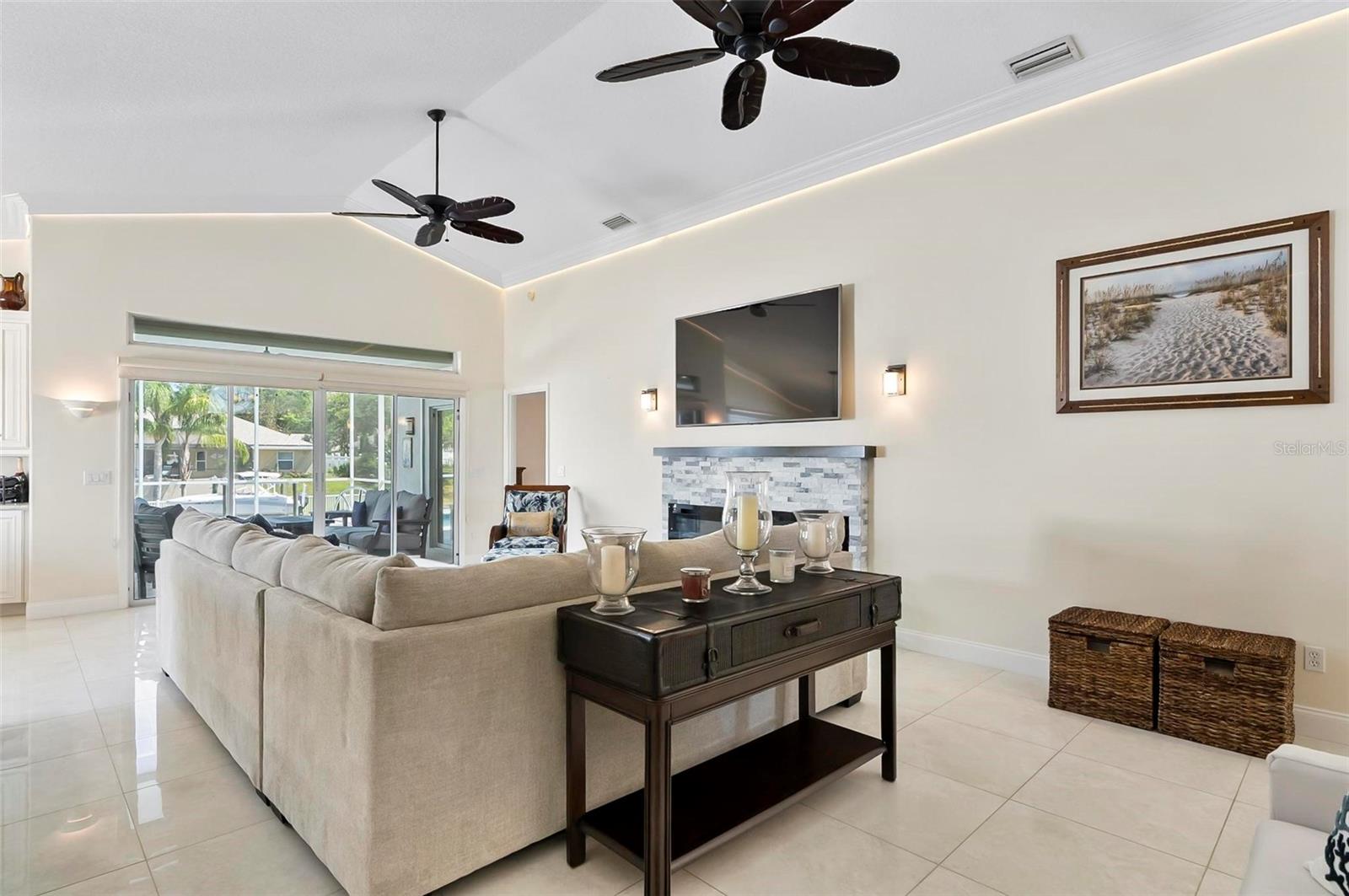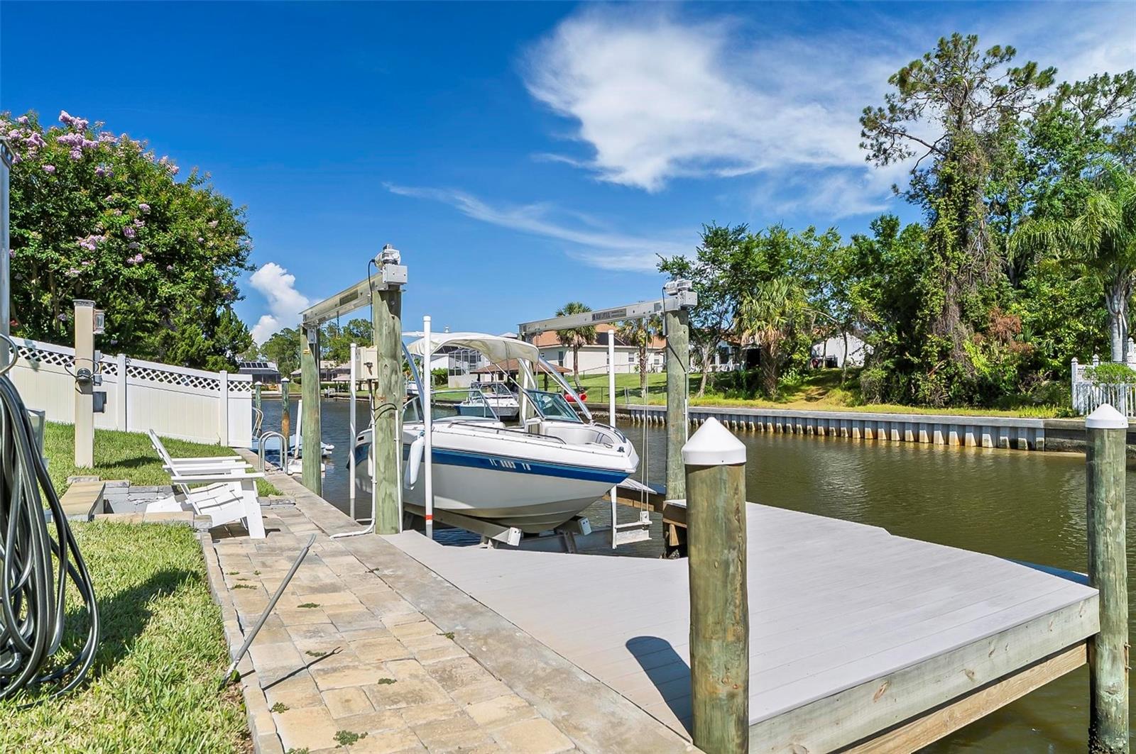 Welcome to this beautifully renovated saltwater canal and pool home, perfectly situated on a quiet cul-de-sac and designed for the ultimate coastal lifestyle. Inside, you’ll find stunning granite countertops with bar seating, sleek new stainless appliances, elegant tile flooring and crown molding throughout. The spacious great room is filled with natural light and features triple sliding doors that open seamlessly to the lanai and pool area that includes stainless steel charbroiled and travertine tile in the pool area—ideal for entertaining or relaxing by the summer kitchen. A brand-new dock includes a 10,000 lb. boat lift and dockside/shore power, making days on the water effortless. After your adventures, rinse off in the outdoor shower. Additional highlights include storm shutters on every window, a newer roof (7 years old), a resurfaced driveway (6 years ago), a new AC unit (2023), and a new sprinkler system (2024). You’ll also love the epoxy-coated garage floor, updated ceiling fans and light fixtures, custom blinds, and a stunning modern electric fireplace with stone surround. This home is impeccably clean and truly move-in ready—there’s nothing left to do but enjoy. Don’t miss this rare opportunity to own a gorgeous canal-front retreat. View the virtual video for more details of this property and surrounding area.