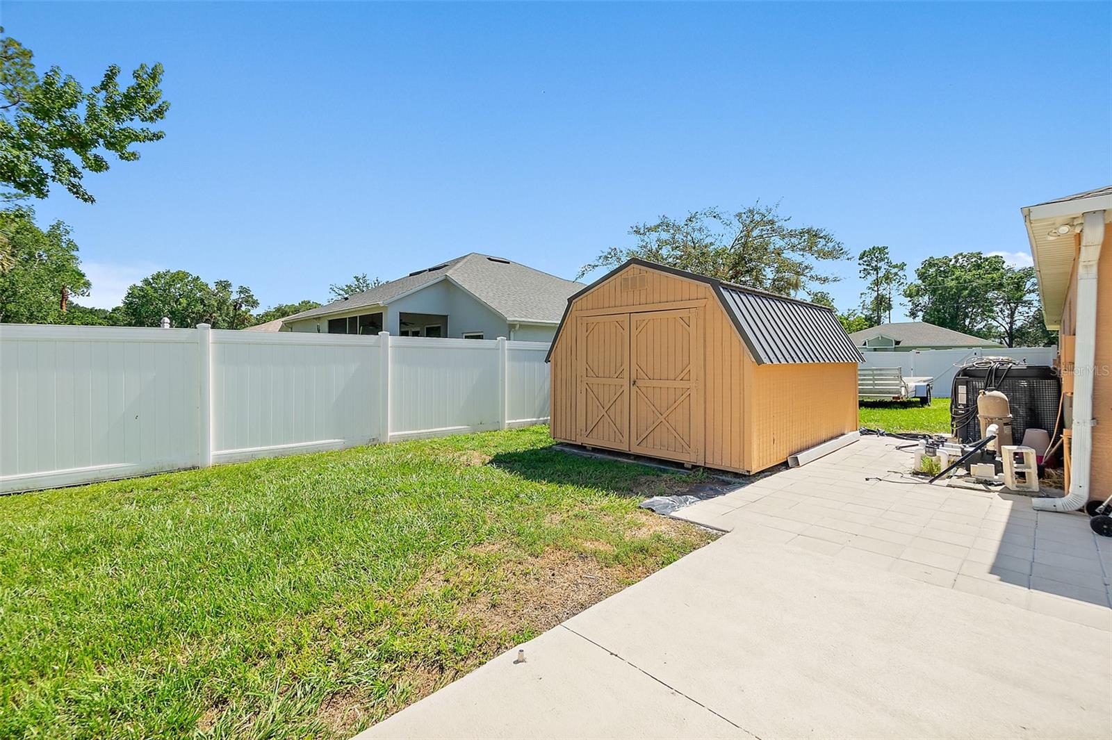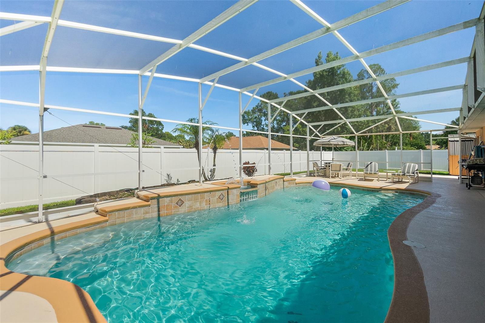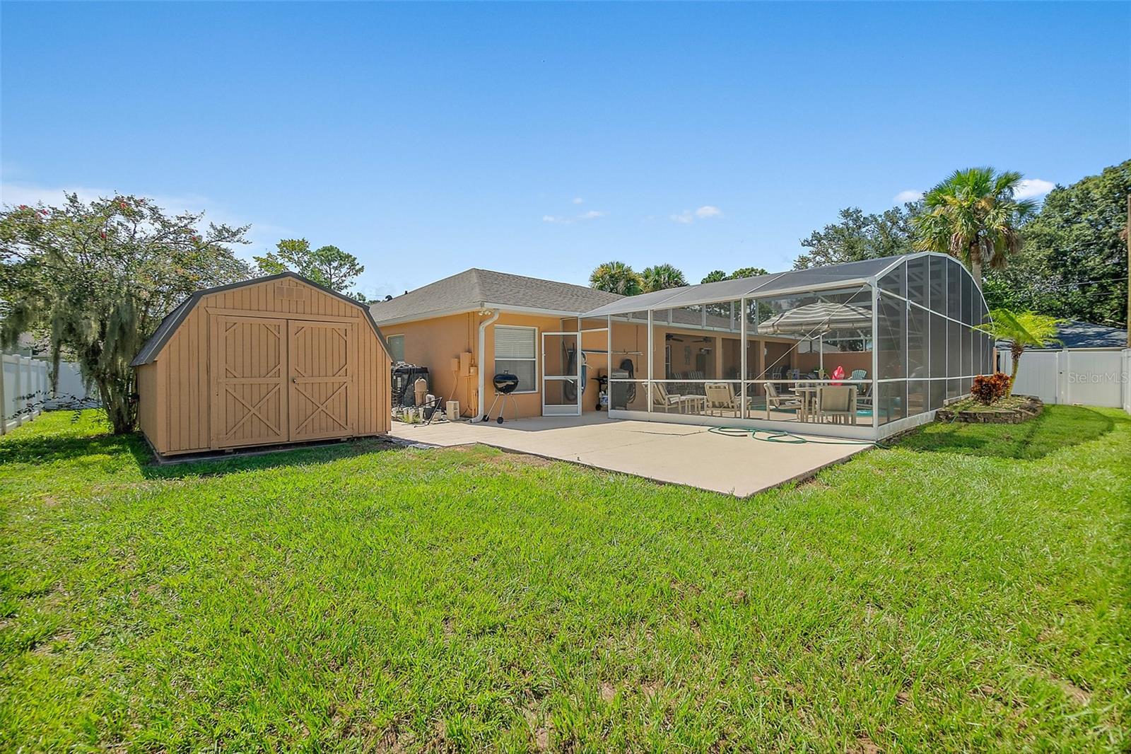 Welcome to this beautifully updated 2,200 square-foot home situated on a desirable CORNER LOT. This property offers the perfect blend of comfort, style, and outdoor living. Step Inside, you’ll find a bright and open floor plan with generous living spaces. Features laminate and tile floors in the main areas, carpet in the bedrooms, New fixtures, New thermostat, A/C 2018, Roof 2021 and plenty of natural light throughout. Outside features your own private oasis featuring a LARGE screened-in pool enclosure—ideal for entertaining, relaxing, or enjoying year-round Florida living. The yard is fully fenced in with PVC fencing. The saltwater pool has a BRAND NEW salt system. The oversized yard offers endless possibilities, from gardening to play areas or even future expansion. The exterior also offers a large shed, a privacy wall pool side, paver patio outside the screen room, a child gate for the pool and patio access from the primary bedroom, living room and interior bathroom. Extras's include: a walk-in shower. Exterior and interior has been FRESHLY PAINTED. Termite bond that is transferable to the new owners. Bathroom access to the pool area. With its prime location, updated features, and impressive outdoor space, this home is a rare find. Schedule your showing today!