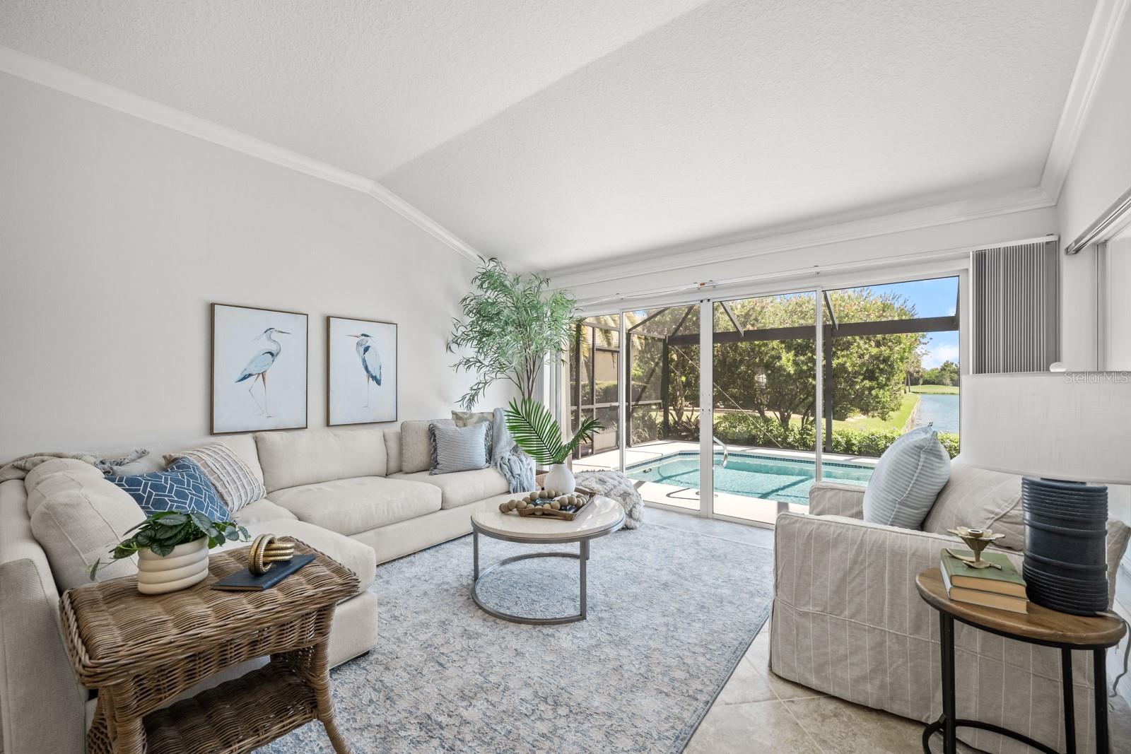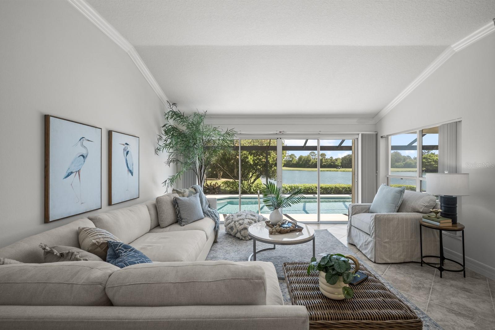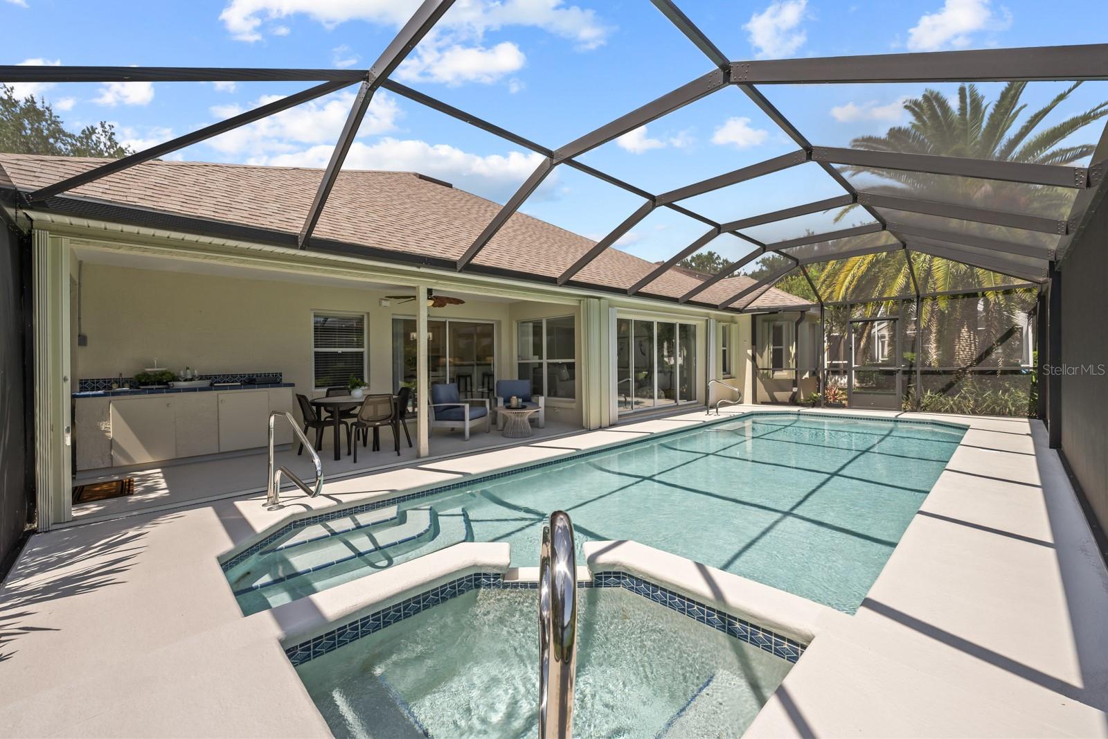 The great room beckons with a view overlooking a 12’ x 35’ sparkling pool and a custom "picture- window-pool-screen” view of the Grand Haven 11th Fairway Pond. Nestled, as it is, in the pond’s corner, the home’s view widens to an over-1000’ panorama of the far shore. The distance protects your privacy, and with a pair of binoculars you’ll often see a sunbathing gator or osprey. Because the covered lanai faces east, the outside living room enjoys perpetual shade. Inside, this home has been meticulously cared for and conveys warmth and invitation. The kitchen’s recent updates to its cabinetry, countertops, and appliances – make it the focal point to the home. The home is hurricane hardened, sporting cinder-block construction, inverter electric generator, corrugated-steel shutters, and a hurricane curtain system that encloses the pool lanai. The widened garage parks two cars and adds an extra 6’x17’ feet of storage. This rare combination of postcard-worthy views and tranquility awaits!