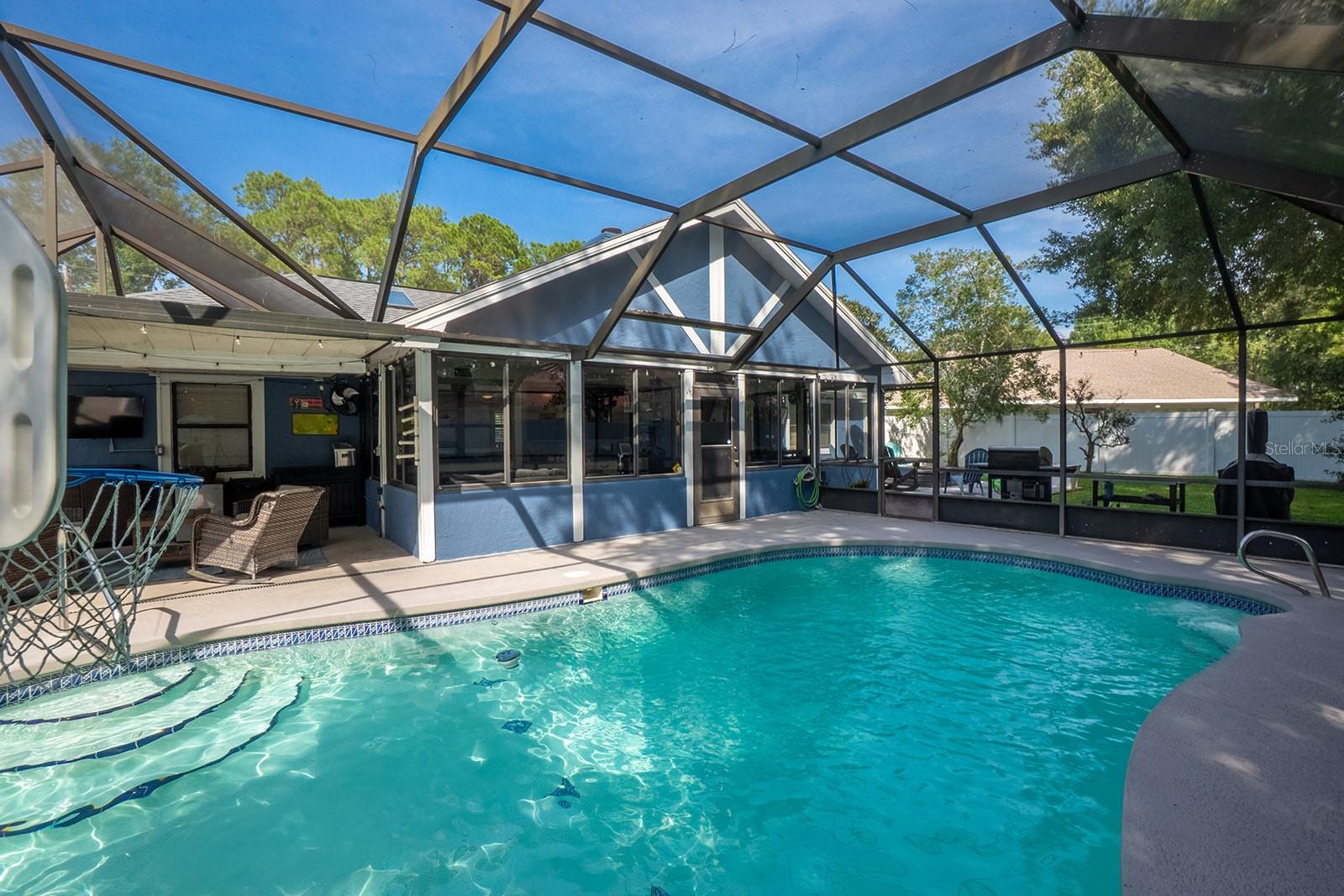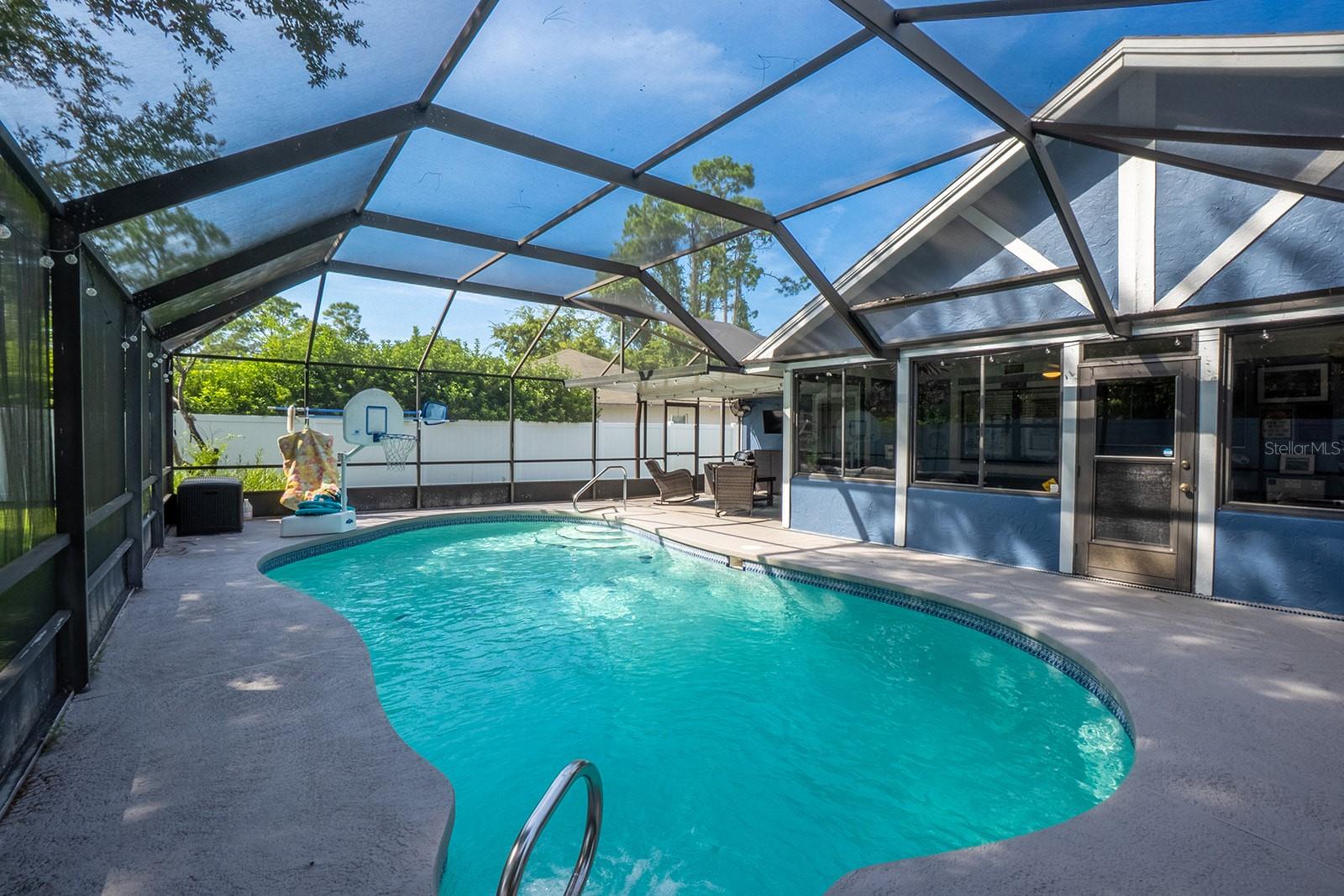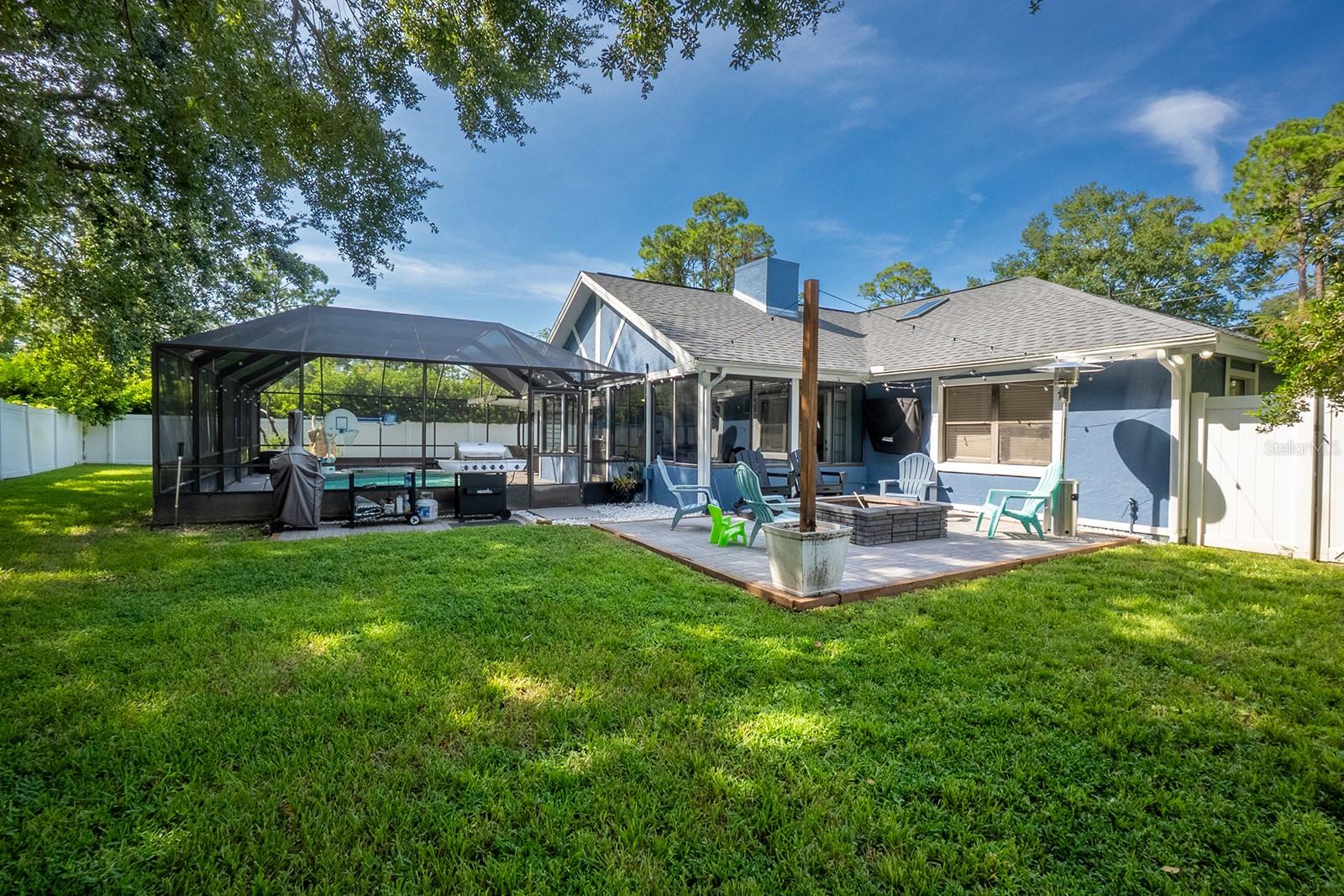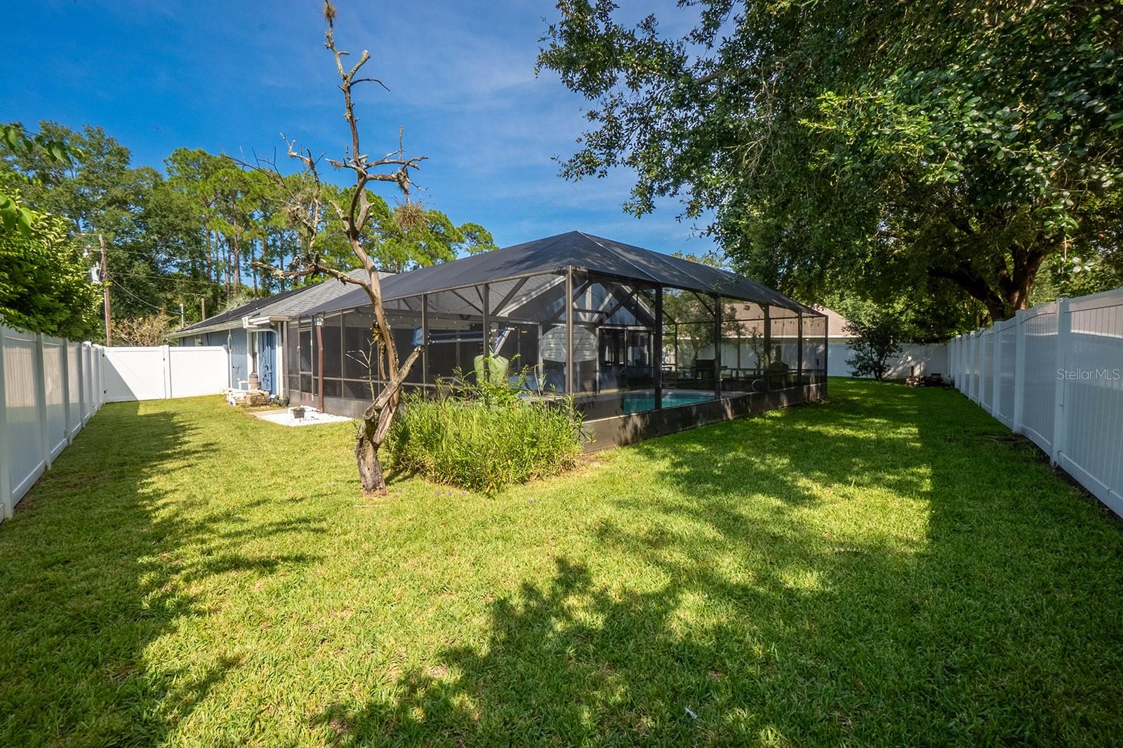 Welcome home to Indian Trails East one of the very few Palm Coast neighborhoods that is walking distance to stores and restaurants! The lovely 3 bedroom 2 bath home on an oversized lot offers a side entry garage volume ceilings, a wood burning fireplace, huge Florida Room. Light and bright with plenty of skylights, LVP flooring through out, formal dining, large living room and cabinet packed kitchen with center island and newer stainless steel appliances. Ample sized guest bedrooms and bath in this split floor plan offers guests privacy, primary bedroom with large walk in closet and en-suite bath. Off the large Florida room great for entertaining you will find a covered lanai and grilling area, screen inground pool and new outdoor fire pit patio in a fully fenced in yard. Centrally located to schools, shopping and I95 yet tucked away in a lovely neighborhood surrounded by fresh water canals. Roof 2021, Hot Water Heater 2023, HVAC 2024, Firepit patio 2024, Gutters 2024, Exterior Paint 2023