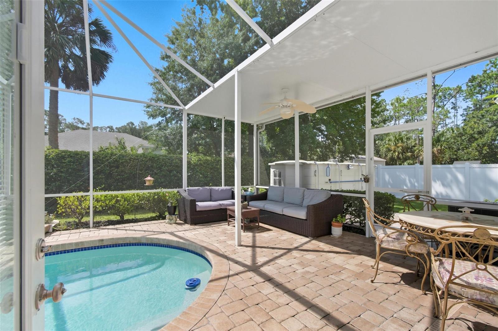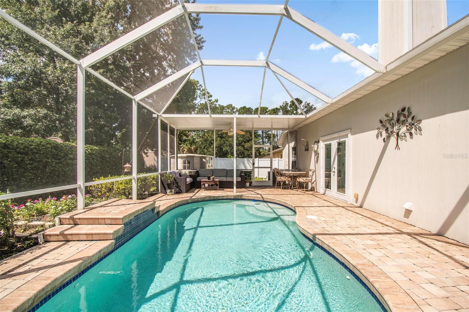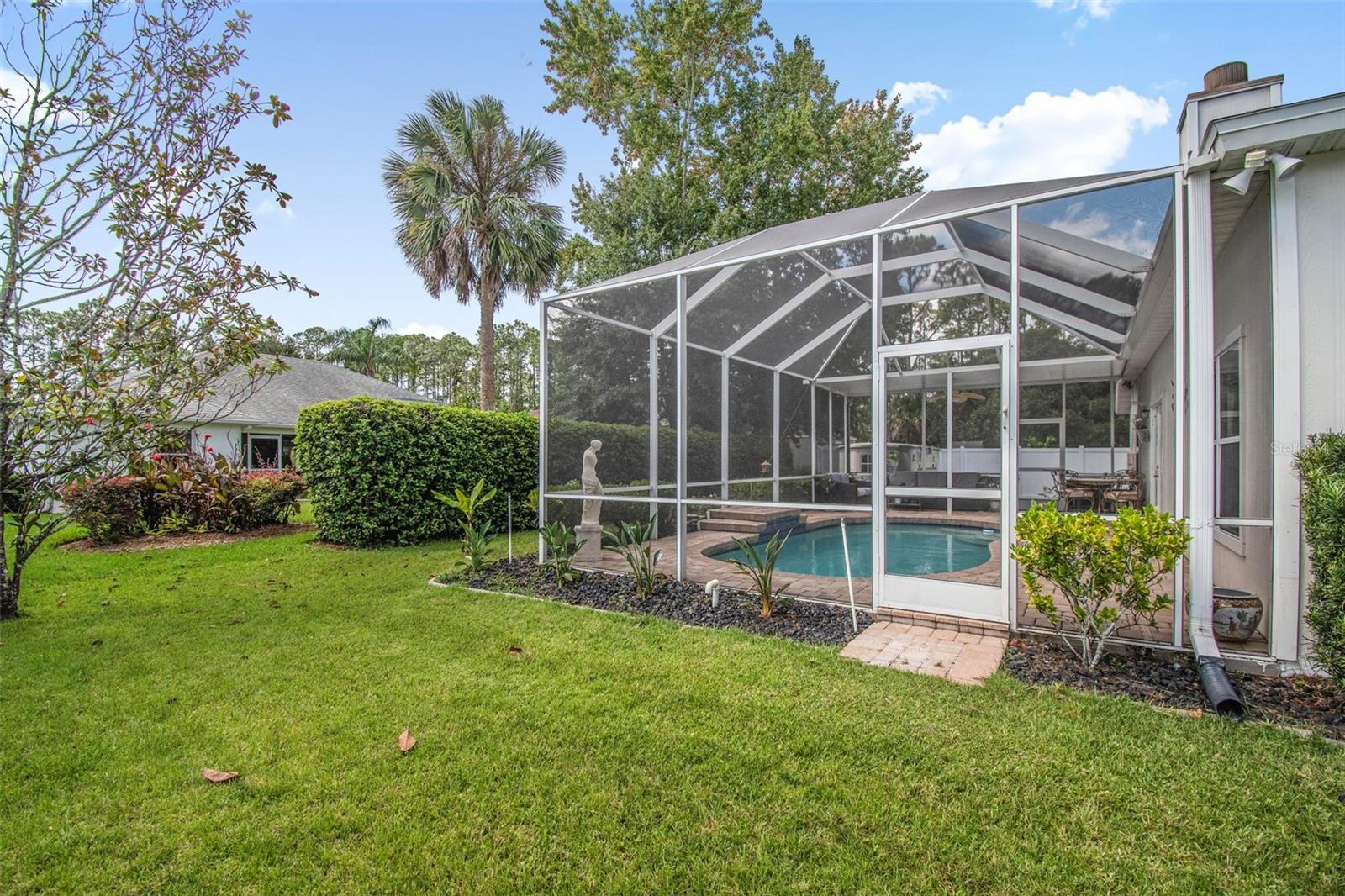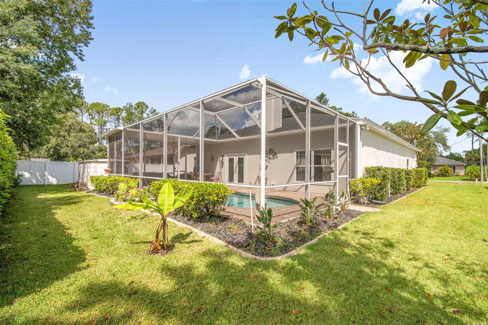 If you are dreaming of the Florida lifestyle near shopping, beaches, parks and golf courses, this home checks all the boxes! This spacious 4 bedroom home ideal for families or guests with outdoor screened-in pool and island seating and ample storage space. Your outdoor oasis is ideal for lounging or entertaining with landscaped backyard. Whole house is tiled except for bedrooms, Kitchen and Bathrooms granite countertops. Ample space in kitchen for eat in. Separate formal dining room and living room. Great room comes with wood-burning fireplace and built-in surround sound with french doors leading to pool area. Installed alarm system, gutters, irrigation system (well) fans in all rooms, window treatments and ample storage shed in backyard.
