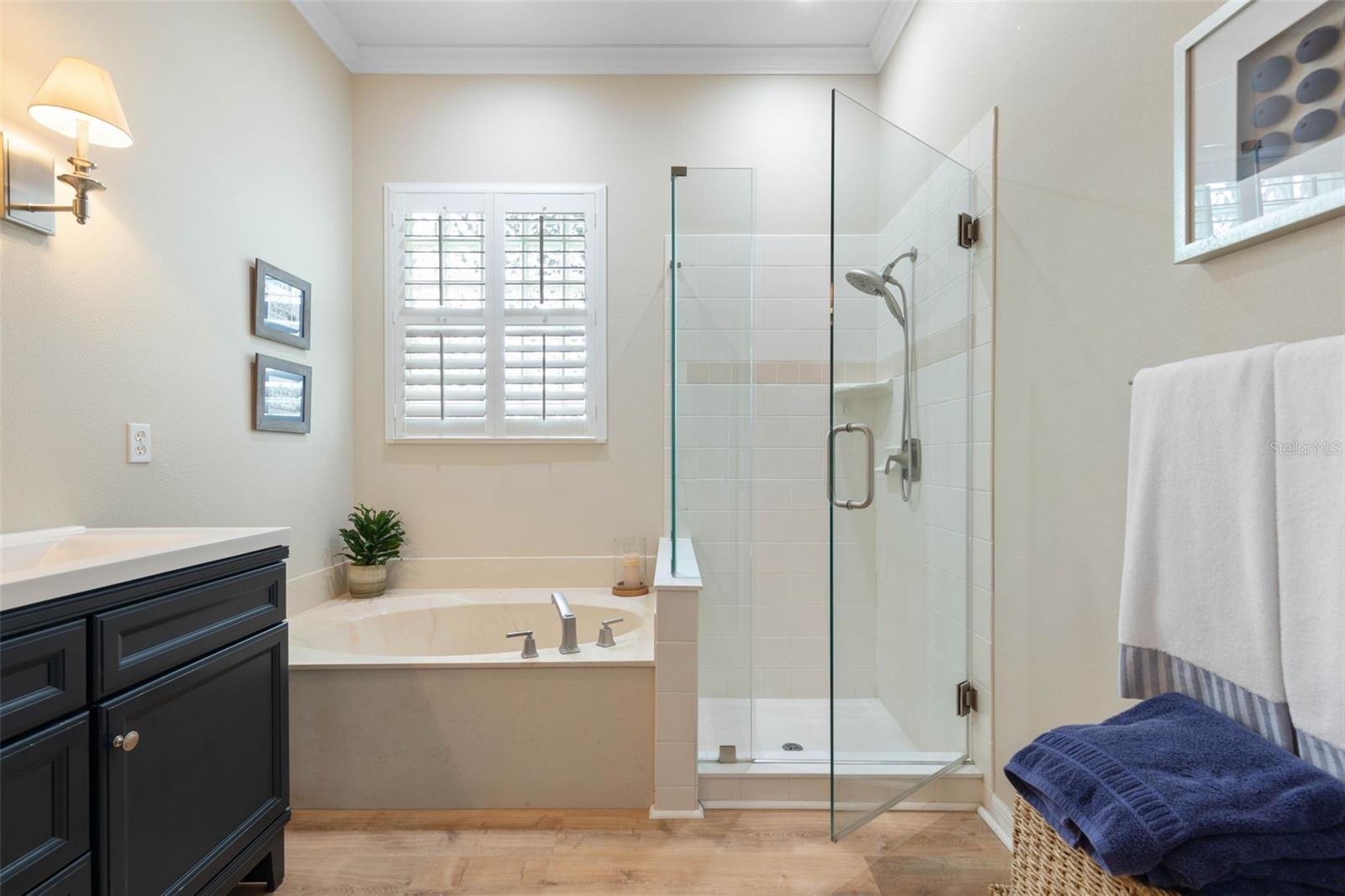 Welcome to this beautifully updated three bedroom, two bath home, 3 car tandem garage with a breathtaking pond/lake view. This home is located in the sought after Grand Havenn golf community. Designed to impress, this residence offers modern upgrades and stylist finishes throughout. Step inside the front door and you will find a light filled open floor plan. A formal living room and dining room off the foyer with a large gathering room. The open floor plan features luxury vinyl flooring, a designer kitchen with beautiful blue cabinets and perfectly curated decor. You feel like you have entered a model home but better. The kitchen has stainless steel applicences, a walk in pantry, bar height counter tops and plenty of storage The breakfast room has a wonderful view of the lake and access to the lanai. The primary bedroom boosts a large walk in closet and a extra space for perhaps an office, exercise area or reading nook. The other two bedrooms and guest bath are spacious. The bathrooms and kitchen were recently remodeled, plantation shutters added, roof, water filtration system, painted garage floor, paver driveway and sidewalk and new screen for lanai. Enjoy peaceful evenings from your patio overlooking the serene lake, all while living in a secure, gated community known for its charm and amenities. This is more than a home. I know you will fall in love with it the moment you step through the door.