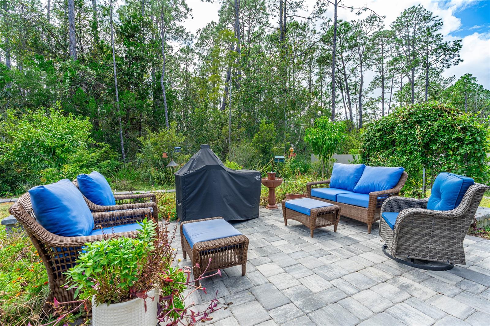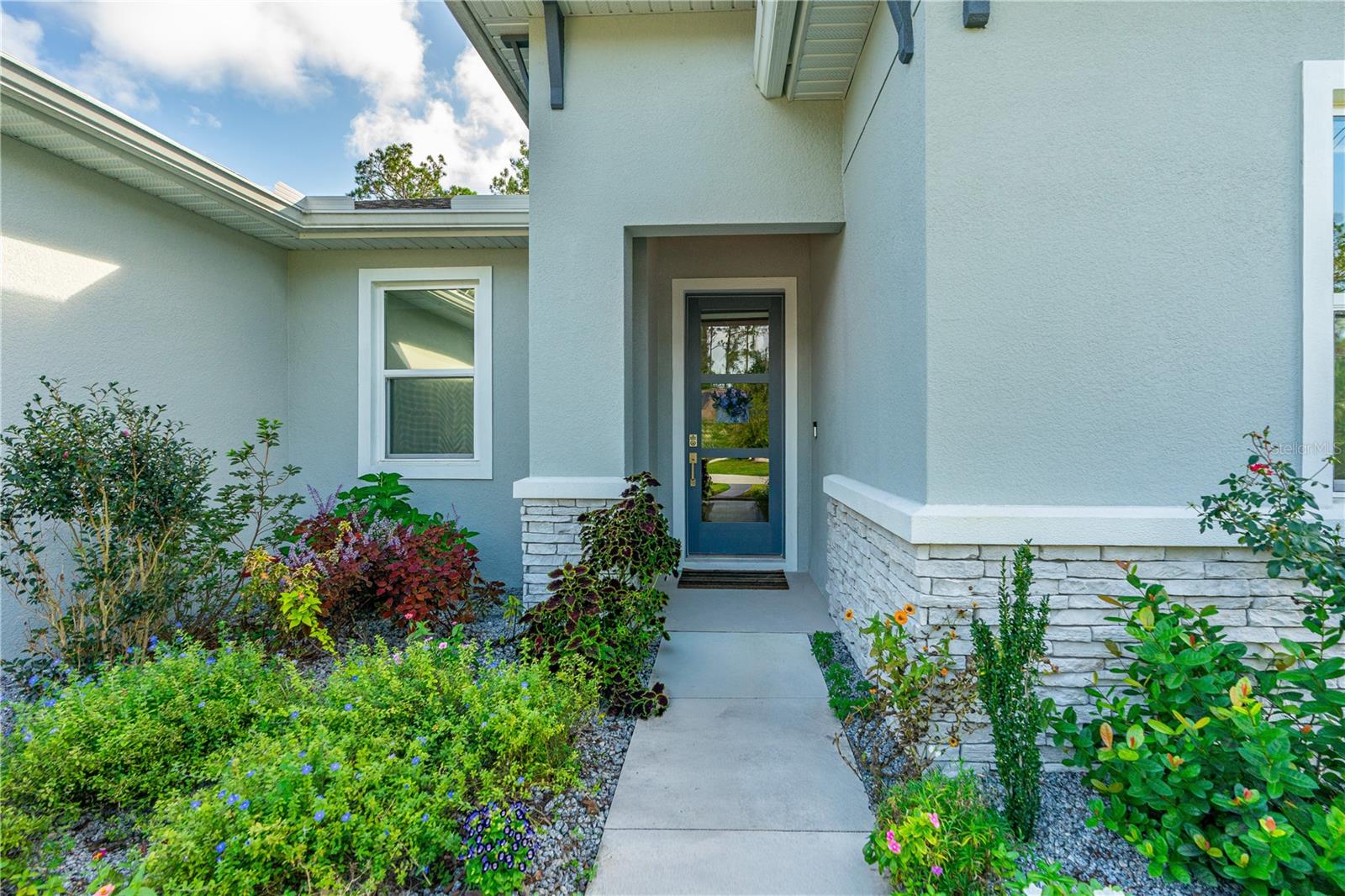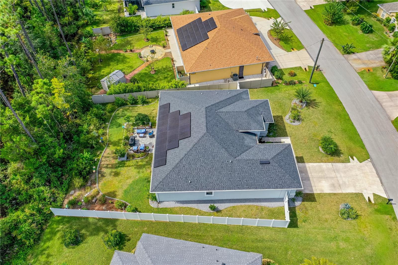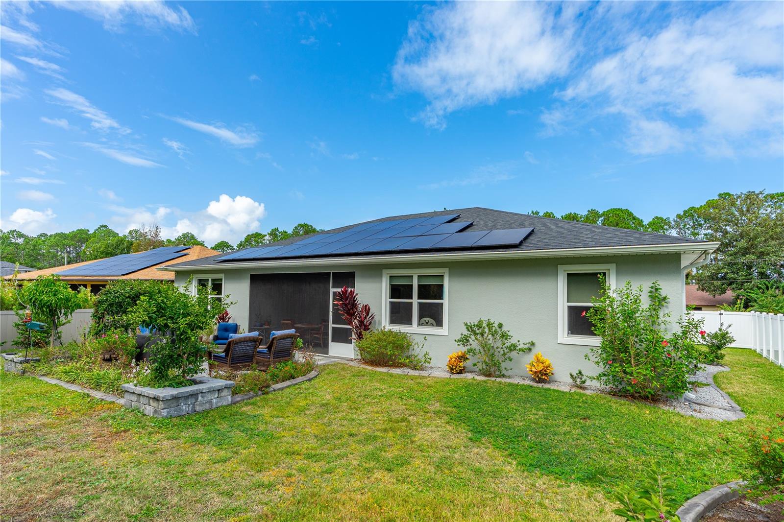Discover Modern Florida Living! Experience comfort, efficiency, and natural beauty in this solar-powered, single-level Brite Built home. Ideally located near shopping, dining, and recreation, this residence offers the perfect balance of convenience and privacy. The backyard, bordering a tranquil preserve, creates a peaceful retreat surrounded by nature. Thoughtfully landscaped with native plants to attract birds and pollinators, the yard also conserves irrigation water for eco-friendly living. Enjoy outdoor entertaining on the extended paver patio or relax in the screened lanai featuring an epoxied floor and ceiling fan—perfect for morning coffee or evening BBQs. The mature citrus tree even produced oranges this year! With no HOA fees and a low average power bill of just $25.66, this home keeps your monthly expenses low. Inside, the open-concept layout includes 4 spacious bedrooms, 3 full baths, and a versatile flex room—ideal for a home office or den. The interior laundry room offers a utility sink for added convenience. The two-car garage features an epoxied floor, overhead storage, a bump-out area, a hybrid electric water heater, and a whole-house water softener system. The chef’s kitchen showcases soft-close cabinetry with roll-out shelves, under-cabinet lighting, and a reverse osmosis system. A stunning 10-foot quartz island anchors the space, perfect for casual dining and entertaining. Durable wood-look porcelain tile flows throughout the entire 2,306 square feet, complemented by abundant storage including upgraded California Closets in all bedrooms. The spacious primary suite overlooks the serene backyard and features an oversized walk-in closet, dual vanities, a glass-enclosed walk-in shower, and a private water closet. Enjoy the year-round blooms of rocket vine, Carolina jessamine, and confederate jasmine just outside your window.Built with quality and care, this home still carries its 10-year structural warranty—a true testament to lasting peace of mind. Upgrades Included: Solar panels – owned and included California Closets in all 4 bedroomsem Improved sliding glass patio door Epoxied garage and lanai floors Fully enclosed lanai Patio pavers & landscape curbing Native backyard plantings Under-cabinet kitchen lighting Ceiling fans in living room, primary bedroom, and lanai Updated light fixtures in kitchen, dining, and entry. Upper garage storage + pegboard wall Whole house surge protection Rain gutter helmets Kitchen cabinet rollouts Smart garage opener 10-Year structural warranty