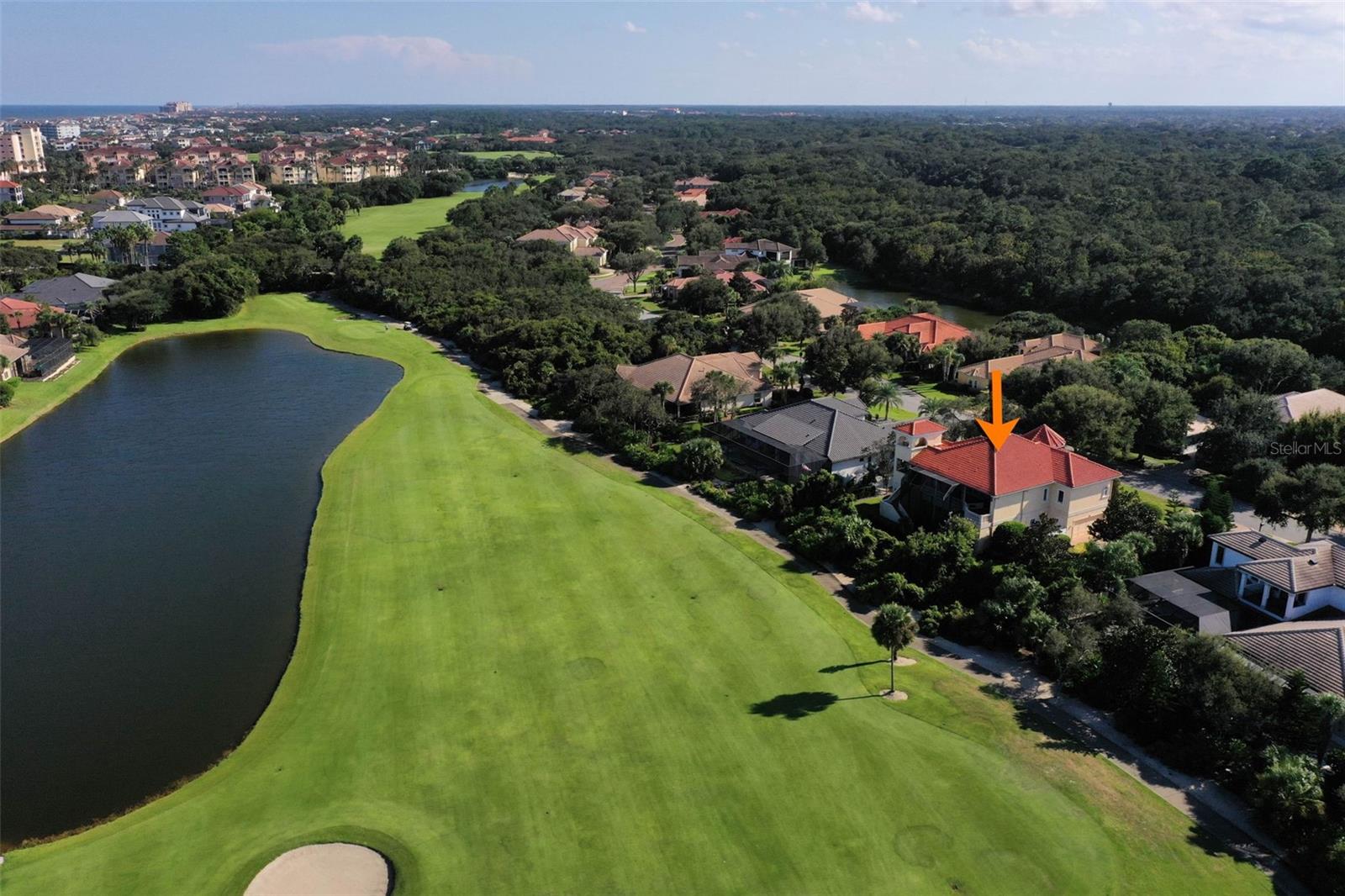 One or more photo(s) has been virtually staged. Experience architectural excellence & timeless elegance in this distinctive Skyway Builders Mediterranean Estate Home, perfectly positioned on the 14th hole of the Hammock Beach Golf Course. Built in 2009, this two-story residence exudes sophistication, craftsmanship, & breathtaking golf & ocean views. The multi-generational living quarters are superior. Handicap-accessible features were thoughtfully built into the design. A short drive into this gated neighborhood of gorgeous homes leads you through a forged iron front door into a grand foyer that sets the tone for the home’s dramatic interior, featuring double tray ceilings, graceful arches, columns, & custom lighting throughout. Floors are Porcelano Brazilian rectified tile, with mosaic accents in the foyer & Spanish tile featured elsewhere in the home, adding to its distinctive character. The great room offers soaring ceilings & a wall of impact-rated, tinted windows & French doors framing spectacular course views. The chef’s kitchen is designed for both beauty & function, showcasing custom cabinetry, granite counters, a 36-inch gas cooktop w/ grill, built-in wall oven, cabinet pantry, & wet bar w/ under- & upper-cabinet lighting. A breakfast nook w/ chandelier & adjoining gathering room w/ wet bar, plus formal dining, powder room & elegant office complete the upper level’s elegant flow—perfect for entertaining. Also on this floor is the primary suite—a serene retreat w/ private foyer, perfect for coffee bar, dressing/exercise room, spa-style bath w/ soaking tub & oversized shower, large walk-in closet w/ custom shelving, expansive separate linen closet w/ window, three vanities & water closet w/ bidet. Elevator access in the middle of the home takes you down to the lower level offering exceptional versatility. Featuring three bedrooms total on first floor, one of which could make an amazing game/craft room w/ double walk-ins, & the other two w/ baths en suite (one w/ walk-in), plus another powder bath, wet bar w/ mini fridge in another living room—perfect in-law suite for one/two sets of parents—plus large laundry room. Tiled, tandem four-car garage (20.8' x 30.6') provides generous space for vehicles, golf carts & storage, w/ additional utility & under-stair storage areas. Outdoor living includes two covered porches, gas fireplace, tiled patios & decorative balustrade railings surrounding multiple terraces—perfect for relaxing or entertaining while enjoying panoramic views. Summer kitchen includes exhaust fan vent w/ switch. Ample space to add a pool if desired. Additional features include owned (but disconnected) alarm system & newer air conditioners (1–2 yrs old), ensuring comfort & peace of mind. Crowning this home is stunning Belvedere tower w/ spiral staircase, offering one of the most captivating vantage points in Hammock Beach—sweeping views of the golf course, club & Atlantic Ocean. From barrel-tile roof & handcrafted finishes to grand chandeliers, niches & architectural details, this home is a masterpiece of design & quality. Located in gated North Shore section of Hammock Beach, this property offers ultimate blend of luxury, privacy & proximity—just moments from the beach & world-class golf.