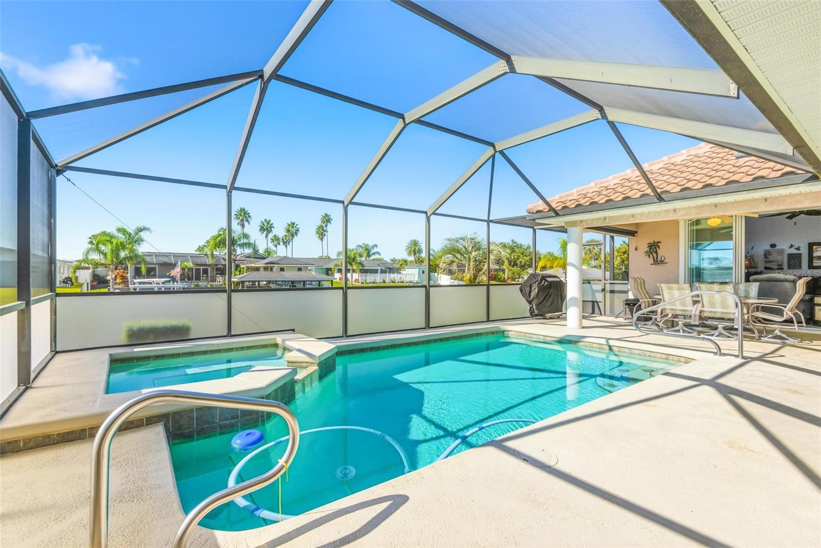 Resort Living Meets Ultimate Peace of Mind. Experience the perfect blend of luxury and security in this beautifully appointed waterfront home on a navigable saltwater canal. From the moment you arrive, the pride of ownership is evident in the manicured lawn and striking curb appeal. Built with rare structural integrity, this home features "vault-style" construction, utilizing cement-filled cinder blocks and premium roof tiles designed for maximum durability. Enjoy complete tranquility with a comprehensive hurricane protection system, including Force 12 Kevlar screens for the pool area and a mix of electric and manual metal shutters for all openings. The home is designed for energy efficiency and year-round comfort, featuring double-pane aluminum windows with marble sills, 11 ceiling fans, and a sophisticated re-circulator pump that provides instant hot water on demand. Step through elegant cut-glass front doors into a grand interior defined by 10-foot ceilings and updated wood-like ceramic tile flooring. The gourmet kitchen and laundry room are bathed in natural light via sun tunnels, while the family room serves as an entertainment hub with a 55-inch OLED Smart TV, surround sound, and four 8-foot sliding doors that frame stunning canal views. The expansive master suite offers a private retreat with direct pool access, updated dual vanities, and a spa-like bath. Outside, the solar-heated pool and lanai feature "cool deck" technology to keep your feet comfortable even in the midday sun. The oversized two-car garage is a hobbyist’s dream, equipped with a remote-controlled drop-down screen, elevated storage racks, and a side maintenance door.
