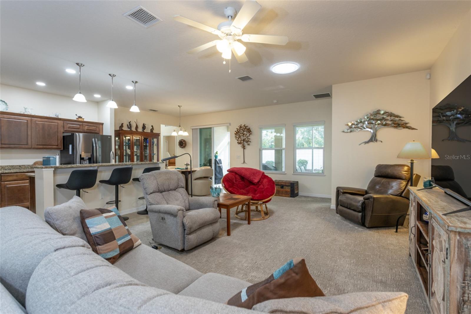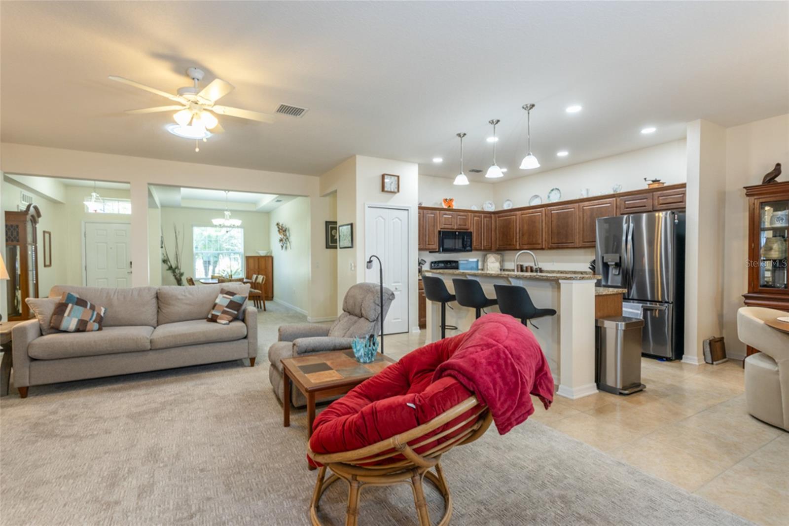 Looking for a home within the Matanzas Woods subdivision? This spacious, well-maintained home offers four bedrooms, three full baths, a dedicated office or den that can easily be converted into a fifth bedroom, and a three-car garage. The open floor plan features 10-foot ceilings, tile and carpet throughout, and a bright living area with two solar tubes for added natural light. The kitchen features granite countertops, updated cabinets with ample pullout drawers, a pantry, and ample storage. The primary suite features a tray ceiling, an oversized walk-in closet that is truly a room of its own, and a spacious bathroom with a large shower and three-way shower heads. Exterior just painted, and interior recently done as well. Carpet only 3 years old, Hot water tank new, deep well and irrigation, all landscaping beds have irrigation drips, French drains installed, attic flooring installed and additional insulation to the home, and refrigerator is new! Enjoy the screened lanai with two ceiling fans overlooking professionally designed landscaping and a fully fenced yard, plus the added peace of mind of a 22 kW whole house generator during power outages.