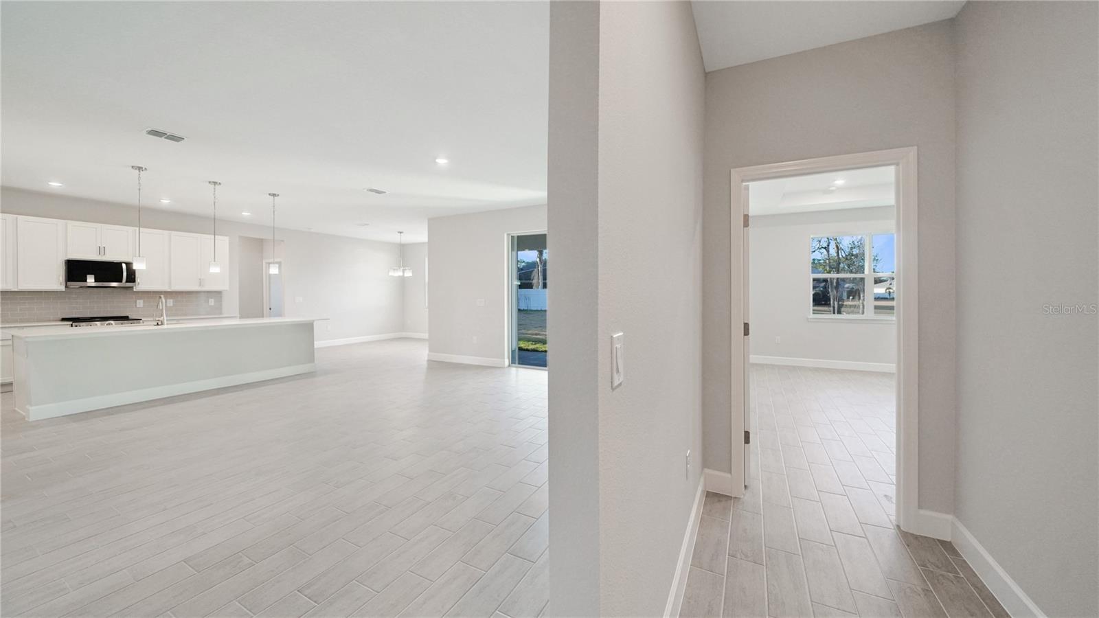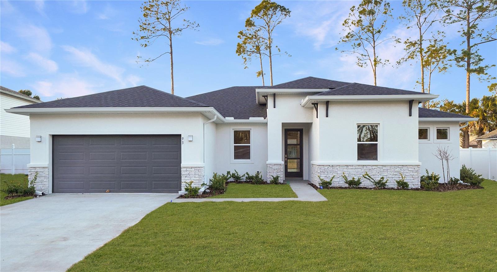 Brand new and energy efficient, by Brite Homes, this residence features clean, modern design and solid concrete block construction, creating a durable, low maintenance living experience. The exterior offers strong curb appeal with clean architectural lines, a stone accented front elevation, a full gutter system, irrigation, and an upgraded modern front door that sets the tone upon arrival. Inside, the Brite Dream floor plan offers an award winning layout with tile flooring throughout and no carpet, creating a bright, spacious main living area ideal for everyday living and entertaining. The kitchen is thoughtfully designed with quartz countertops, upgraded appliances, and 42 inch soft close cabinetry, blending modern style with practical functionality. A flexible bonus space provides versatility for a home office, media room, or additional living area, while a private guest suite with its own full bath offers comfort and privacy for visitors or multigenerational living. The primary suite serves as a relaxing retreat with tray ceilings, 9 foot 4 inch ceiling heights, and a large walk in closet. Living space extends outdoors to the covered lanai, with energy efficient construction throughout. A one year workmanship warranty and a ten year structural warranty provide added peace of mind. Located in the highly sought after Indian Trails B Section of Palm Coast, this north side location offers the rare advantage of no HOA or CDD fees, along with convenient access to schools, parks, and everyday amenities. Enjoy easy drives to St Augustine and Jacksonville, with Palm Coast’s beaches just minutes away, offering modern new construction without added community costs. Photos are digitally enhanced and could be altered, please verify. Some photos are virtually staged.