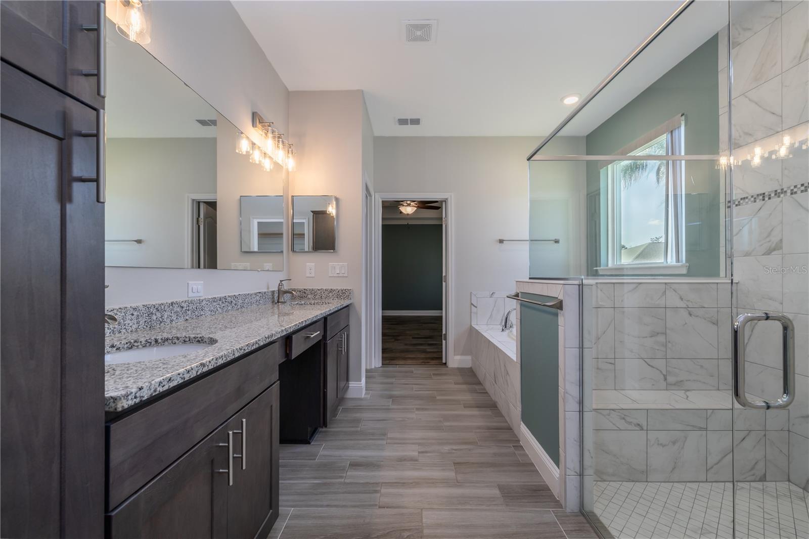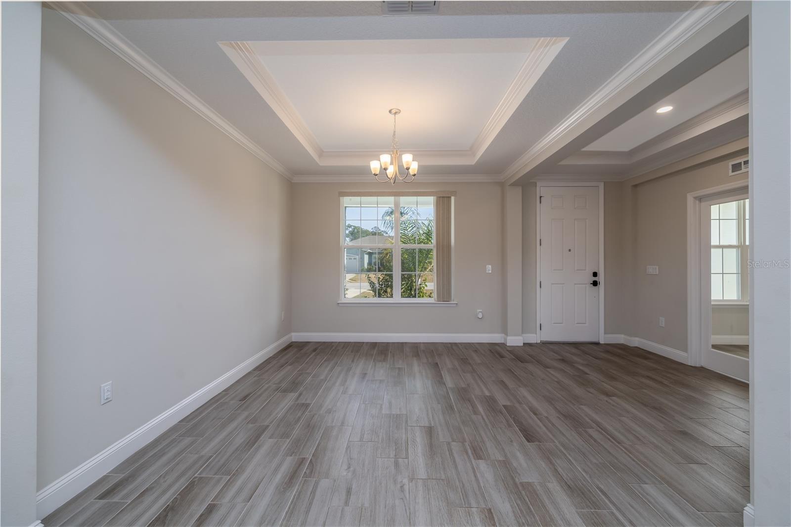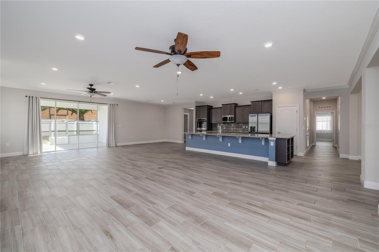 Impressive and beautifully upgraded home offering 3,024 square feet of living space, designed for space, comfort, and everyday luxury. This expansive residence features 4 bedrooms plus a large separate office/flex room with elegant French doors, providing exceptional versatility for work, study, or additional living space. The open-concept layout showcases high ceilings, crown molding, recessed lighting, and generously sized living areas filled with natural light. The kitchen is a true centerpiece, featuring granite countertops, a massive island with seating, stainless steel appliances, and abundant cabinetry—ideal for both entertaining and daily living. The primary suite is a standout, offering tray ceiling details and a spa-style bathroom with a large garden tub, dual granite vanities, and a glass-enclosed walk-in shower—creating a private, relaxing retreat. A rare and highly desirable feature is the dedicated laundry/utility room, designed as a true room rather than a closet, complete with a utility sink, built-in cabinetry for organized storage, and washer and dryer already included. Ceramic tile flooring flows throughout the main living areas, while durable vinyl plank flooring adds warmth and comfort in the bedrooms. Step outside to a covered and screened lanai overlooking a fully fenced backyard, offering privacy and space for outdoor living and entertaining. Additional features include full soffit exterior lighting and additional blown fiberglass insulation for improved energy efficiency. Located in a well-established neighborhood with NO HOA, this home offers both freedom and convenience with easy access to town center, shopping, restaurants, medical facilities, and major roadways. Finished with quality details throughout and featuring a 3-car garage and wide driveway, this home delivers space, upgrades, location, and flexibility—without HOA restrictions.