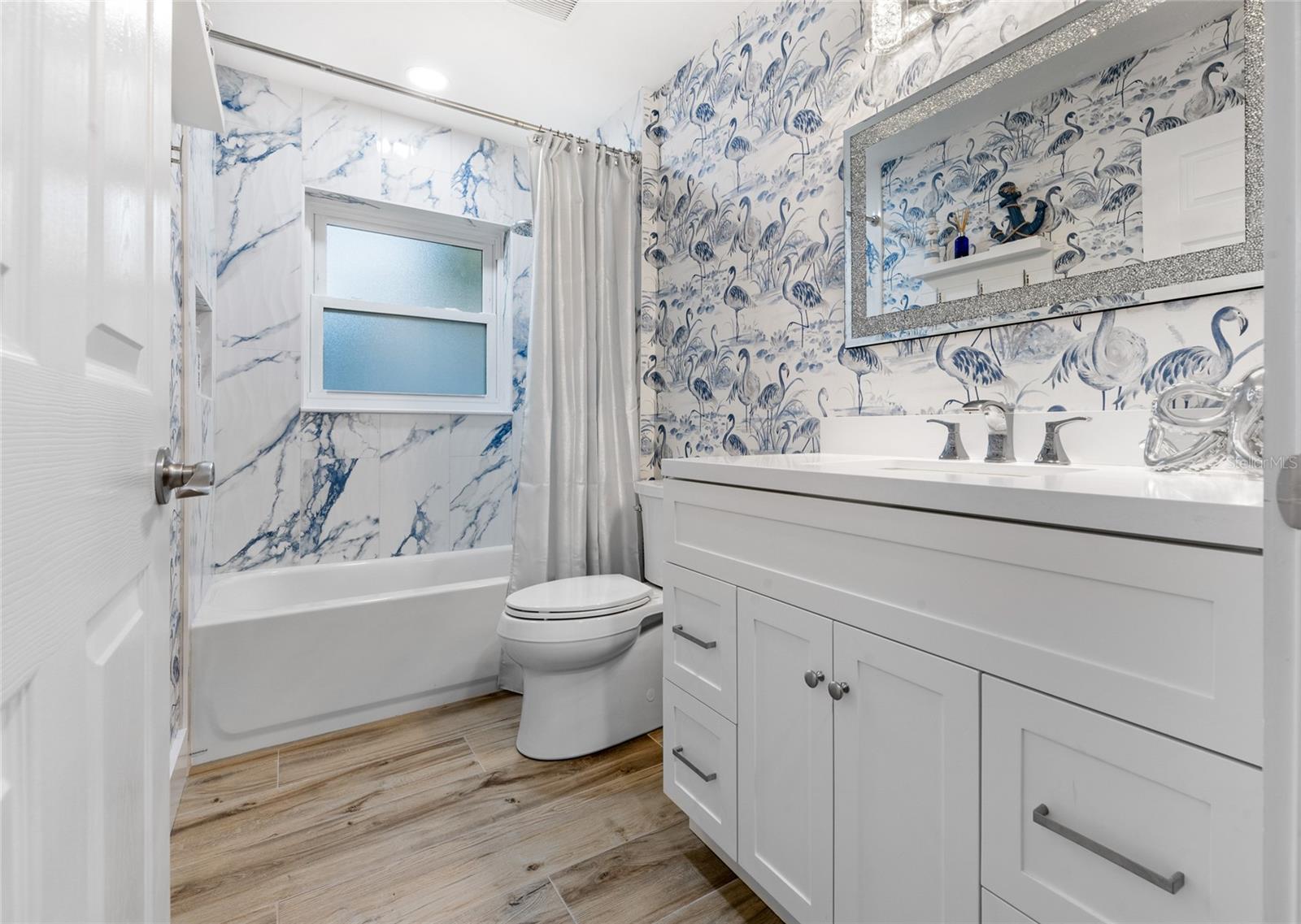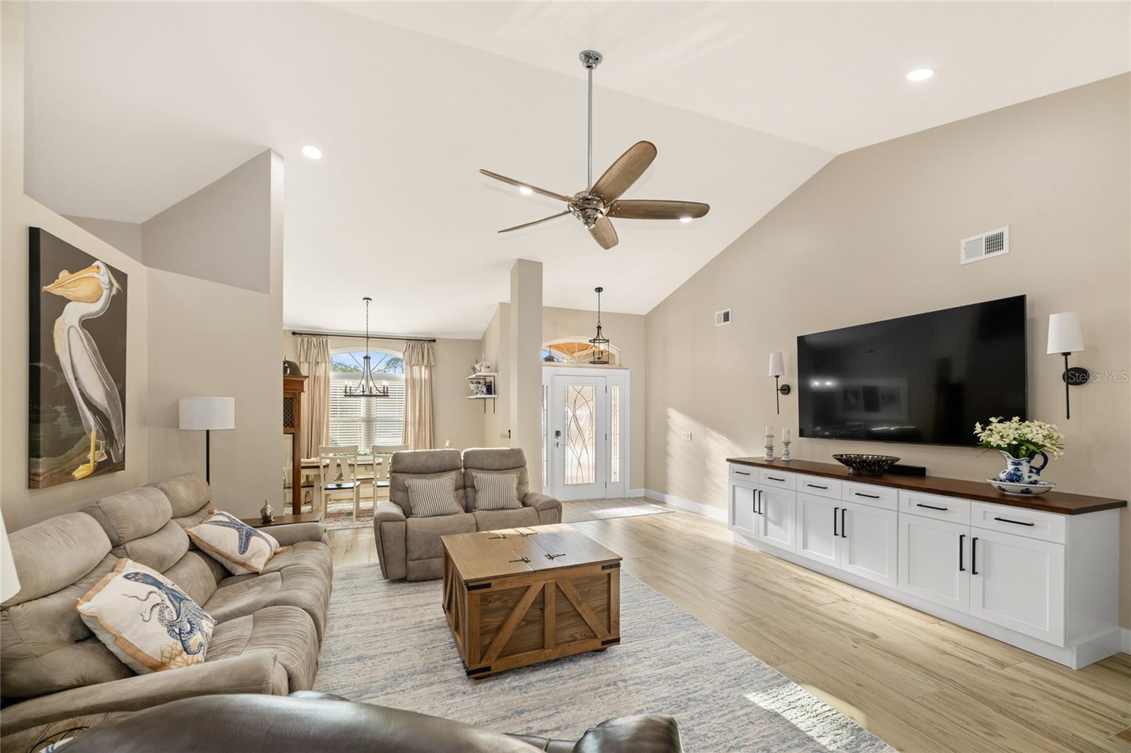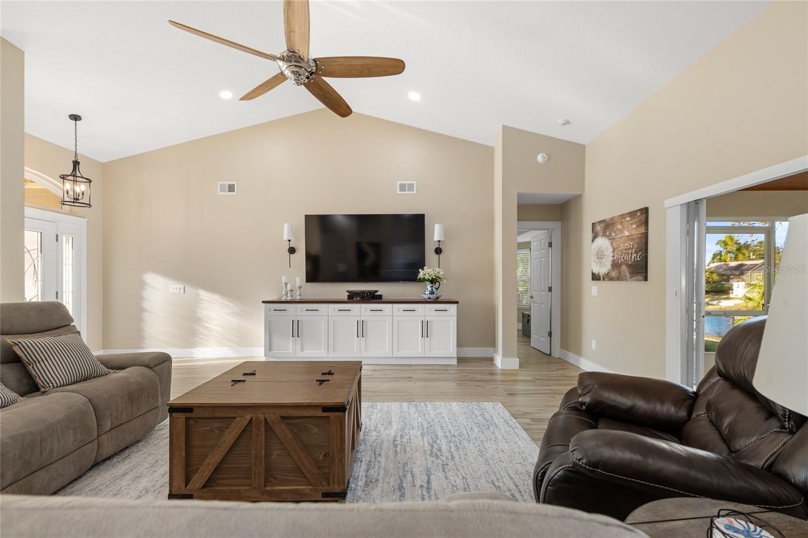 Stunning Renovated Canal-Front Sanctuary in Pine Lakes. This fully updated 3 bedroom + den, 2 bath home is situated on 80 feet of tranquil freshwater canal frontage with breathtaking panoramic views. Fully updated, including new porcelain tile throughout, quartz countertops, new kitchen cabinetry, bathroom vanities, double-pane windows, plus much more. With a split floorpan, the primary suite is spacious, the ensuite offering a walk-in shower, his/hers vanities, bathtub and toilet. With a 2020 roof/AC, new driveway and fresh paint inside and out, this home is truly turn-key. Enjoy the ultimate Palm Coast lifestyle on your expansive screened lanai overlooking the water!