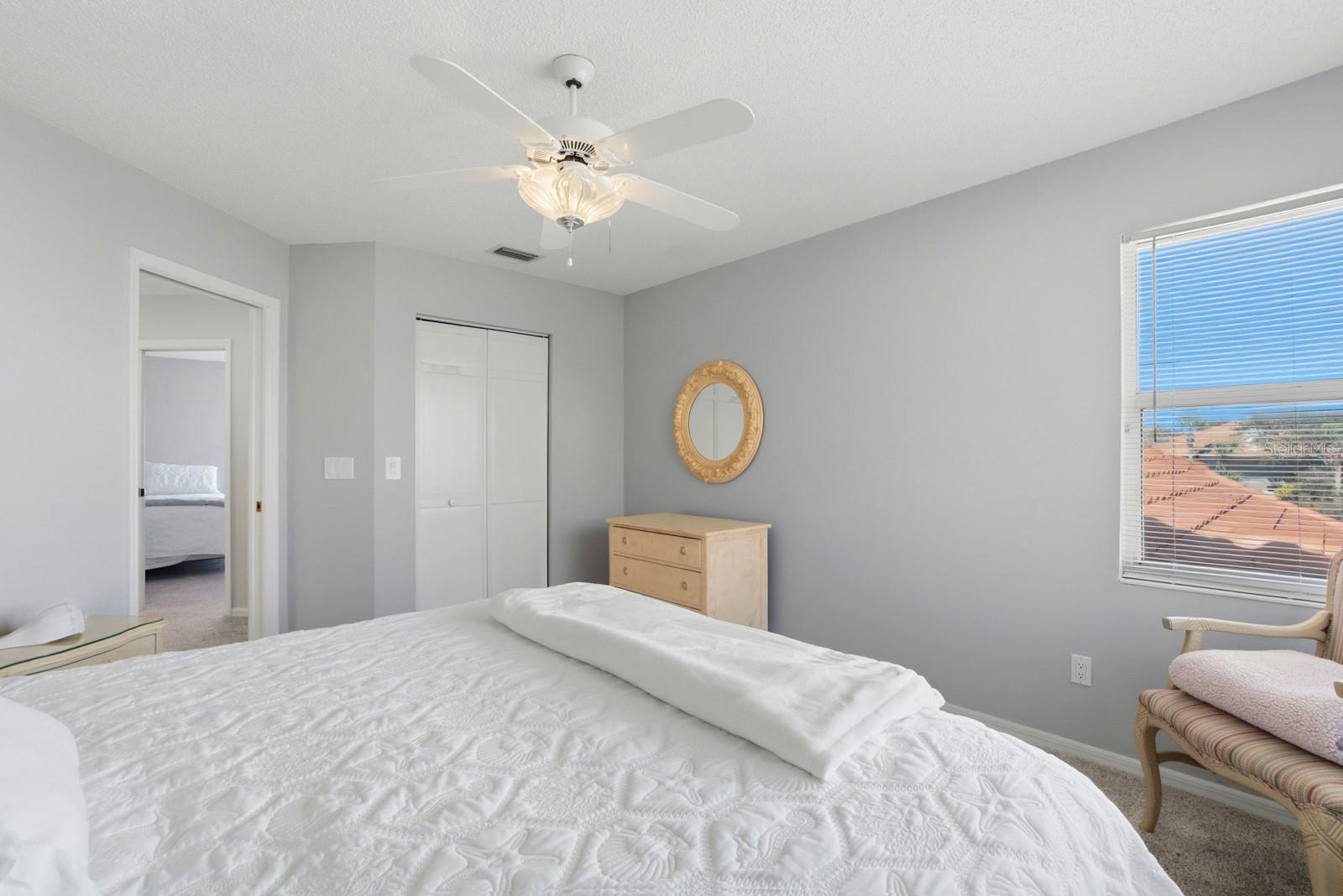 Tucked away on one of Hammock Dunes’ most peaceful streets, 13 Madeira Court is set beneath a canopy of mature oak trees at the end of a quiet cul-de-sac, offering privacy and a serene setting within this highly desirable gated community. This Spanish Mediterranean–style pool home features a classic tile roof and 2,830 square feet of thoughtfully designed living space with tranquil lake views. A tiled foyer welcomes you inside, where a conveniently located half bath sits at the front of the home. Two spacious living areas anchor this front portion of the residence, both enhanced by LVP flooring, high ceilings and abundant natural light—ideal for flexible use as formal living, sitting, or multipurpose spaces. The heart of the home is the main family and entertaining area. This inviting space features a wood-burning fireplace and French doors that lead to the enclosed tiled floor patio where the home opens comfortably to the outdoors. Just beyond the living space, a private pool awaits with serene lake views. Plantation shutters throughout the home add timeless style while maintaining a bright, airy feel. The bright white kitchen offers quartz countertops, a tile backsplash, and ample cabinetry, as it connects seamlessly to the central living space. The main-level primary suite is spacious and private, with direct patio access and a well-appointed bathroom featuring dual vanities, a large soaking tub, and a walk-in tile shower. Upstairs, two guest bedrooms with plush carpeting share a full bathroom, offering comfortable accommodations for family or visitors. Surrounded by mature landscaping and located within one of Palm Coast’s most sought-after private communities, this lakefront pool home blends quiet elegance, flexible living spaces, and a tranquil Hammock Dunes lifestyle.
