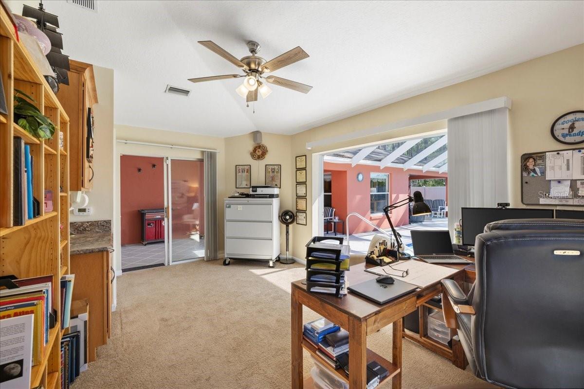 This home features lots of natural light and high ceilings which enhance the fully open-concept layout, creating an inviting flow throughout the main living areas. The updated kitchen opens seamlessly to spacious living and dining spaces The large primary suite features sliding glass doors leading directly to the screened pool area, along with a generous walk-in closet and oversized ensuite bath. Two comfortable guest bedrooms and a bright guest bathroom The true highlight of this home is the expansive screened-in pool and deck area. The oversized pool is a gamechanger. Under the screened enclosure, you'll also find a private in-law suite complete with its own bedroom, full bath, living room, and space for a kitchenette updates, including a 2020 HVAC system and a 2021 roof,