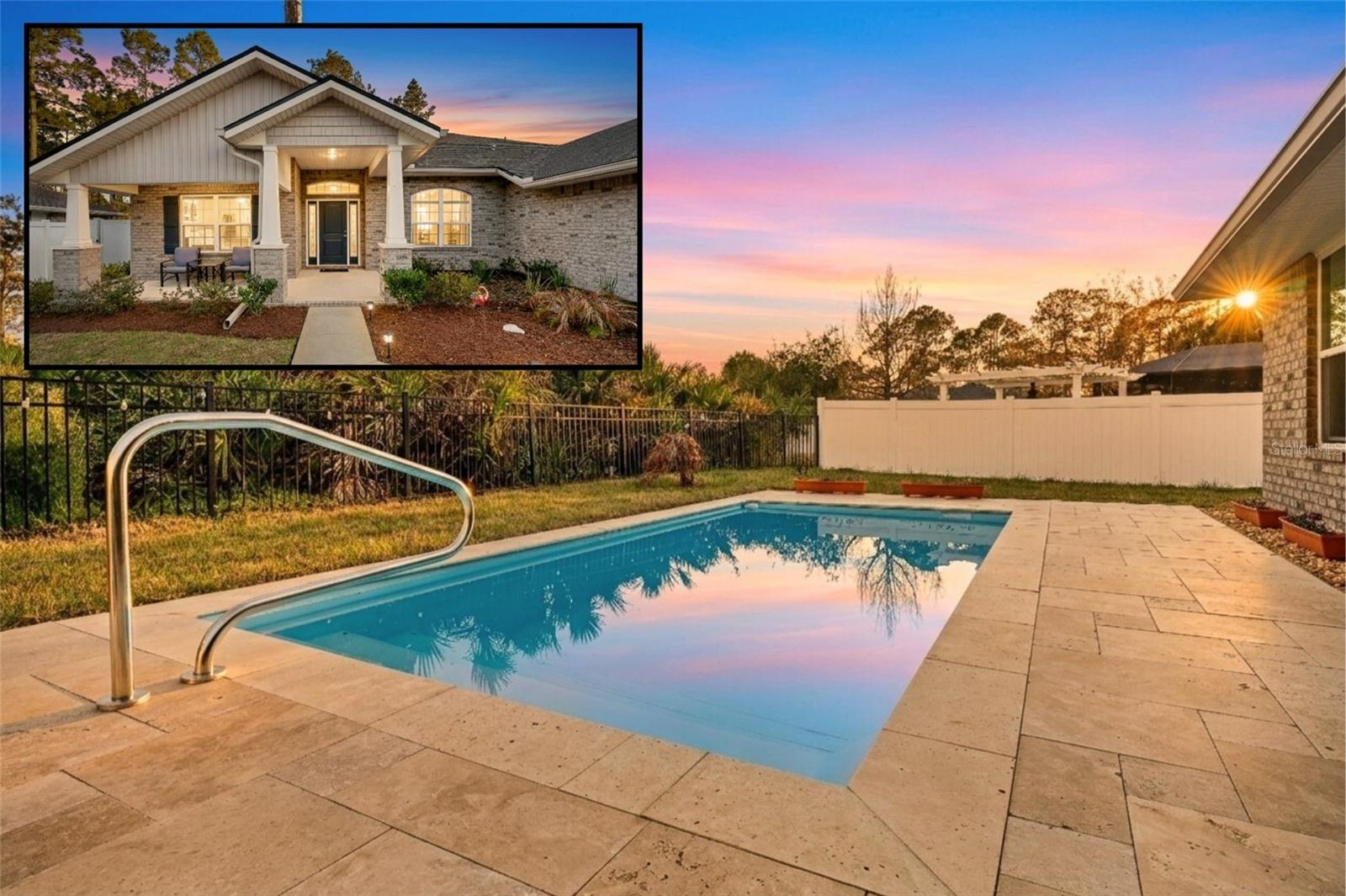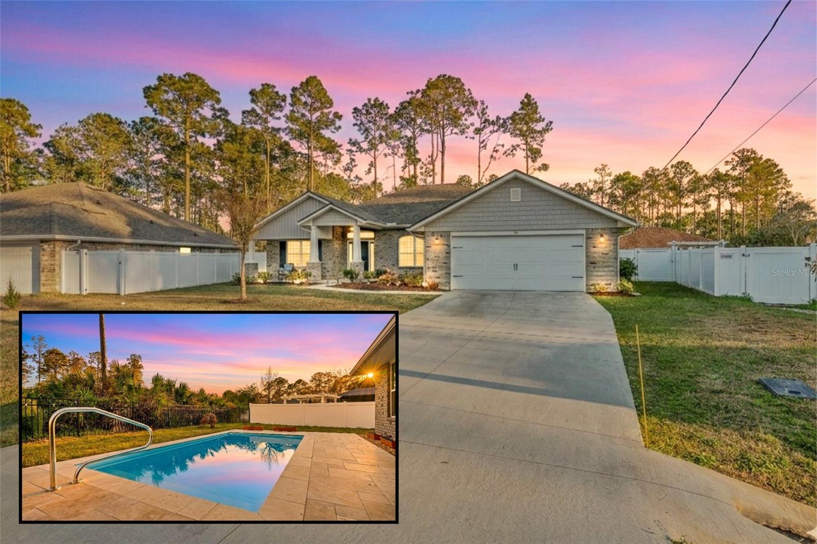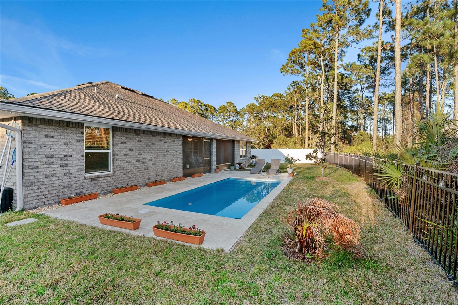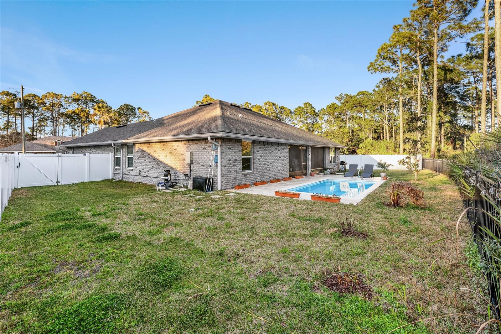 This beautifully upgraded 2023 Seminole Woods home boasts nearly $50,000 in upgrades! There is no need to wait for a pool installation, as this home features a brand-new, sparkling pool with an upgraded travertine patio, completed in January 2026! The spacious open floor plan of this brick construction home showcases soaring ceilings, four bedrooms, and three full bathrooms, with a thoughtfully designed split-bedroom layout. The office includes a newly installed glass partition and door, allowing an abundance of natural light to illuminate the space. The kitchen offers a large breakfast bar and granite countertops, complemented by a delightful view of the new pool. The oversized primary bedroom provides direct access to the lanai and pool, along with new dual custom closets and dual bathroom vanities. Two bedrooms located at the rear of the home share a generously sized bathroom featuring dual vanities, which also serves as a convenient pool bath. Perfect for in-law living, the front bedroom includes its own shared bathroom, ensuring privacy from the other bedrooms. The yard is enclosed with a vinyl privacy fence to the front and sides, while a metal fence enhances the view from the backyard. The home is also equipped with newly installed gutters, and the lanai has been screened. Situated on the south side of Palm Coast, this property is just a short drive from Flagler Beach and Ormond Beach. It enjoys close proximity to shopping in Palm Coast, as well as easy access to I-95 and US-1 for travel and commuting. Additionally, the Seminole Woods Neighborhood Park is merely a short walk away. Schedule your tour today to experience this stunning Seminole Woods home before it is gone!