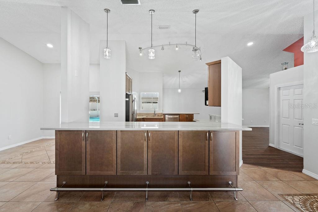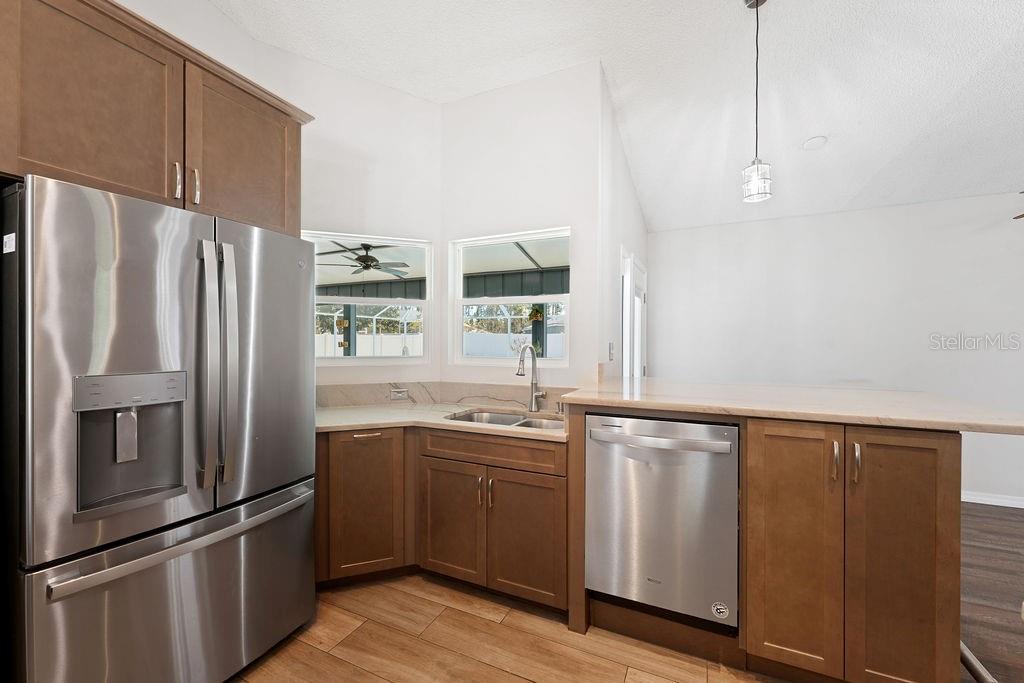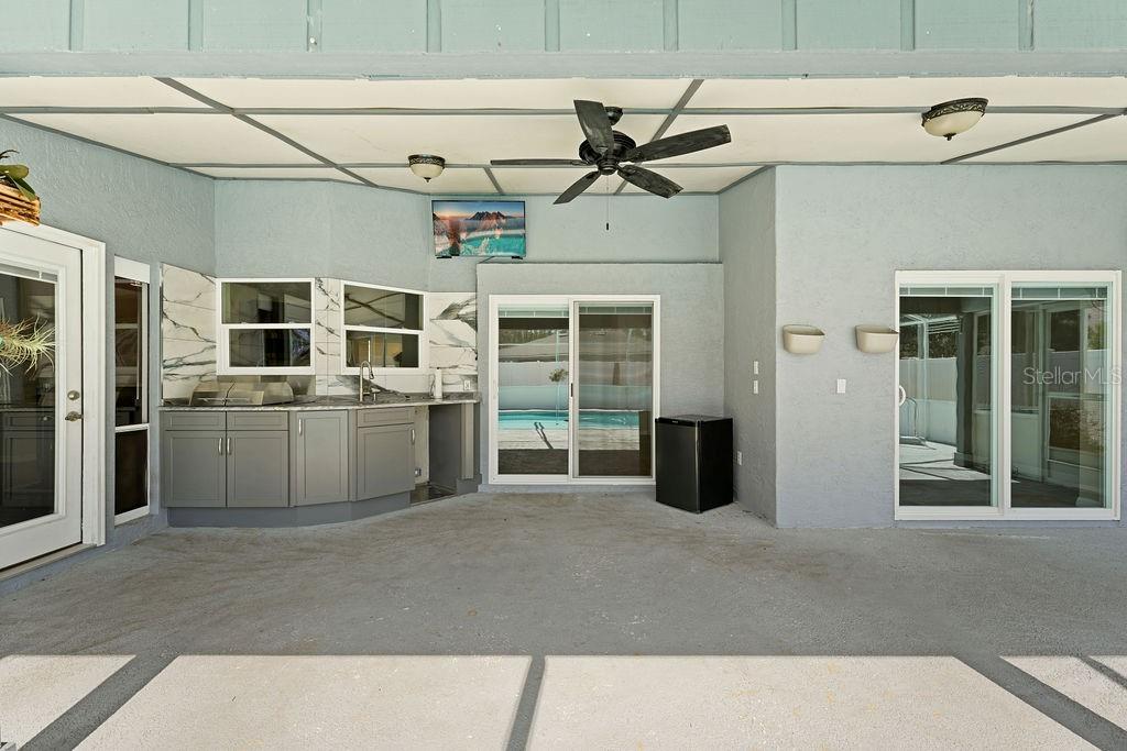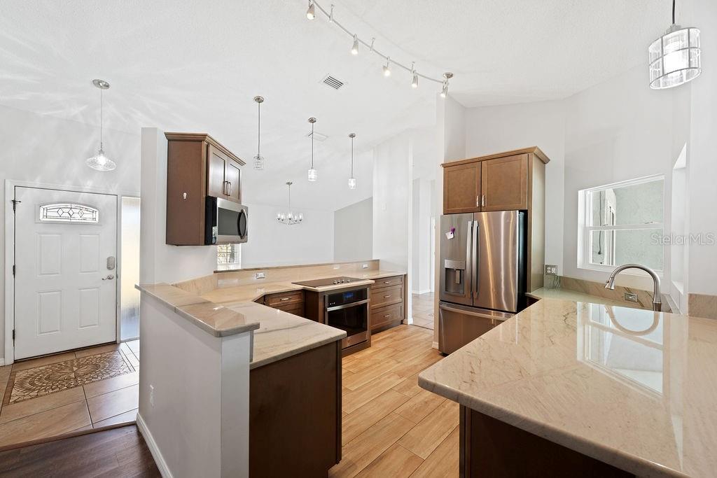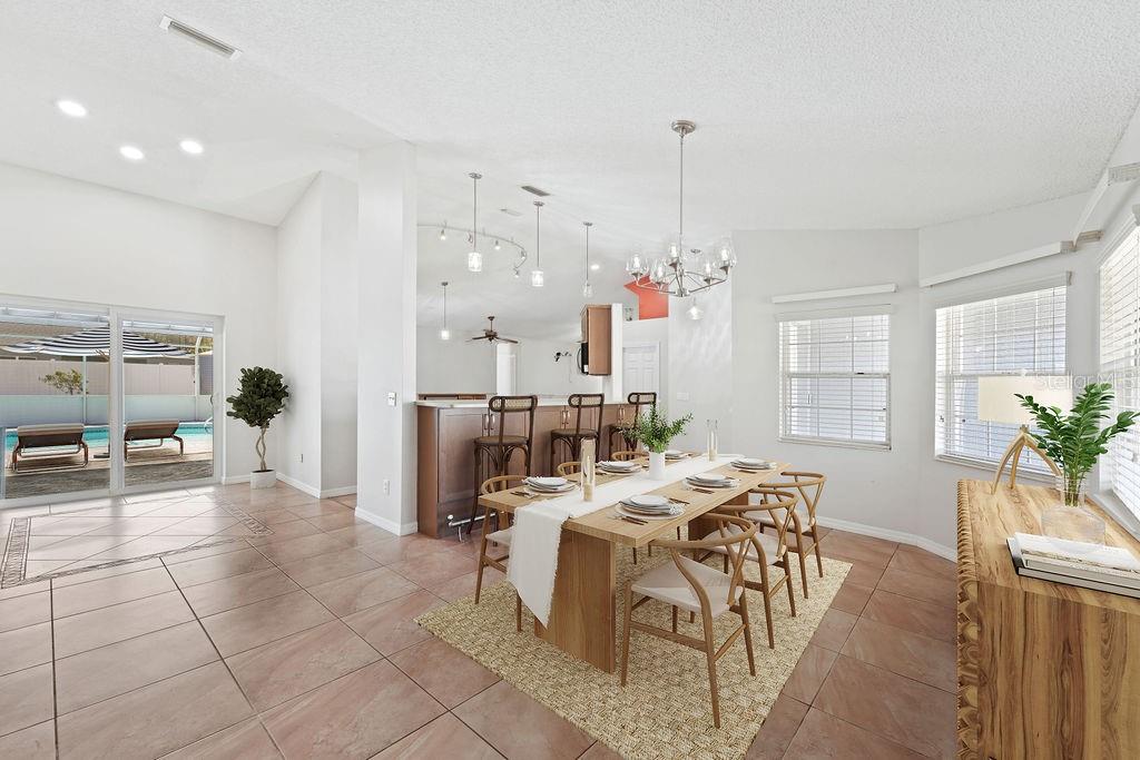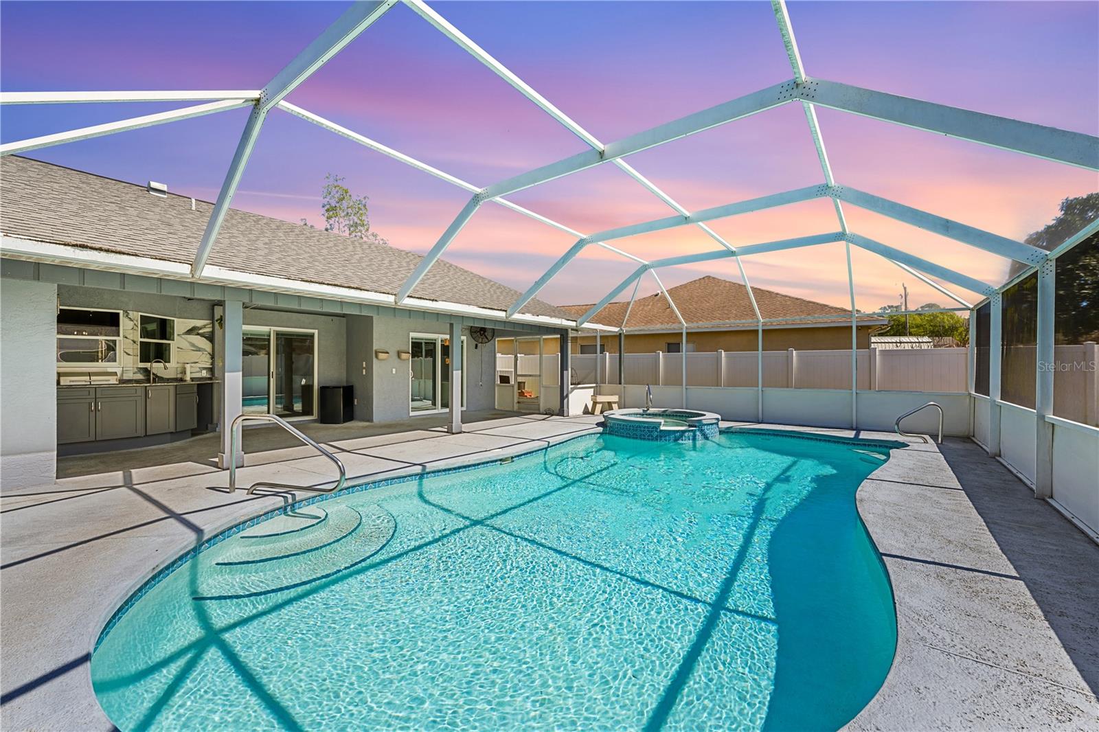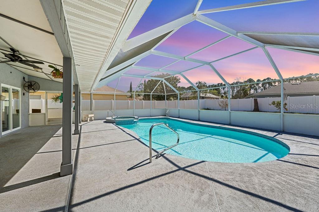 One or more photo(s) has been virtually staged. Lovely Upgraded and Customized pool home complete with CHEF'S Smart KITCHEN located in the highly desirable Pine Lakes neighborhood is READY FOR NEW OWNERS!! Conveniently located close to shopping, entertainment, beaches, golfing & I-95, this home offers almost 2,100 SF, w/ new impact resistant sliding glass doors leading out to the pool w/ spa & waterfall feature, & a new Summer kitchen which overlooks the fully fenced backyard with shed! This beautiful four-bedroom SPLIT FLOORPLAN is laid out perfectly for entertaining friends and family! Family room and dining room flow into the kitchen/great room area. Central custom kitchen features crown molding, granite countertops, unique tall custom soft close cabinetry with pullouts, dual counter bars with kick rails, top of the line SS appliances (all less than four years old) including SMART cooktop, convection oven with air fryer feature, dishwasher, microwave and French door Refrigerator. The Primary Suite features dual custom storage closets and a renovated bath featuring an oversized wet-room, custom tile walk-in shower, his & her sinks and water closet. Slider takes you steps away from your pool and spa onto your spacious screened lanai. Guest bath completely renovated in 2023 doubles as a POOL BATH and features dual sinks and custom tilework. 3 Secondary bedrooms down the hall with adjacent laundry closet conveniently located. Newer components include HWH 2026, HVAC (2020); roof (2017); Flooring throughout (2019) includes custom tilework and engineered hardwoods. Mature landscaping with a fenced in back yard makes this home a perfect choice for any home-buyer! Storage shed less than four years old, perfect for your toys and tools. Conveniently located across the street from Pine Lakes golf course and about 15 minutes to the beach! What could be better!