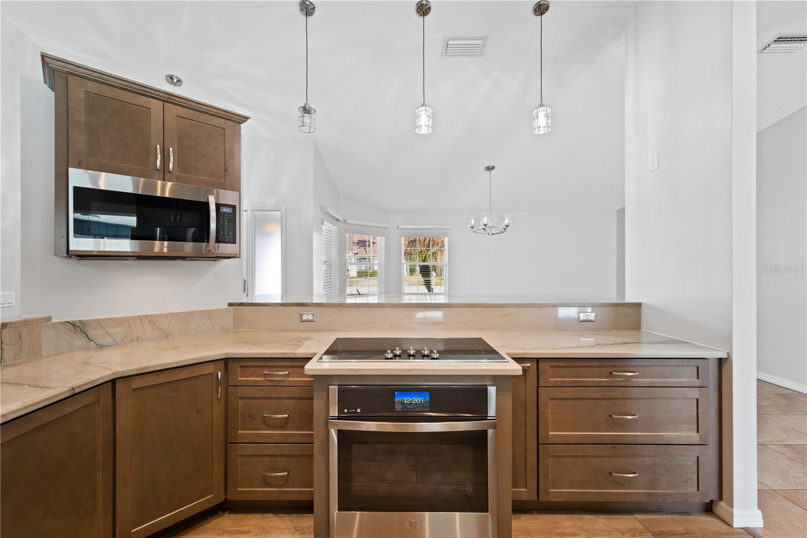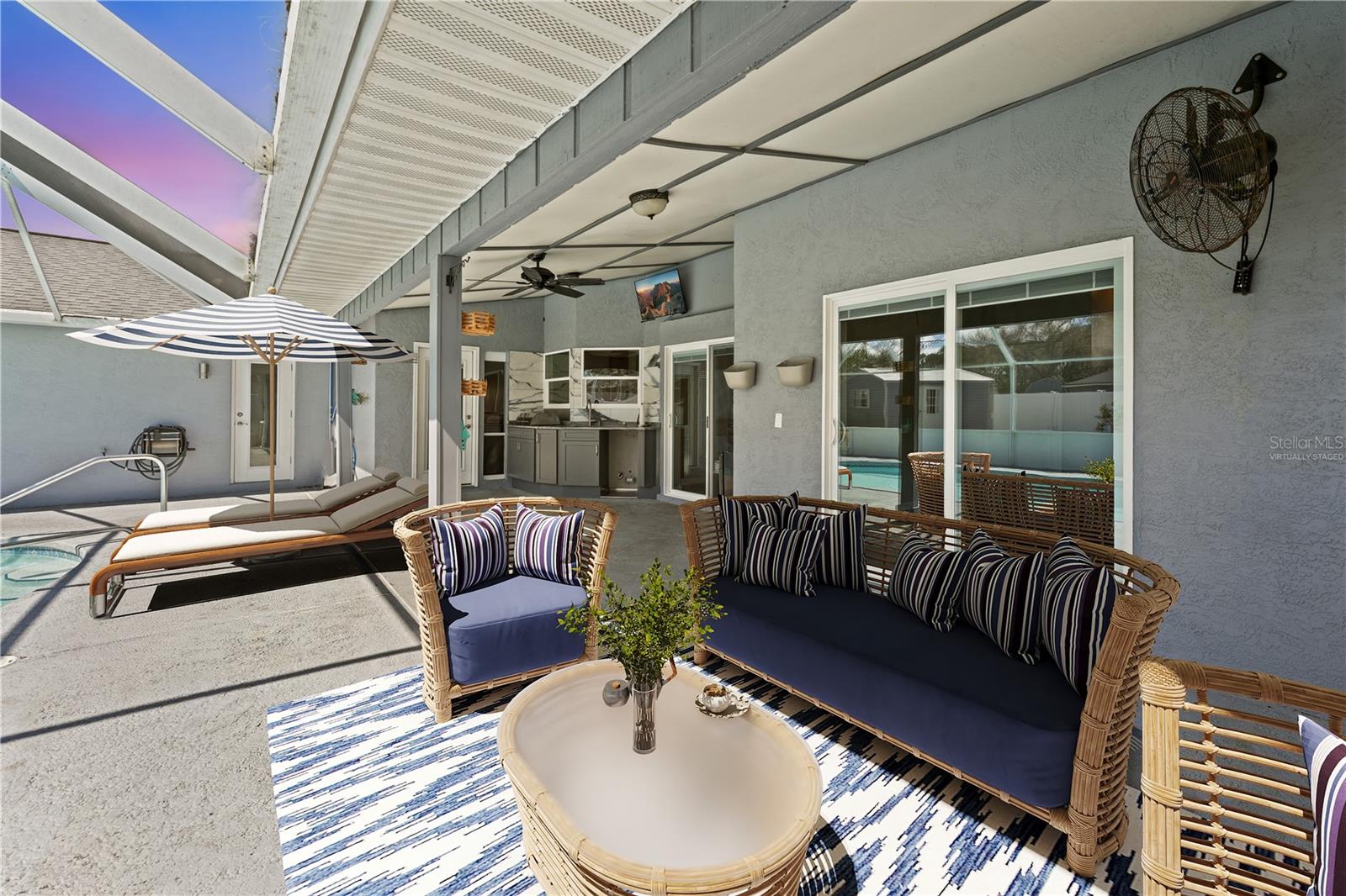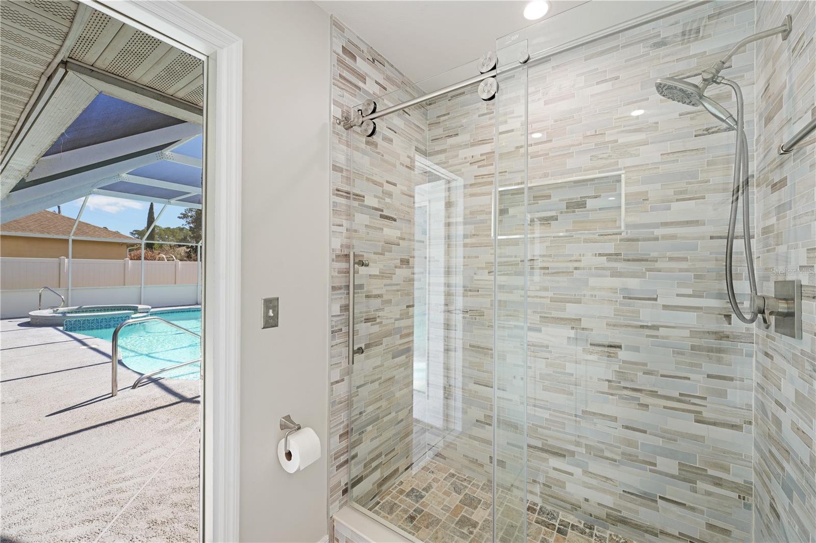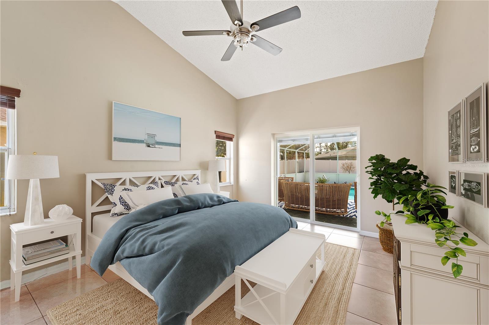 One or more photo(s) has been virtually staged. Lovely Upgraded and Customized pool home complete with CHEF'S Smart KITCHEN located in the highly desirable Pine Lakes neighborhood is READY FOR NEW OWNERS!! Conveniently located close to shopping, entertainment, beaches, golfing & I-95, this home offers almost 2,100 SF, w/ new impact resistant sliding glass doors leading out to the pool w/ spa & waterfall feature, & a new Summer kitchen which overlooks the fully fenced backyard with shed! This beautiful four-bedroom SPLIT FLOORPLAN is laid out perfectly for entertaining friends and family! Family room and dining room flow into the kitchen/great room area. Central custom kitchen features crown molding, granite countertops, unique tall custom soft close cabinetry with pullouts, dual counter bars with kick rails, top of the line SS appliances (all less than four years old) including SMART cooktop, convection oven with air fryer feature, dishwasher, microwave and French door Refrigerator. The Primary Suite features dual custom storage closets and a renovated bath featuring an oversized wet-room, custom tile walk-in shower, his & her sinks and water closet. Slider takes you steps away from your pool and spa onto your spacious screened lanai. Guest bath completely renovated in 2023 doubles as a POOL BATH and features dual sinks and custom tilework. 3 Secondary bedrooms down the hall with adjacent laundry closet conveniently located. Newer components include HWH 2026, HVAC (2020); roof (2017); Flooring throughout (2019) includes custom tilework and engineered hardwoods. Mature landscaping with a fenced in back yard makes this home a perfect choice for any home-buyer! Storage shed less than four years old, perfect for your toys and tools. Conveniently located across the street from Pine Lakes golf course and about 15 minutes to the beach! What could be better!