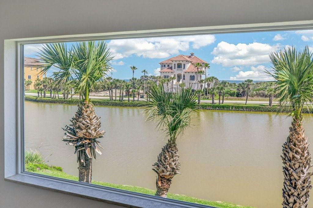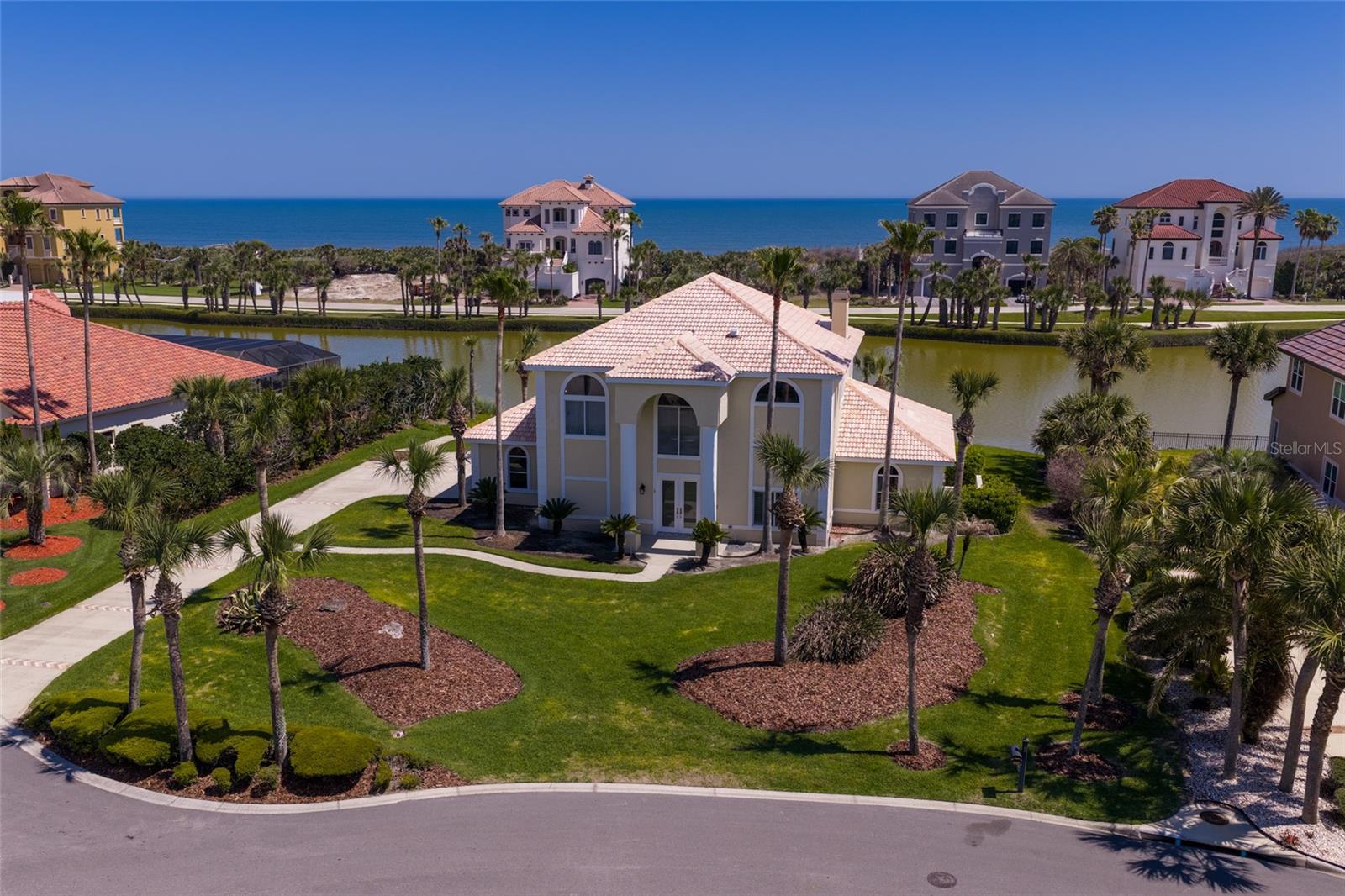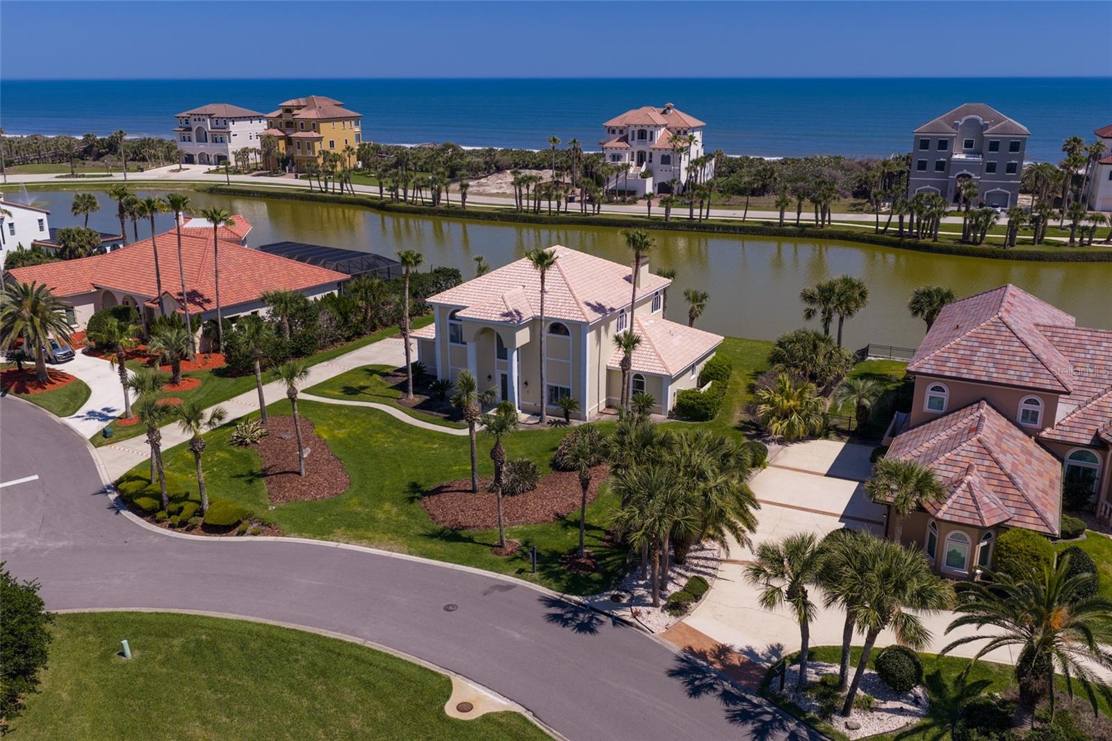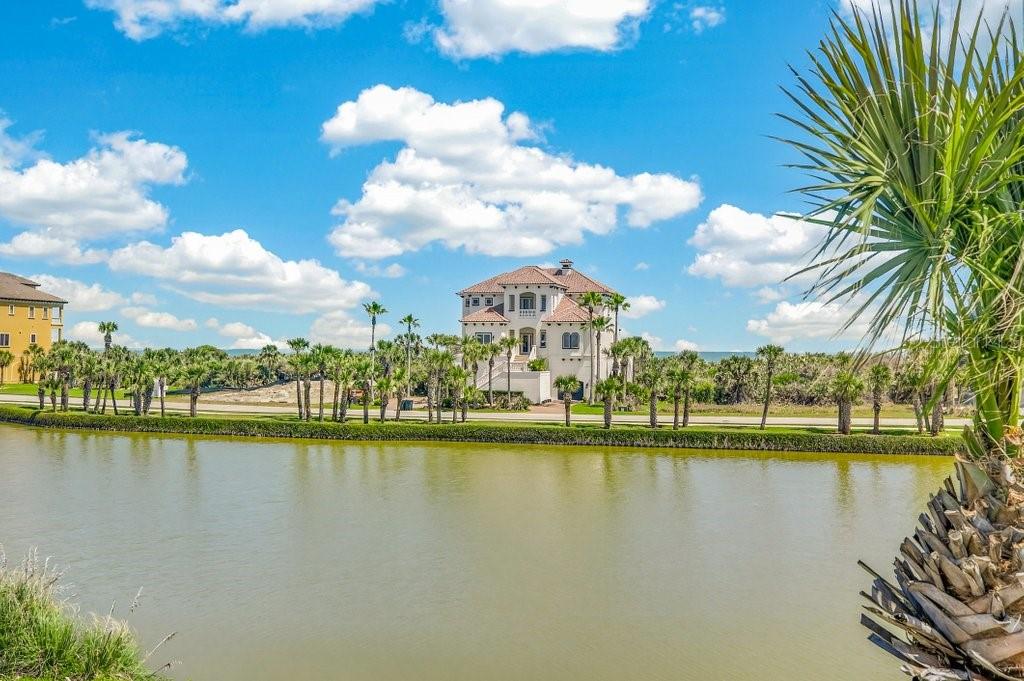 EXQUISITE LAKEFRONT OCEAN VIEW residence in the highly-coveted, gated community of HAMMOCK DUNES, just steps from the Atlantic Ocean with private beach access. From the moment you enter this custom home, expansive water views create an immediate sense of tranquility, immersing you in the natural beauty of this Audubon-certified coastal sanctuary. On the first level, two spacious guest rooms and two full bathrooms, plus a private den, open to a large family/media room with a custom wet bar, ideal for entertaining in relaxed coastal elegance. Ascend the dramatic staircase to the main living area with stunning ocean and lake views from every room. The great room featuring a cozy fireplace, flows seemlessly into the dining area and gourmet kitchen, designed for the modern chef with granite countertops and generous space for gatherings. The primary suite serves as a serene retreat, offering a spa-inspired bath and peaceful views of the surrounding landscape. Recent renovations have elevated this home to like-new condition, blending mediterranean architecture with classic style. Spacious 3-car garage provides abundant storage. Positioned on sought-after San Gabriel Lane within the revered Hammock Dunes community, residents enjoy private beach access and the quiet sophistication of coastal living at its best. Membership to the Hammock Dunes Club is available but not required and offers two championship golf courses, an oceanfront clubhouse with world class amenities including dining, fitness center, heated pool and spa, tennis, pickle ball, croquet and much more. This is more than a home-it's a private sanctuary where luxury, serenity, and seaside beauty exist in perfect harmony.