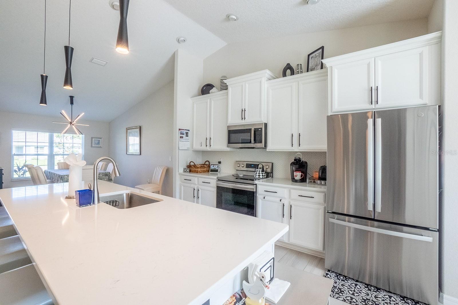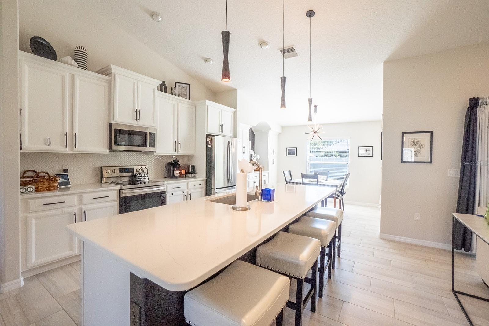 $30,000 PRICE DECREASE!!! SELLER IS READY TO RELOCATE Welcome to this stunning Seagate Willow model, a 3-bedroom, 2-bathroom home in a well-established, high-and-dry neighborhood that’s not in a flood zone. Only three years young, immaculate, smoke-free, and pet free, this concrete block home is better than new, with all the upgrades & smartly decorated, just what you’ve been dreaming of, is already completed. You can literally move right in without lifting a finger! Step inside and be greeted by vaulted ceilings and gorgeous ceramic faux wood tile flooring throughout the main living areas. The guest bedrooms and primary suite are carpeted for added comfort. The luxurious owner’s suite includes a spacious en suite bathroom, featuring a custom L-shaped dual-sink vanity with quartz countertops that are also found in the kitchen and both bathrooms. The gourmet kitchen is a showstopper, with sleek stainless steel appliances, neutral color pallet, built-in white cabinets, beautiful, backsplash, and a chic black accent wall by the coffee bar. This home is full of high-end touches, including $5,000 in custom lighting upgrades and more features than can be listed! The guest bathroom has been customized with gorgeous tile work and a sleek glass shower enclosure. You’ll love the versatile bonus room, perfect for use as an office, den, craft room, or even a playroom for the grandkids, complete with a closet for added storage. Just add a Murphy bed and you now have a third guest suite! Step outside to the extended covered lanai, which was built under the home’s roofline and now boasts a 6-inch concrete slab for extra space and durability. The retractable windproof awning ensures you’re covered in all weather conditions, automatically retracting in high winds. The large backyard is perfect for a future pool and is partially fenced—you only need to add your own posts and gates on either side for added privacy. Additional highlights include hurricane-rated double-pane windows, a whole-house water filtration system, water softener, an irrigation system keeping the upgraded grass lush, and Ring and Blink cameras over the garage and front door for added security. The stainless steel refrigerator was recently replaced, and the washer and dryer are conveniently set on pedestals in the laundry room, offering extra storage space. To top it off, some of the furniture and televisions are optional, making this home truly move-in ready. With so many upgrades already done, this is one not to miss! Schedule your showing today and make this dream home yours!