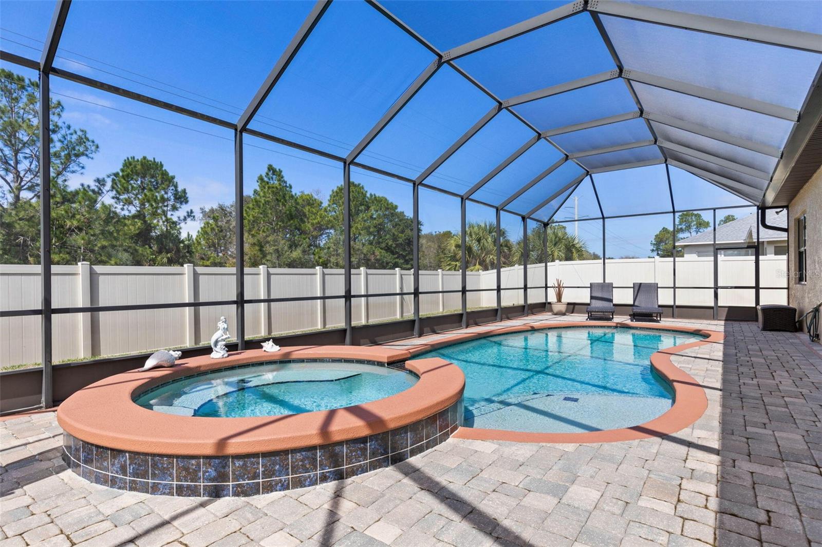 Discover a blend of luxury, comfort, and Florida living in this beautifully custom-built home, completed in August 2015 and thoughtfully upgraded throughout. Nestled in a quiet Palm Coast neighborhood, this 3-bedroom residence with an exceptional indoor-outdoor lifestyle just minutes from beaches, golf, and nature preserves. Step inside to find elegant finishes including crown molding, tray ceilings, and a seamless combination of porcelain tile flooring in the main living areas with engineered hardwood in the bedrooms. The spacious kitchen is designed to impress, featuring 42-inch cabinetry, granite countertops, and newer appliances including a refrigerator (2024) and dishwasher (April 2025). Impact-rated windows and sliding glass doors provide both energy efficiency and peace of mind. The primary suite serves as a private retreat, complete with a luxurious master bath designed for relaxation. Outside, your personal oasis awaits—an expansive screened lanai (fully re-screened in 2023) surrounds a 12x30 pool and hot tub, complemented by a fully equipped outdoor kitchen with a new gas stove (2025), amazing for entertaining year-round. Built with durability and efficiency in mind, the home features concrete block construction, a tile roof, gutters, a buried propane tank, and a well-fed irrigation system to keep the landscaping lush. Additional highlights include a paver patio, full alarm system, and insulated impact glass throughout. Located at 60 Fenimore Lane, this home puts you close to some of Palm Coast’s most desirable amenities. Enjoy quick access to pristine Atlantic beaches, scenic walking and biking trails along the Intracoastal Waterway, and world-class golf courses like Palm Harbor Golf Club. Nearby parks such as Washington Oaks Gardens State Park with stunning natural beauty, while European Village provides dining, shopping, and entertainment just a short drive away. With convenient access to both St. Augustine and Daytona Beach, you’re positioned to enjoy the best of coastal Florida living. This is more than a home—it’s a lifestyle.