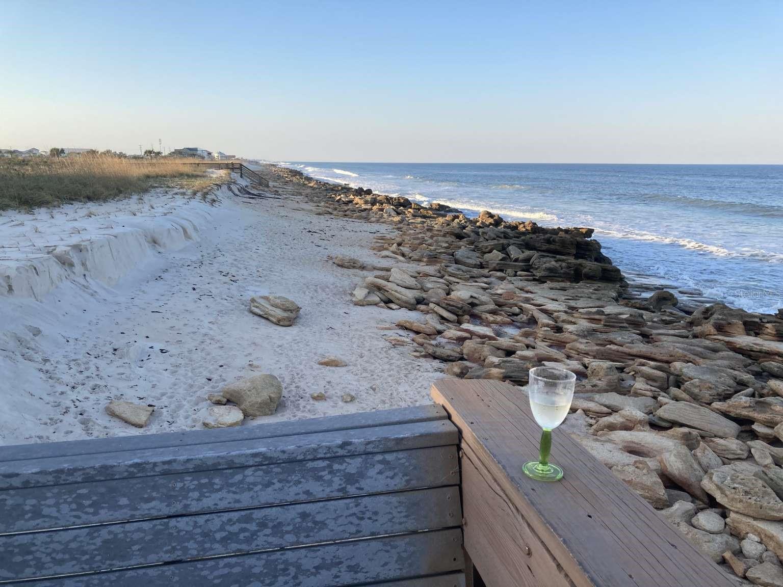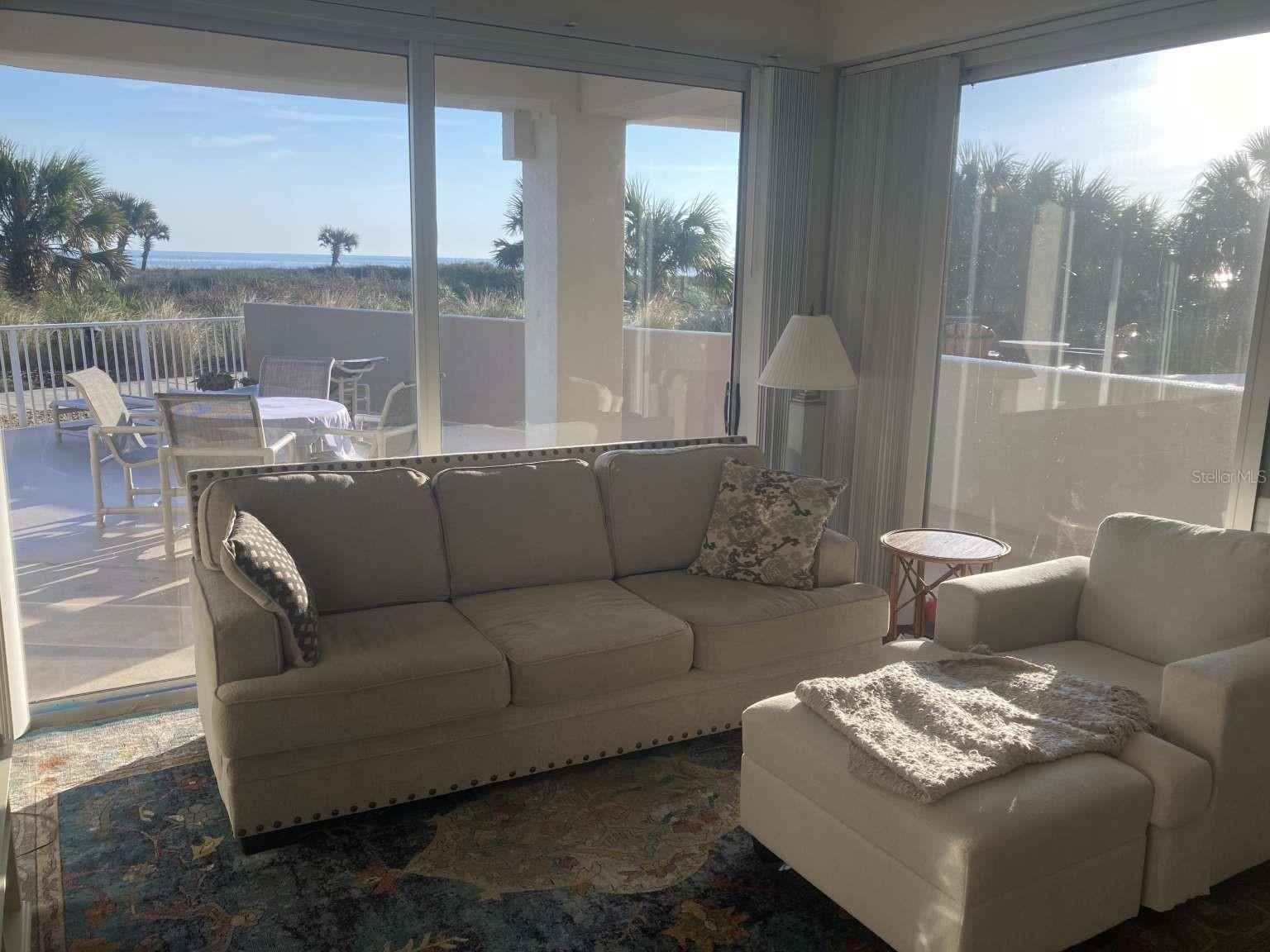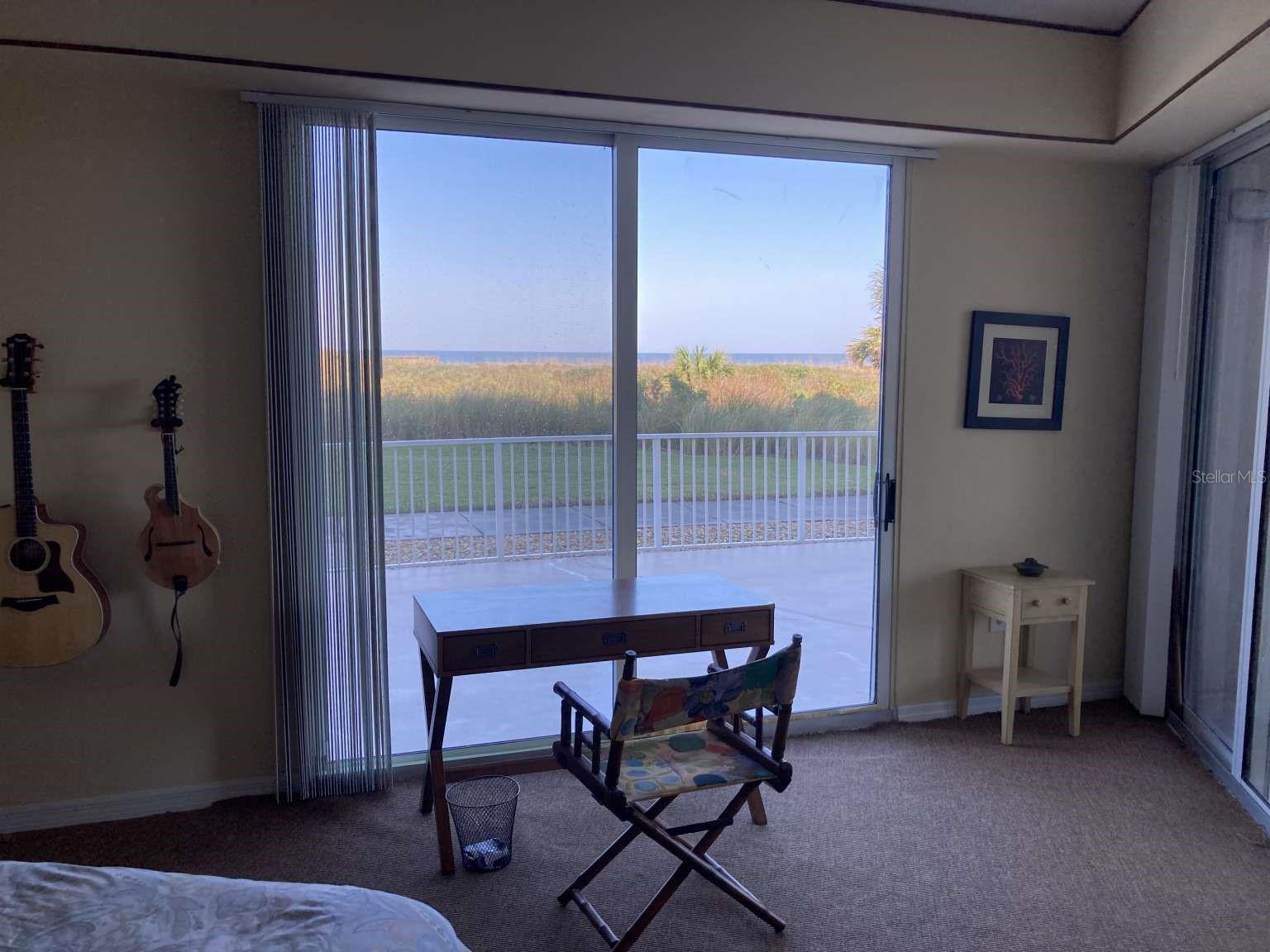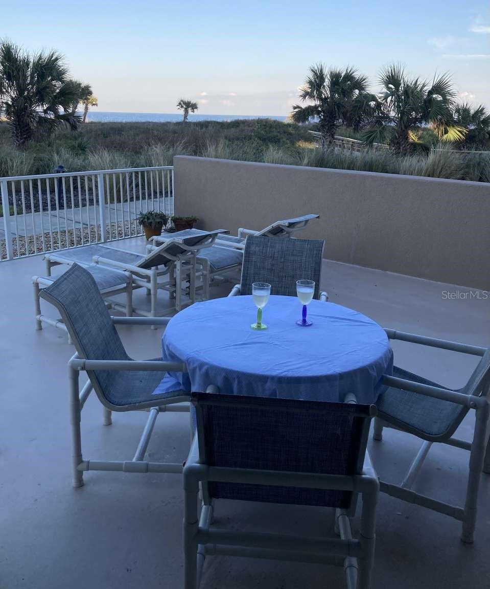 Ocean front condo with wide views of the water from 2 sliders in the living room and 2 sliders in the primary bedroom. Huge deck for games and entertaining or watch the sunrise or moonrise over the sea. Next to the boardwalk to the beach. Alcove to store beach toys and chairs. Remodeled kitchen with granite countertops and stainless steel appliances. Spacious primary bedroom has two walk-in closets and bathroom built for two. Second bedroom for guests or an office is next to a full bath. The building has its own heated pool for laps or a quick dip. Mantanzas Shores has two more pools, pickleball and tennis courts, and a fishing dock on the intracoastal as well as storage space for a kayak. The condo will be sold furnished. The building allows weekly rentals. Plenty of parking in the lot and in the garage.