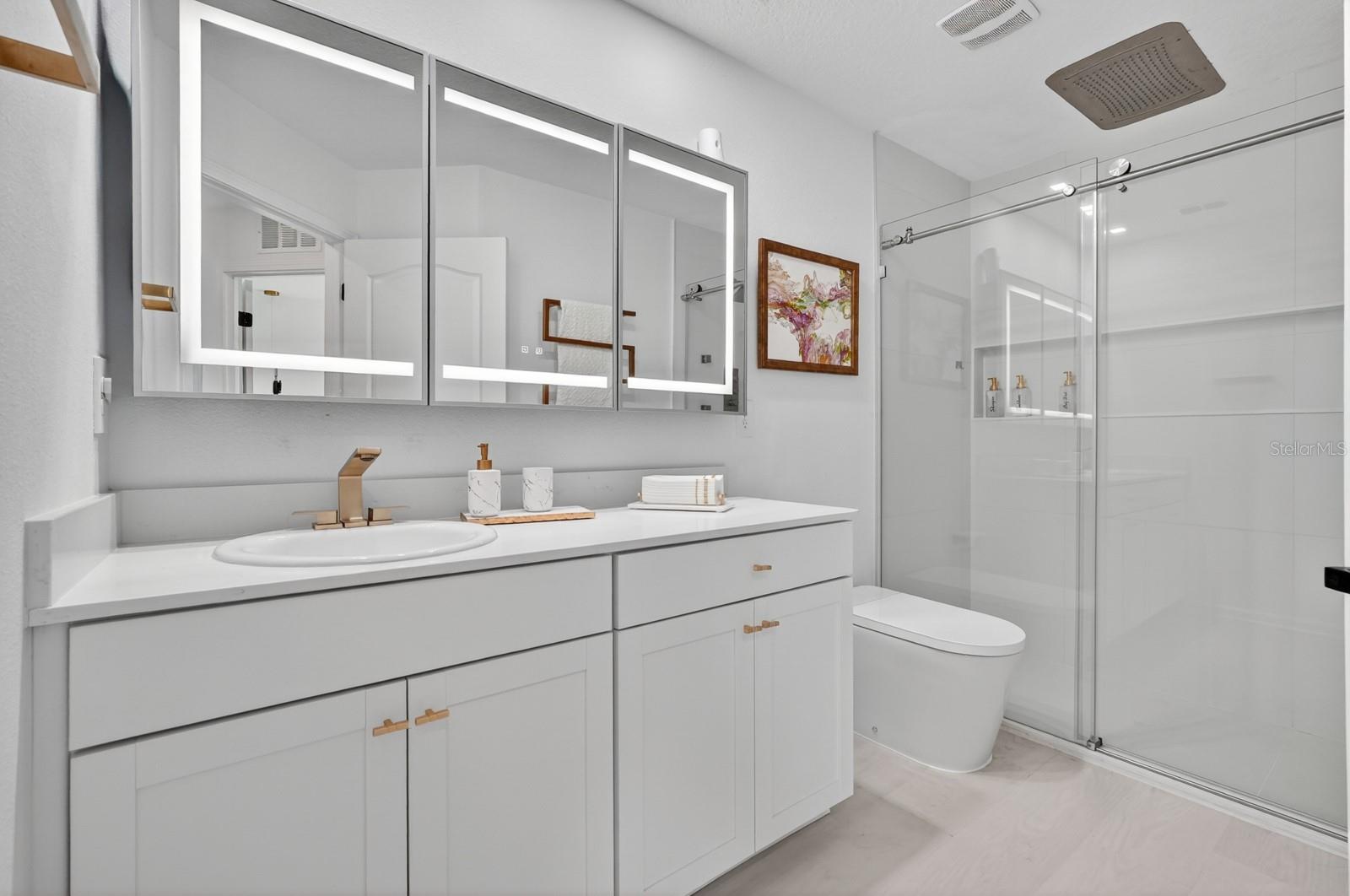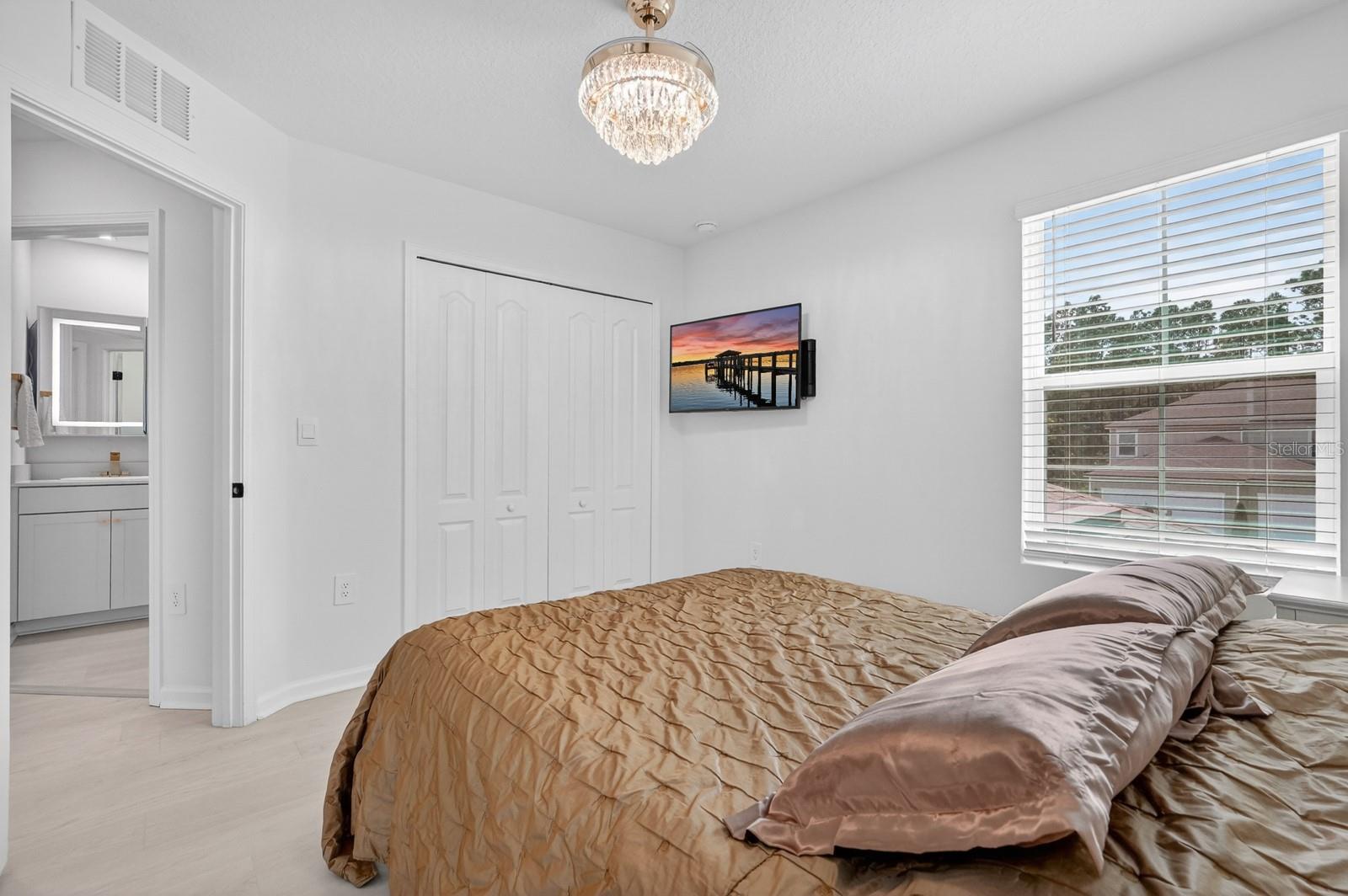 Fully upgraded 3-bedroom, 2.5-bath townhouse in the gated Trails community, offering modern finishes and a serene water view. This ~1,800 sq ft home stands out with luxury vinyl flooring throughout the entire second floor and staircase (no carpet) and completely renovated bathrooms featuring spa-style showers with dual rainfall systems, smart toilets, and LED-lit mirrors—rare upgrades at this price point. The open-concept layout flows into a private screened lanai overlooking a peaceful pond, creating an open and relaxing backdrop for everyday living. Additional updates include modern cabinet hardware throughout and a clean, move-in-ready interior. The low HOA covers lawn care and irrigation, providing a true low-maintenance lifestyle. Conveniently located just 11 miles from Flagler and Hammock Beach and within 30 minutes of St. Augustine and Daytona Beach.