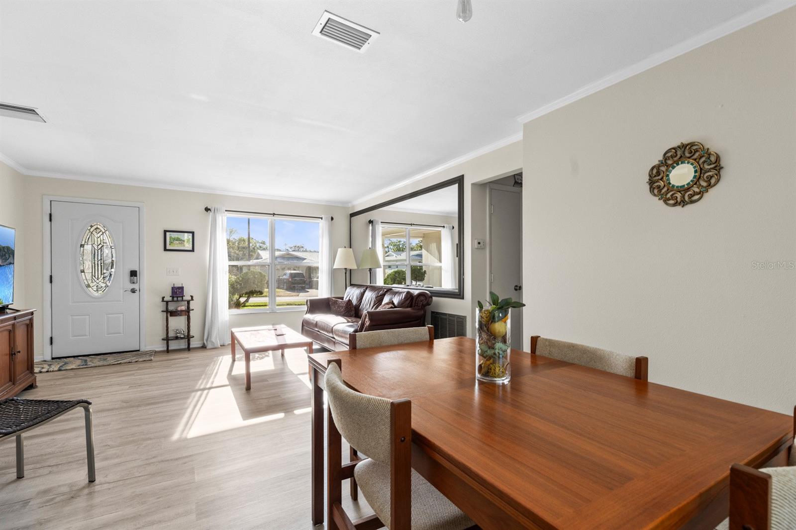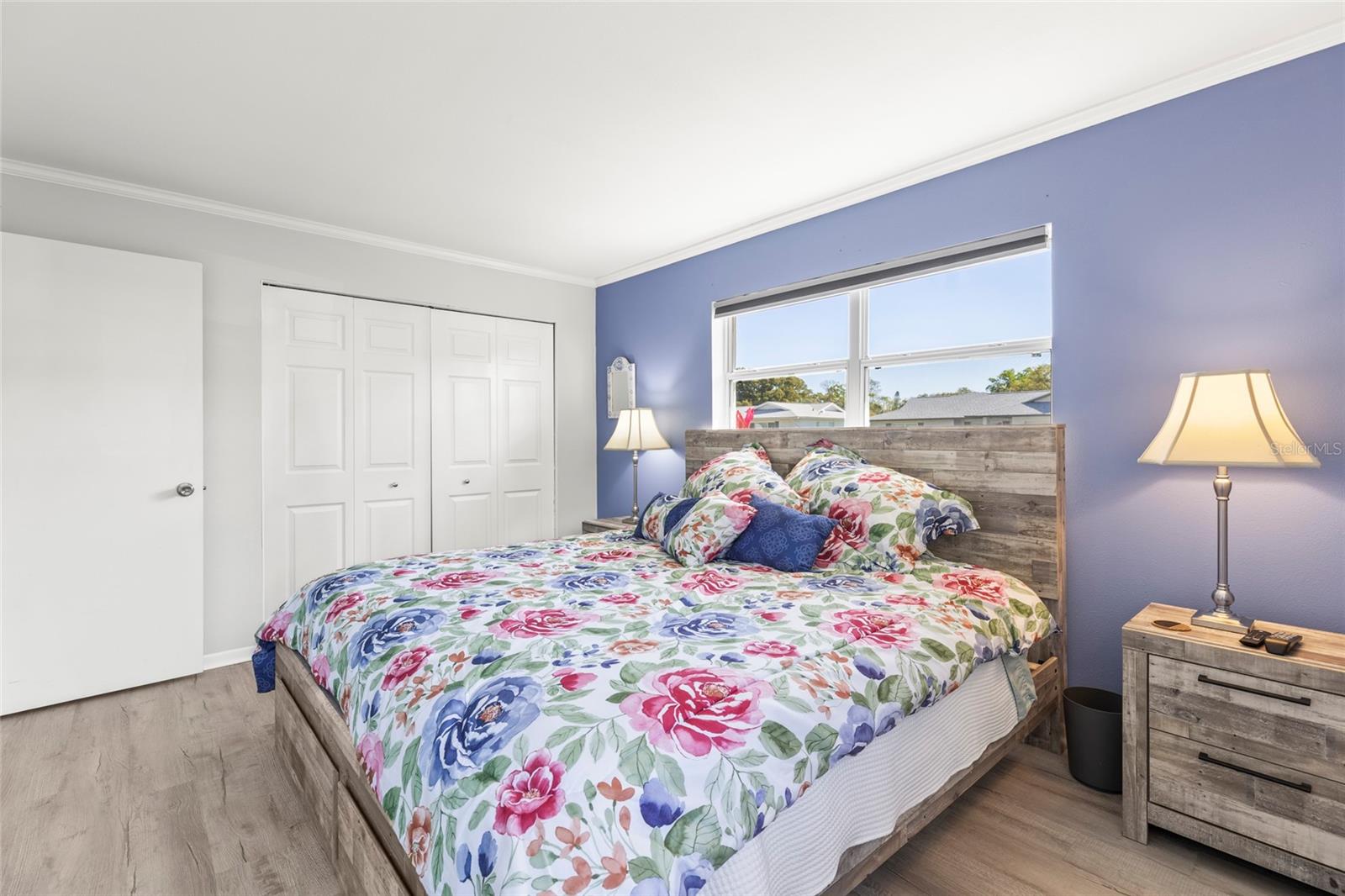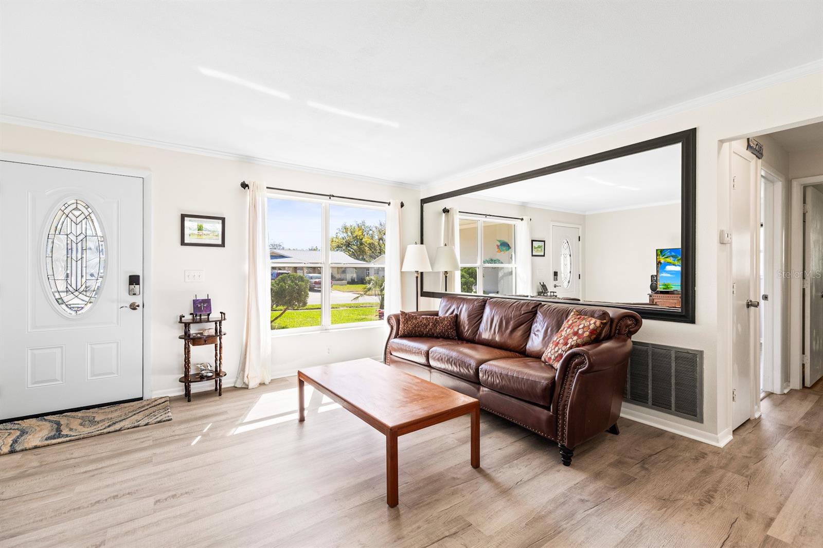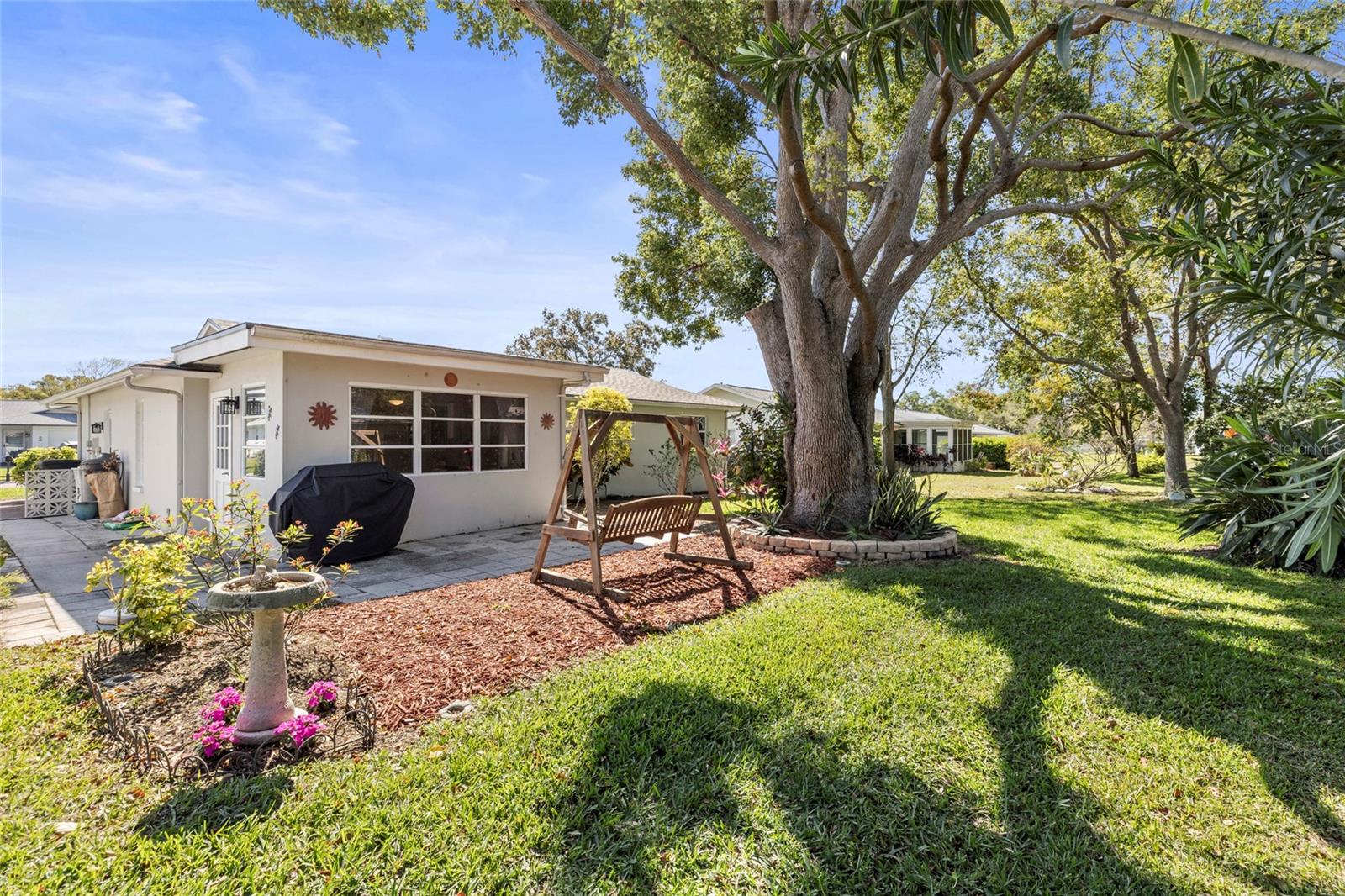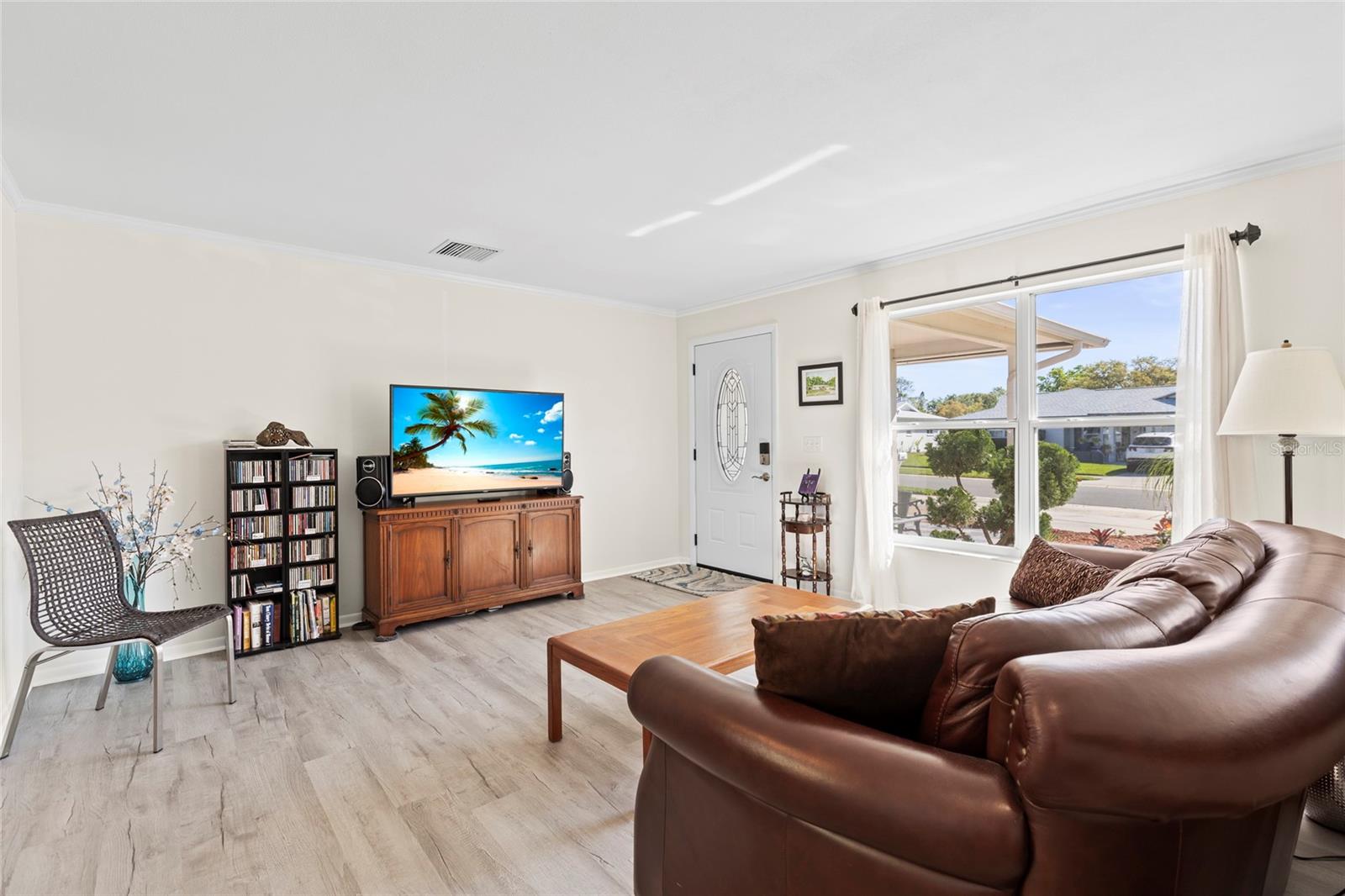 Time to Rediscover this Personality-Packed Palm Harbor Block Home with Tropical Charm NOW SHOWCASING Luxury Vinyl Plank flooring in both bedrooms, creating a cohesive finish to its upgraded style! Thoughtful renovations shine across the 2-bed, 1.5-bath, 1-car garage home with interior laundry and an extra parking pad. Plus, you’ll love the versatility of the enclosed and airy 140 sq ft FL Flex Room, offering extended living (not included in the main sq ft) built in wall A/C, ceiling fan and rustic tile, seamlessly creating flexible bonus space! This is where the lifestyle you’ve dreamed of meets the home you’ve been waiting for in this beautifully maintained residence in Highland Lakes, the premier 55+ active adult pet-friendly community on Lake Tarpon. Blending relaxation, recreation and resort-inspired living all wrapped into a low HOA! Vibrant lush landscaping with palms, colorful flowers, cacti, and two fruit-bearing pineapple plants welcomes you to your personal paradise on .16 acres. In (2023) the yard was resodded with St. Augustine and irrigation installed for easy upkeep. Well-cared-for Roofs (2018) and gutters provide years of remaining life with an attached eco-friendly Rain Barrel. Newer-style Windows with Storm Panels, in a highly elevated location Non-Flood Non-Evac Zone and Electrical/Plumbing updates provide peace of mind! As you enter the covered front patio, along a slate walkway, a graceful oval glass door offers refined convenience and secure keyless entry paired with a storm door for added light and safety. Step inside to waterproof vinyl, contemporary smooth ceilings, dimmable light fixtures, crisp crown molding and baseboards, all accented by fresh neutral paint. The open living/dining areas flow into the fabulous and functional kitchen, featuring top-tier stainless steel appliances, marble countertops, textured backsplash, water purification system (2024) and softener, garbage disposal, pass thru picturesque window to the lanai and a closet pantry behind a stained-glass art piece. Down the hall are two spacious bedrooms featuring (2023) custom built closets in both rooms and hallway closets for maximum storage. The king-sized primary with a lovely accent wall, generous light through its large windows and the equally light-filled 2nd bedroom accommodate a queen bed set with BRAND NEW LVP floors. The standout, full bath features a glass-enclosed walk-in marble shower, a stunning stained glass window, refreshing rainwater shower head and marble tile. Gleaming with a stylish vanity, modern well lit medicine cabinet and newly painted. Off the kitchen, are inside washer and dryer with cabinets, garage access, (2024) renovated half bath leading to the FL Flex Room, access to the shaded rear patio and serene backyard make this a true gem. It’s a Hole in One! 3 private executive golf courses = 27 holes of unlimited play anytime. Take a dip in 2 heated pools and unwind in the jacuzzi. The Lodge provides direct lake access for boating, fishing, pontoon tours & gated Boat/RV storage with a private ramp. The clubhouse hosts indoor/outdoor activities, fitness, book club, pickleball, bocce, tennis, arts & crafts, music, movies, dancing and much more! Once you’ve explored the countless attractions in the neighborhood check out all the local favorites. Whether you’re looking for year around living, seasonal escape, or a turnkey rental, this home checks all the boxes. Schedule your private tour today!