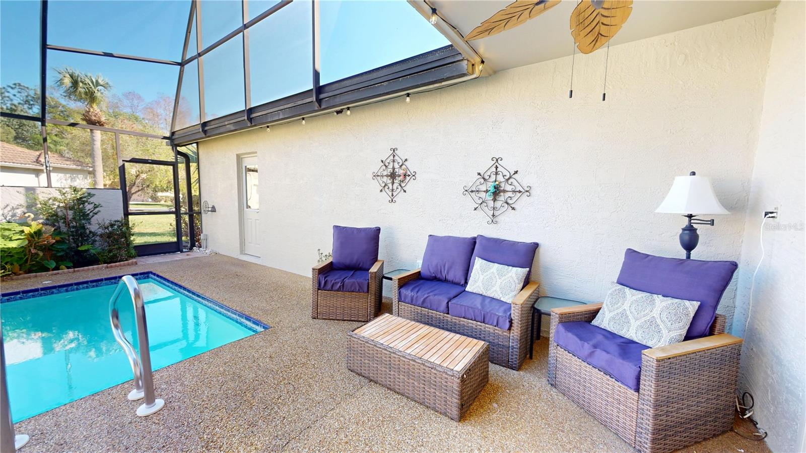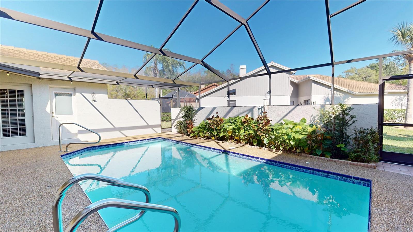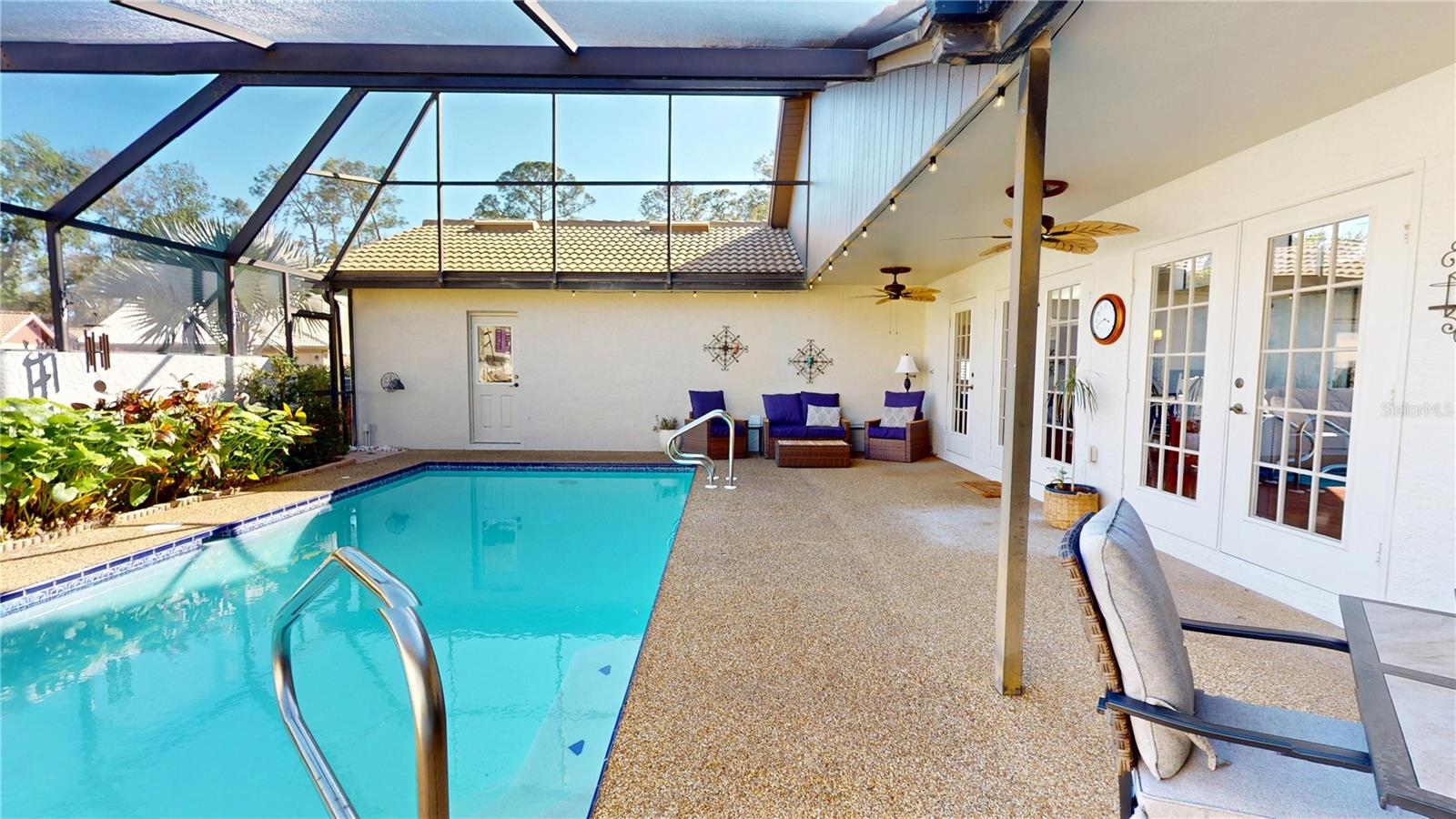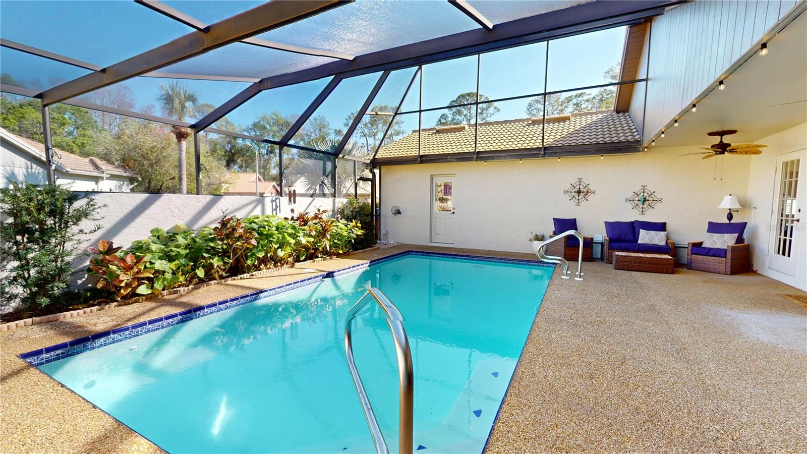 Maintenance free living is waiting in this gorgeous home located in highly desirable Chattam Landing! Natural light flows easily through the rooms with cathedral ceilings and French doors to the private, outdoor pool. The kitchen has been tastefully updated (June 2022) with quartz countertops, stainless steel appliances, and wood cabinets. Boasting 4 bedrooms (front bedroom is currently being used as an office) and two full baths, the use of space is amazing! The primary bedroom offers an ensuite with a walk-in shower, dual sinks, and private entrance to the pool and lanai area. Plantation shutters adorn the windows throughout the home. Recent upgrades include the tile roof (2018), water heater (2019), hurricane rated garage door (2021), and hurricane rated windows (2024). HVAC (2012) has been well maintained. WHOLE HOUSE GENERATOR that conveys with purchase. Chattam Landing HOA fees include lawn care, landscaping, and exterior maintenance of the home, all at a low monthly fee, and irrigation is well fed. Owners also enjoy the amenities of Ridgemoor, known for a variety of wildlife, a community park, tennis courts, and basketball courts. Please view our virtual tour at https://my.matterport.com/show/?m=wJN1zGLA7b6