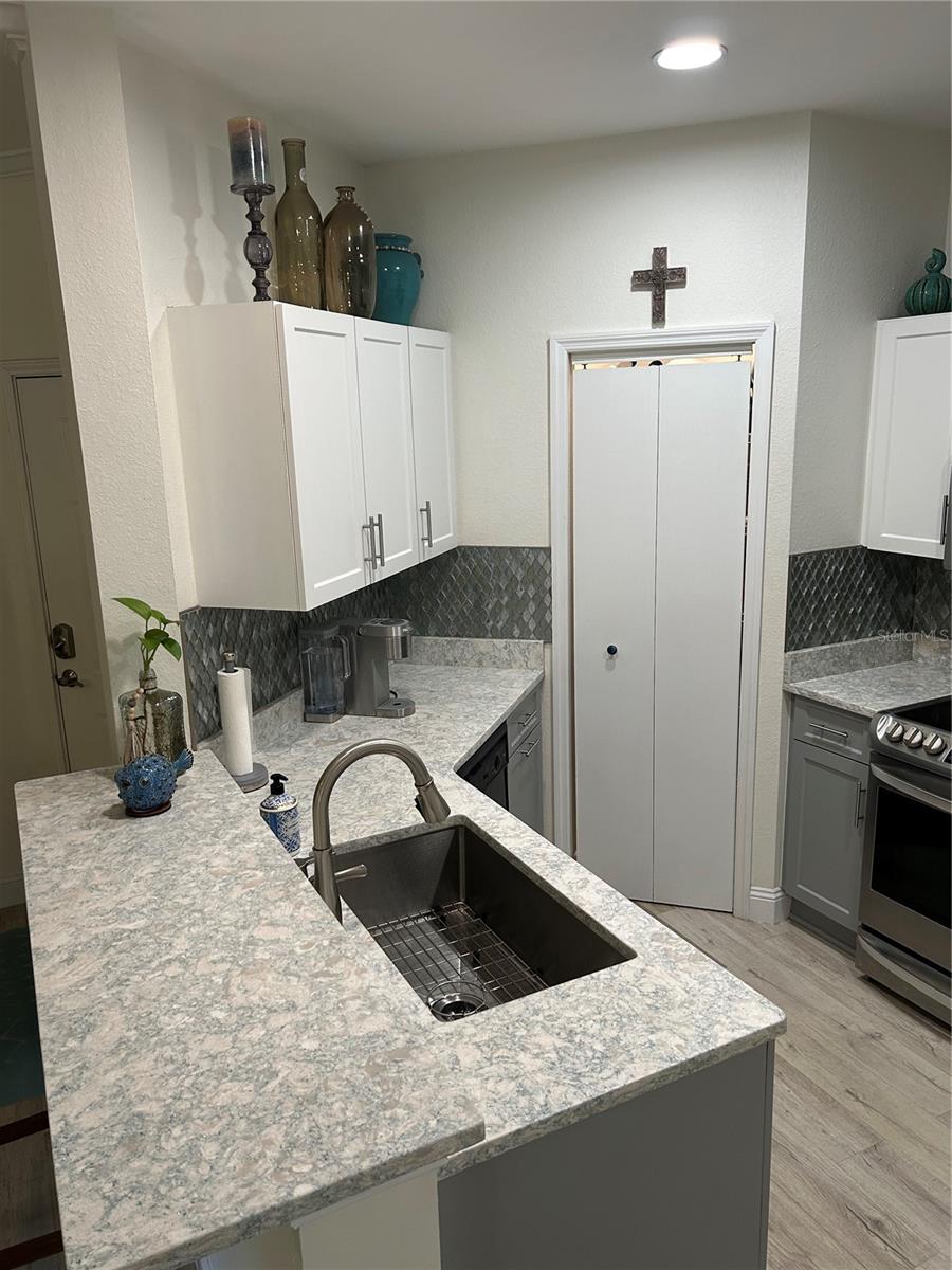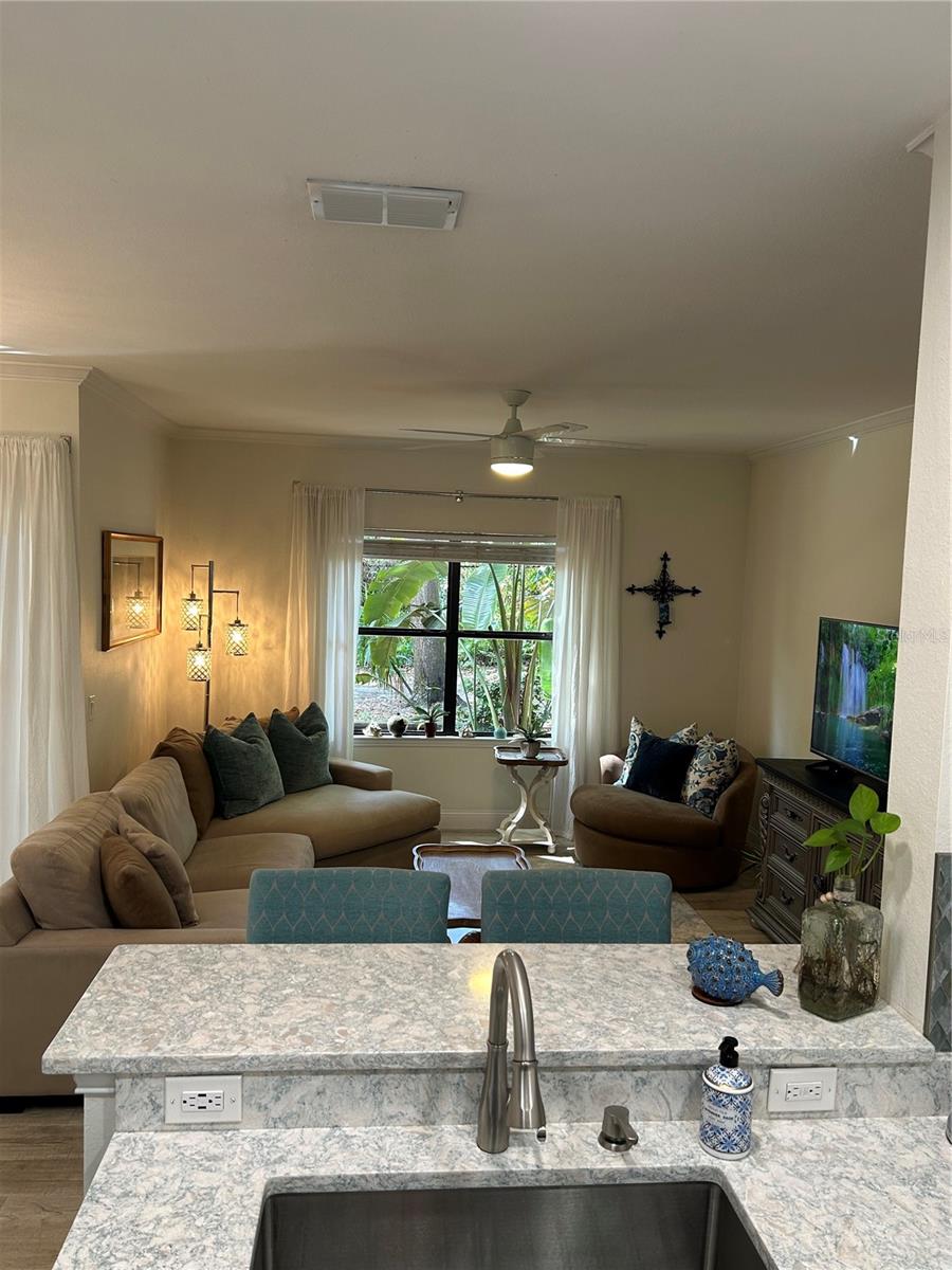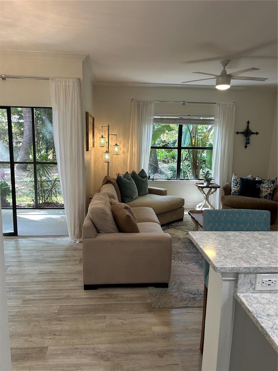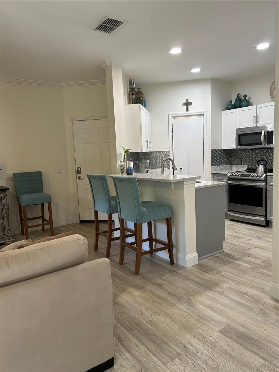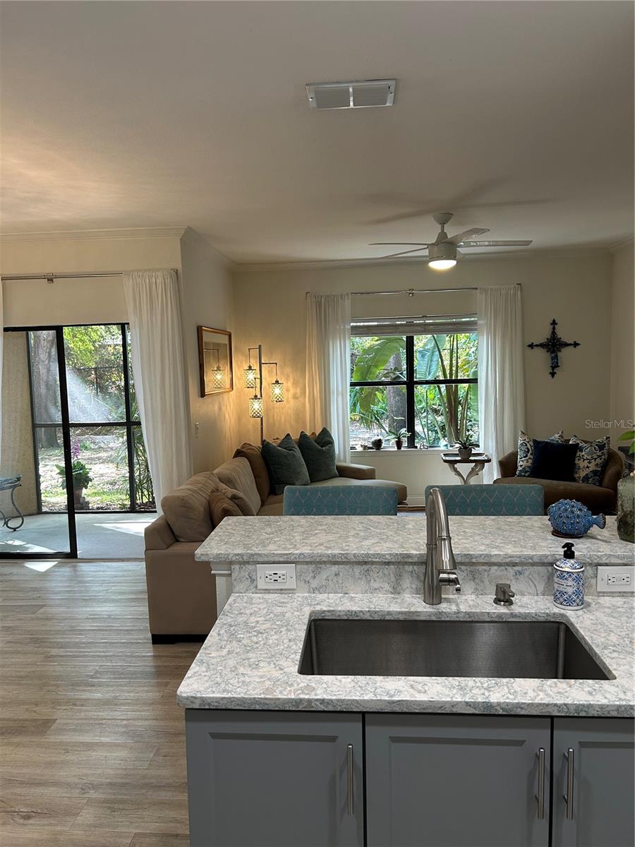 GATED Perfectly located clean, fresh, and bright 1st floor CORNER 1BR/1BTH unit in highly desirable Tuscany at Innisbrook Condo with its designated parking space. Full views of landscaped garden side of building from kitchen, living room, bedroom, and screened in patio. Home is move in ready – glorious kitchen Cambria Quartz counters and updated cabinets, professionally installed LVT throughout, water heater and Daikin 2 Ton A/C unit installed new in July of 2023. In unit laundry with washer and dryer that convey, LOW Monthly HOA which also includes internet, resort style amenities, access to two heated pools, one of which is a few steps from this unit and the other in adjacent part of the community. Beautifully landscaped with BBQ areas, dog park, ponds, tennis court, playground, fitness center, and more. Host friends and family in the guest suite at the club house nicely equipped with roomy space for small parties and gatherings, kitchen, business area and theater room. Near airports, beaches, Tarpon Springs, trails, parks and all the Tampa Bay area offers!