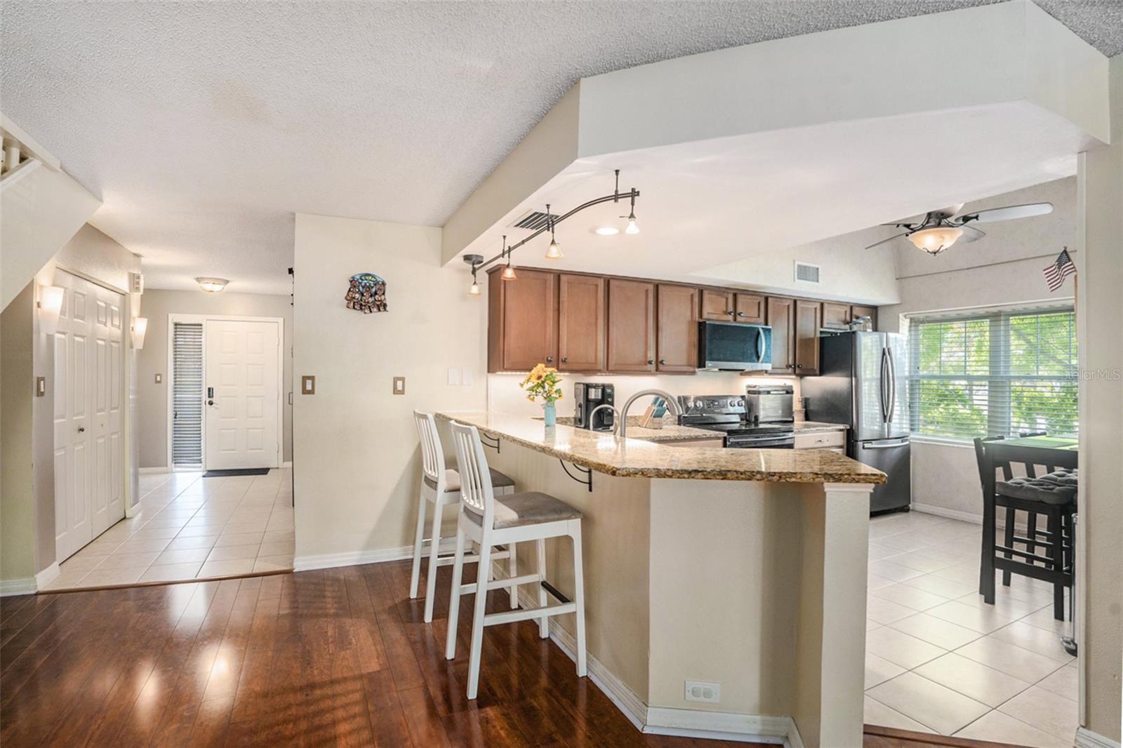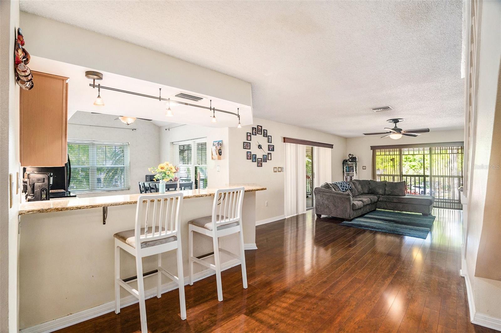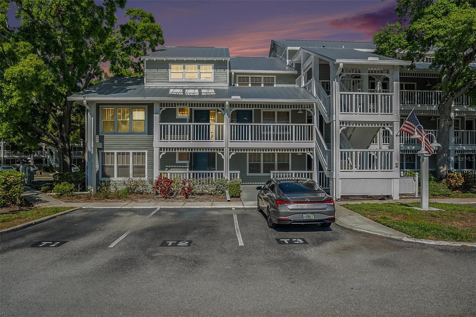 Welcome to this charming three-bedroom, three-bathroom end-unit condo in the desirable waterfront community of Dolly Bay in Palm Harbor. Situated on the second floor, this spacious home spans over 2,000 sq ft across three stories, providing the perfect balance of privacy and resort-style living. The building also features an elevator for easy access to the second floor. Upon entering, you'll be greeted by a welcoming foyer with a closet and an under-the-stairs nook for additional storage. The living room boasts beautiful wood floors and a large wrap-around balcony, fully screened to let you enjoy the Florida weather. Perfect for entertaining or relaxing, this outdoor space extends your living area and enhances the home’s appeal. The kitchen is a chef’s dream, complete with granite countertops, a breakfast bar, matching appliances, and an abundance of cabinetry for all your storage needs. A cozy breakfast nook provides a perfect spot to enjoy your morning coffee or casual meals. The primary bedroom is a peaceful retreat with high vaulted ceilings and an attached bathroom featuring extra storage space. The two additional bedrooms, also located on the second floor, are spacious and offer vaulted ceilings, creating an open and airy feel. All three bedrooms are well-sized and ideal for loved ones, guests, or a home office setup. The third floor offers a versatile loft space, which can be transformed into a fourth bedroom, office, playroom, or whatever suits your lifestyle. The condo also comes with an in-unit washer and dryer for added convenience. Dolly Bay offers a range of resort-style amenities, including direct access to Lake Tarpon, with boat slips available for annual rent (subject to availability). Enjoy a heated pool, clubhouse, tennis courts, an outdoor grill area, and a dock perfect for fishing and boating. The HOA fee covers water, sewer, trash, and more, ensuring low-maintenance living. Located in a prime Palm Harbor location, you’ll be close to a variety of dining options, shopping centers, and a quick drive to Downtown Palm Harbor with its charming local restaurants and breweries. Gulf Beaches are just a short drive away, making it easy to enjoy the best of Florida living. Don't miss out—schedule a showing today and experience everything this exceptional property has to offer!