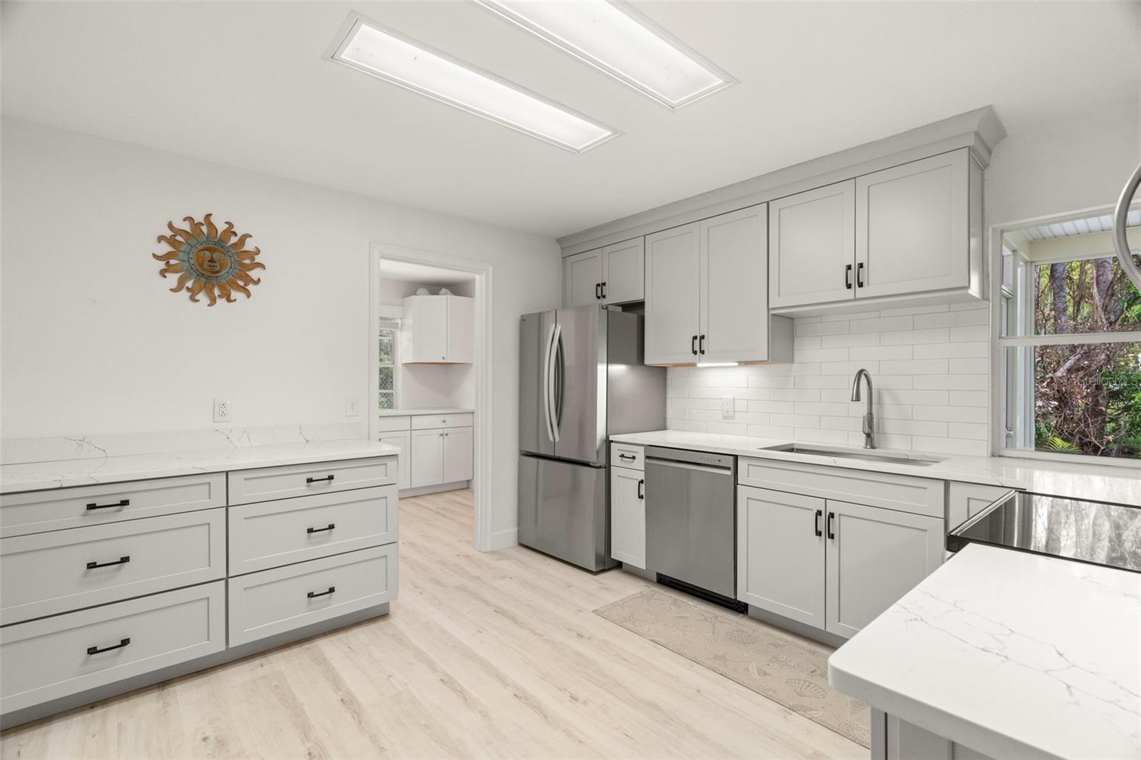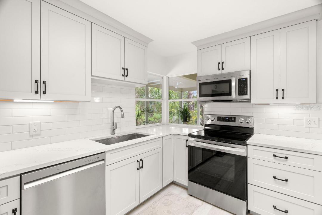OZONA...Beautifully updated 2 bedroom - 2 bath home in the heart of Pinellas County's premier waterfront community. Private corner lot with 160' of frontage. Room for your boat and RV. NO HOA RESTRICTIONS. New luxury vinyl plank flooring in all rooms. New kitchen with custom shaker solid wood cabinets and quartz countertops. New LG appliances, refrigerator, dishwasher, microwave, and range. Large pantry. Laundry room has new Maytag washer and dryer with a 6' quartz countertop and new upper and lower shaker cabinets. New water heater. Primary bedroom with updated bath - glass walkin shower and vanity with a graite top. Walkin closets. Guest bedroom also has updated bath with new vanity and granite top. SUNNY TROPICAL LANIA. OLD FLORIDA LIVING AT IT'S VERY BEST. JUST MOVE RIGHT IN !