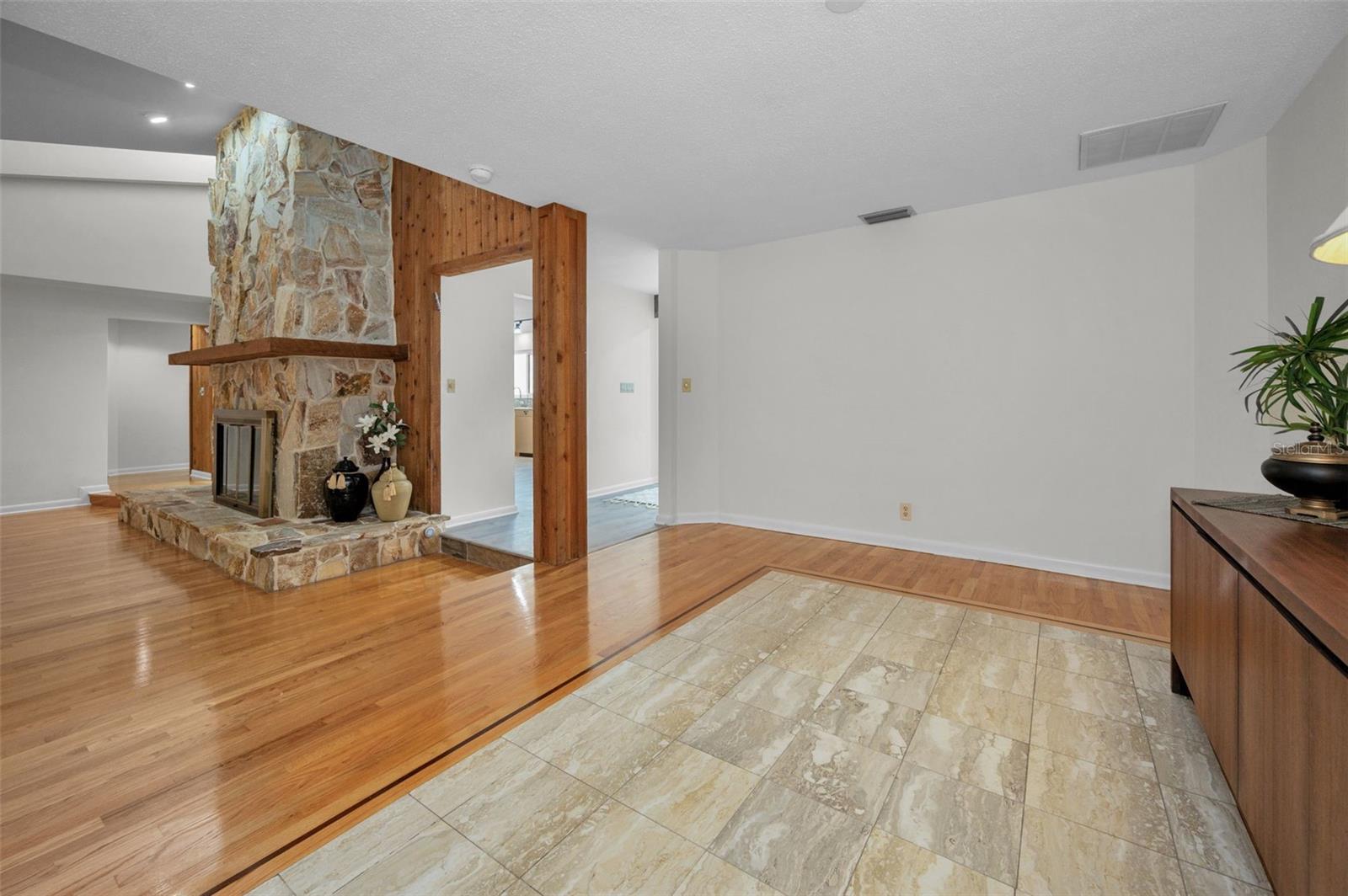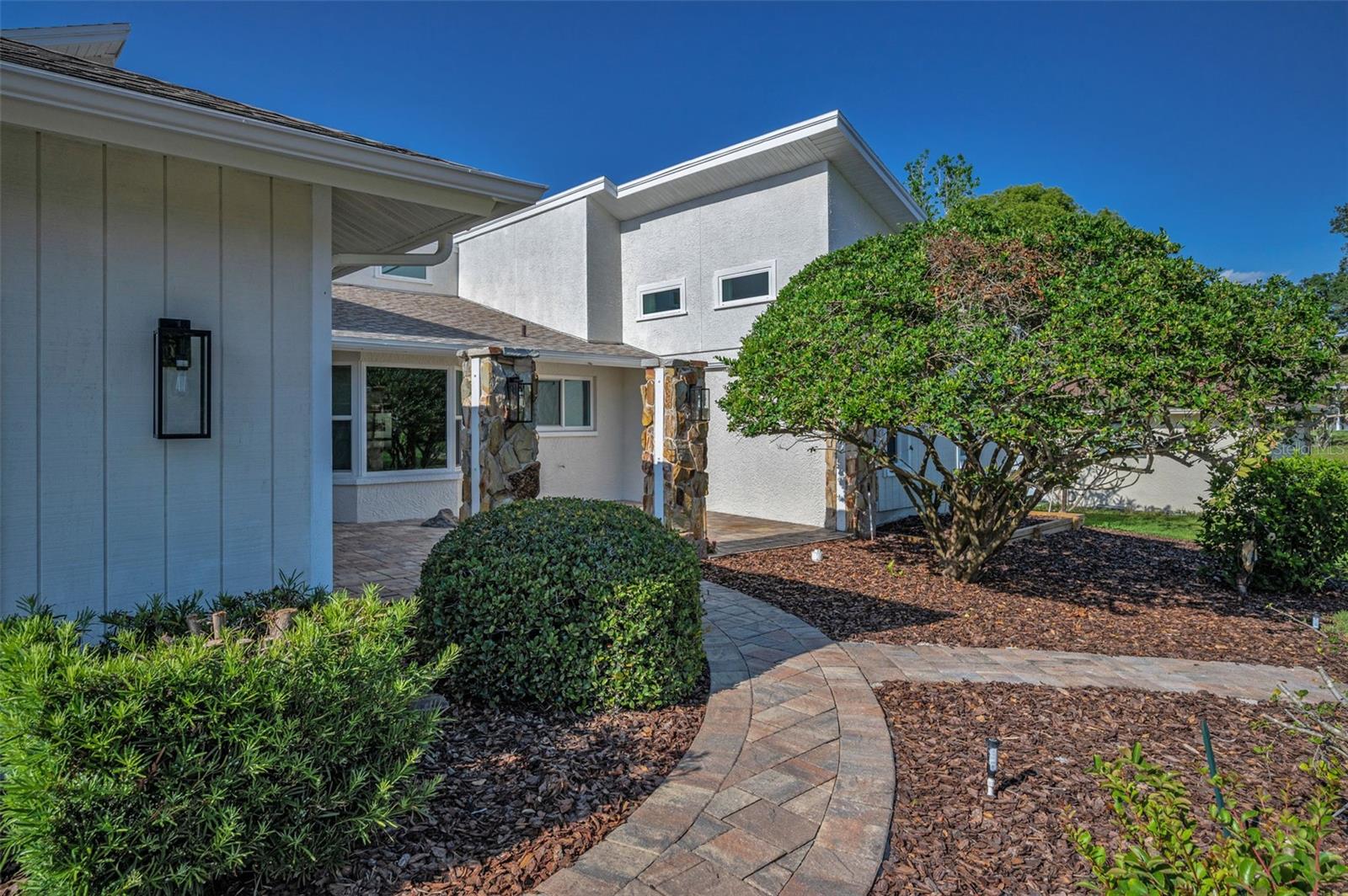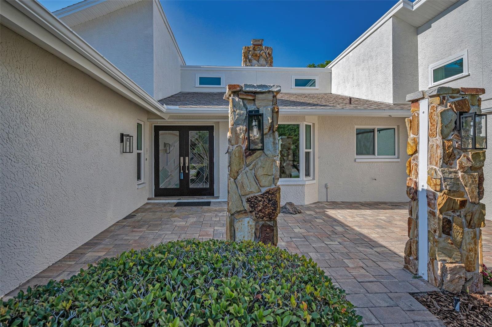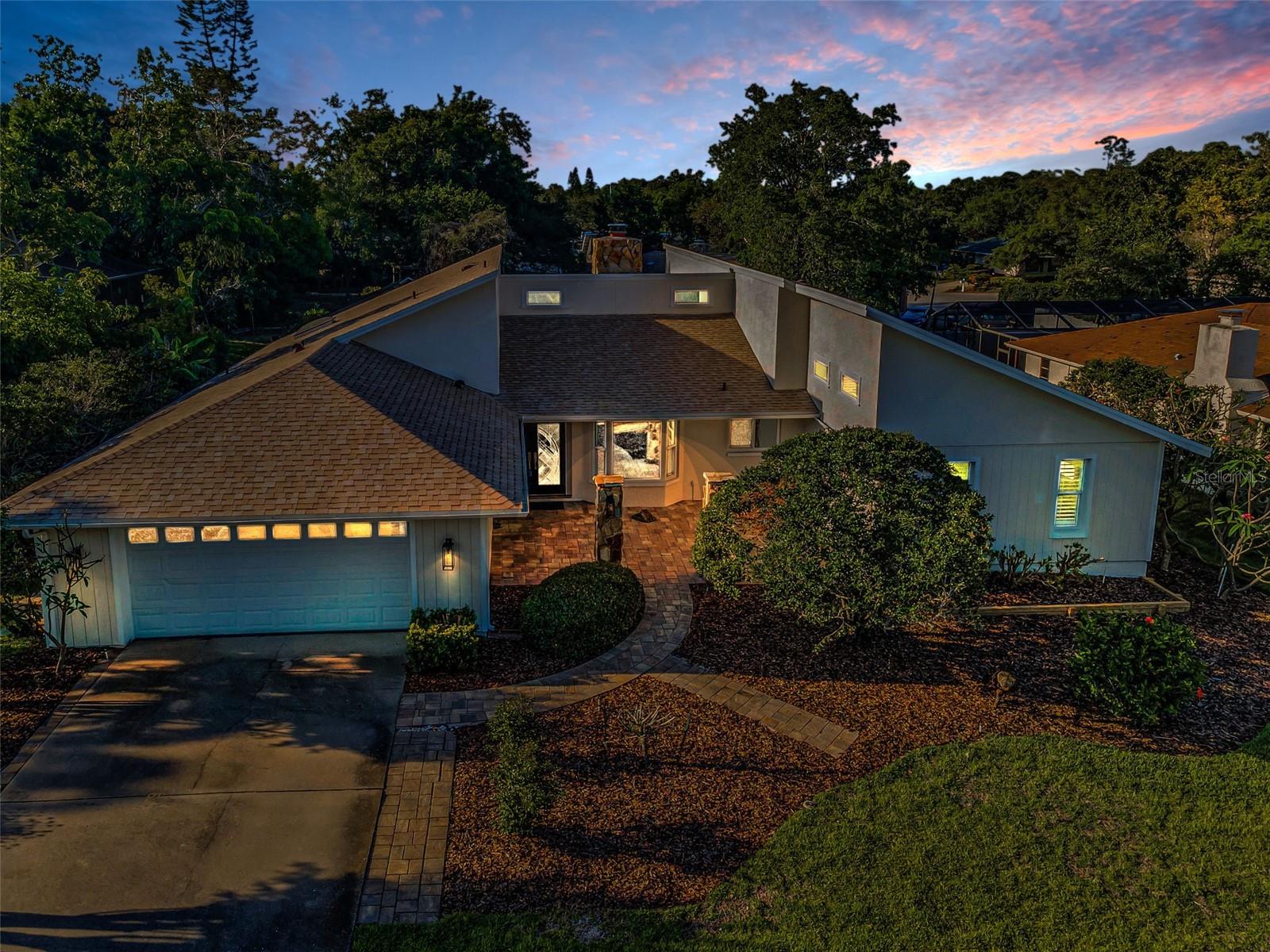One or more photo(s) has been virtually staged. Back on the market due to Buyer's financing! Boasting myriad updates including NEW exterior coach lights (2025), NEW roof and flat roof (2024), NEW exterior and interior paint (2024), NEW landscaping (2025), NEWER HVAC (2023), NEWER hot water heater and electrical panel, and NEWER windows (2018), this 4 bedroom/3.5 bath home sits on a 0.2686-acre lot and shines with architectural interest -- inside and out. A sweeping pavered courtyard introduces the stunning stained glass double door entry. Inside, solid wood floors gleam beneath the living room’s vaulted ceilings while the two-sided, wood burning fireplace warms both the living room and the kitchen. A sunken bonus room is nestled behind the living room revealing a wall of sliders to access the alfresco space. Ideal as the dance floor for your next party or as a home entertainment area (large enough for a pool table), this room features lovely light, a wet bar, and a wine frig concealed behind decorative cabinets. The separate formal dining room was treated to a spectacular inlaid tile design in its hardwood flooring. As for the spacious eat-in kitchen, a center island with a sink is surrounded by gorgeous cabinetry and an amazing wall of built-in cabinets furnished with glass. Ample shelving above the fireplace is perfect for displaying treasured mementos. Stainless appliances and track lighting complete this welcoming picture. The expansive master suite is beautifully appointed with a skylight, its own set of sliders to the pool (hidden behind plantation shuttered doors), and a large walk-in closet outfitted with plenty of glorious storage space including sets of drawers, baskets, and shoe ledges. The ensuite is decked out like a spa with a deep, jetted tub, dual sinks, heated towel bars, and a shower room accented with glass block and multi-directional shower heads. The three-way split of the remaining three bedrooms offers privacy to guests and family members. All the bedrooms are filled with Florida sunshine. The second and third bedrooms have great walk-in closets and share a Jack and Jill bathroom. The fourth bedroom presents with its own bath that also leads out to the pool and the hot tub on the screened lanai. Besides a whole house vacuum system and a wonderful laundry room, this unique home has been very well maintained. In this lush and leafy community, Westlake Village offers a variety of amenities like a clubhouse, park, playground, pool, walking trail, picnic areas, and tennis/basketball courts. The school district is also highly rated. All this beauty in sought-after Palm Harbor, one of the jewels of Pinellas County.