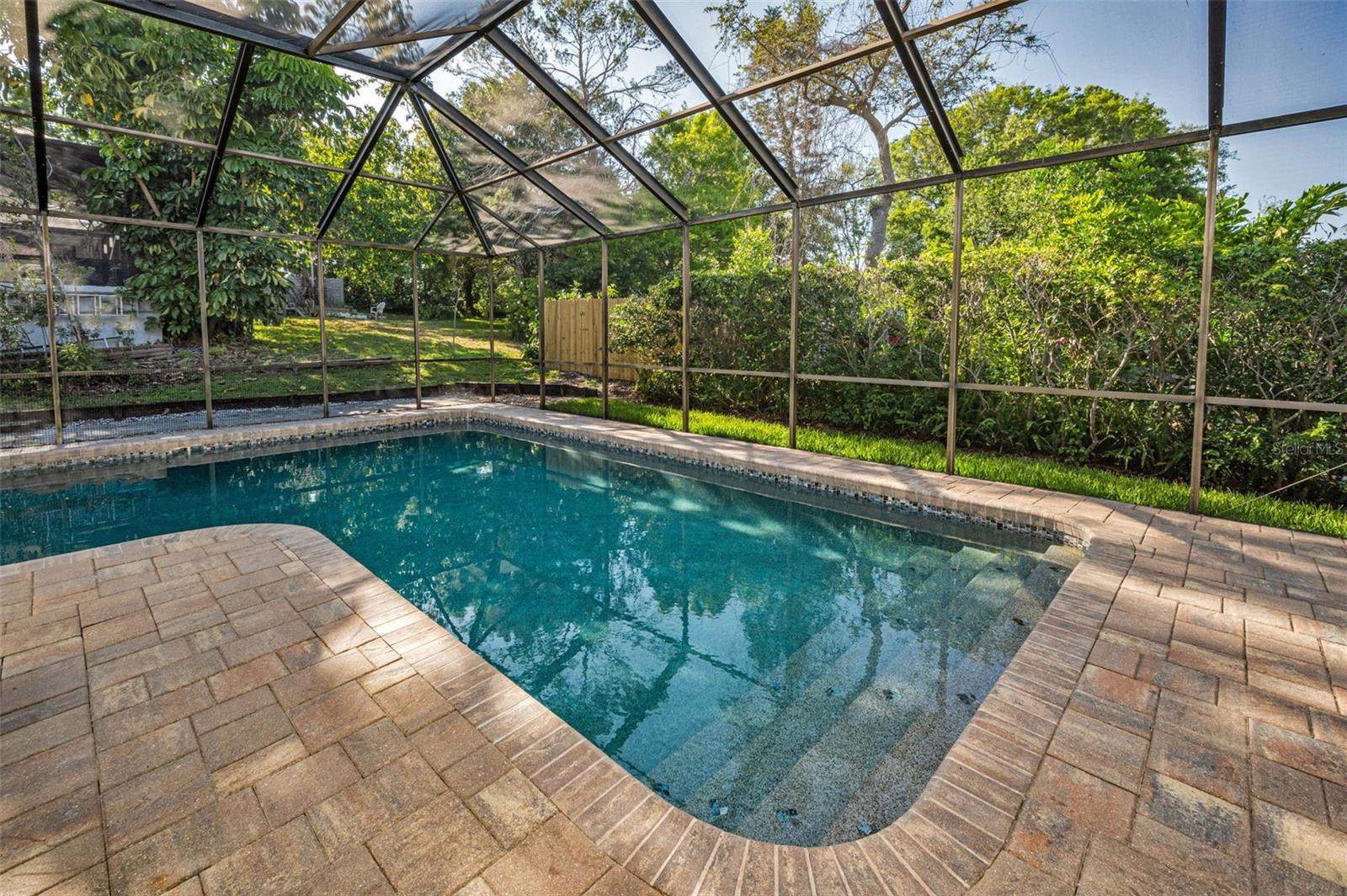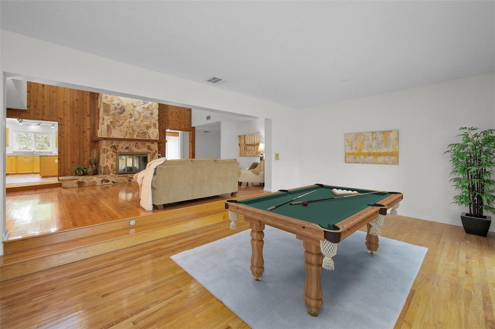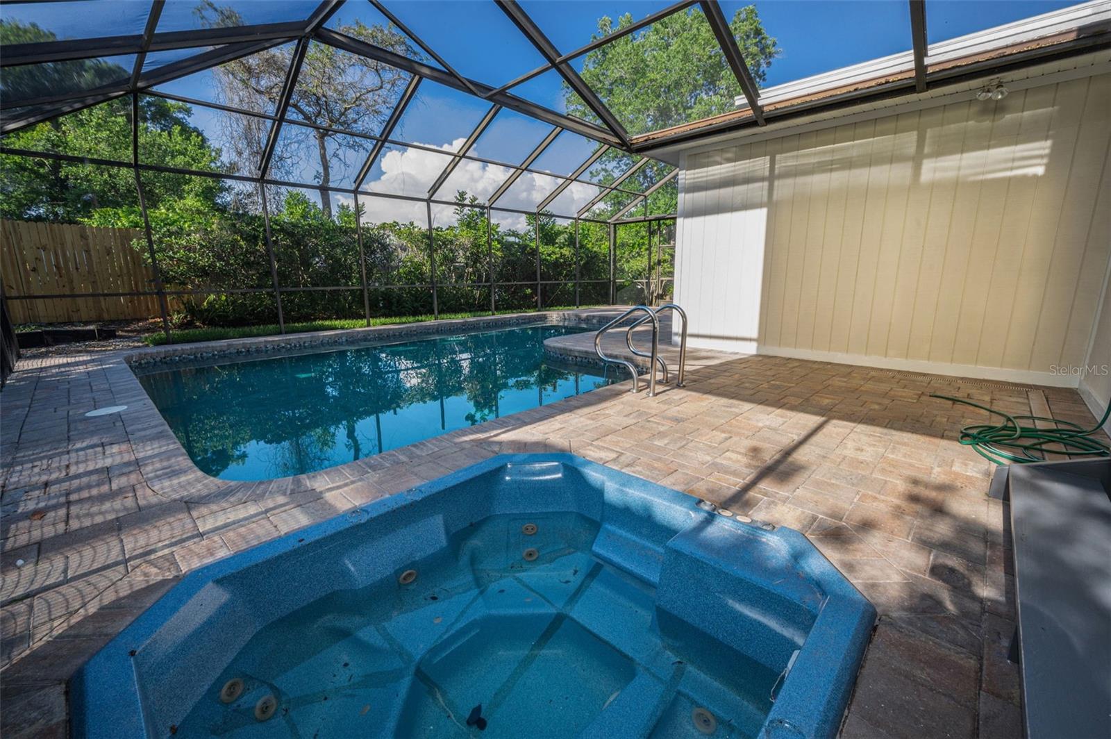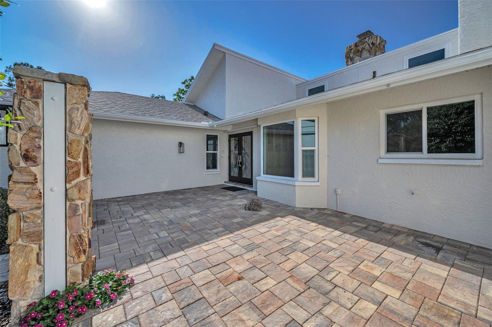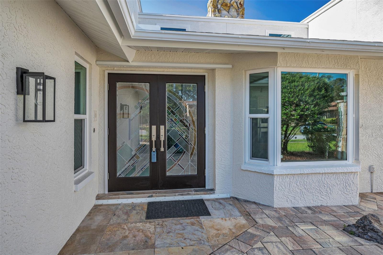 One or more photo(s) has been virtually staged. Back on the market due to Buyer's financing! Boasting myriad updates including NEW exterior coach lights (2025), NEW roof and flat roof (2024), NEW exterior and interior paint (2024), NEW landscaping (2025), NEWER HVAC (2023), NEWER hot water heater and electrical panel, and NEWER windows (2018), this 4 bedroom/3.5 bath home sits on a 0.2686-acre lot and shines with architectural interest -- inside and out. A sweeping pavered courtyard introduces the stunning stained glass double door entry. Inside, solid wood floors gleam beneath the living room’s vaulted ceilings while the two-sided, wood burning fireplace warms both the living room and the kitchen. A sunken bonus room is nestled behind the living room revealing a wall of sliders to access the alfresco space. Ideal as the dance floor for your next party or as a home entertainment area (large enough for a pool table), this room features lovely light, a wet bar, and a wine frig concealed behind decorative cabinets. The separate formal dining room was treated to a spectacular inlaid tile design in its hardwood flooring. As for the spacious eat-in kitchen, a center island with a sink is surrounded by gorgeous cabinetry and an amazing wall of built-in cabinets furnished with glass. Ample shelving above the fireplace is perfect for displaying treasured mementos. Stainless appliances and track lighting complete this welcoming picture. The expansive master suite is beautifully appointed with a skylight, its own set of sliders to the pool (hidden behind plantation shuttered doors), and a large walk-in closet outfitted with plenty of glorious storage space including sets of drawers, baskets, and shoe ledges. The ensuite is decked out like a spa with a deep, jetted tub, dual sinks, heated towel bars, and a shower room accented with glass block and multi-directional shower heads. The three-way split of the remaining three bedrooms offers privacy to guests and family members. All the bedrooms are filled with Florida sunshine. The second and third bedrooms have great walk-in closets and share a Jack and Jill bathroom. The fourth bedroom presents with its own bath that also leads out to the pool and the hot tub on the screened lanai. Besides a whole house vacuum system and a wonderful laundry room, this unique home has been very well maintained. In this lush and leafy community, Westlake Village offers a variety of amenities like a clubhouse, park, playground, pool, walking trail, picnic areas, and tennis/basketball courts. The school district is also highly rated. All this beauty in sought-after Palm Harbor, one of the jewels of Pinellas County.