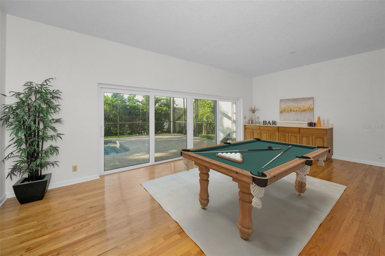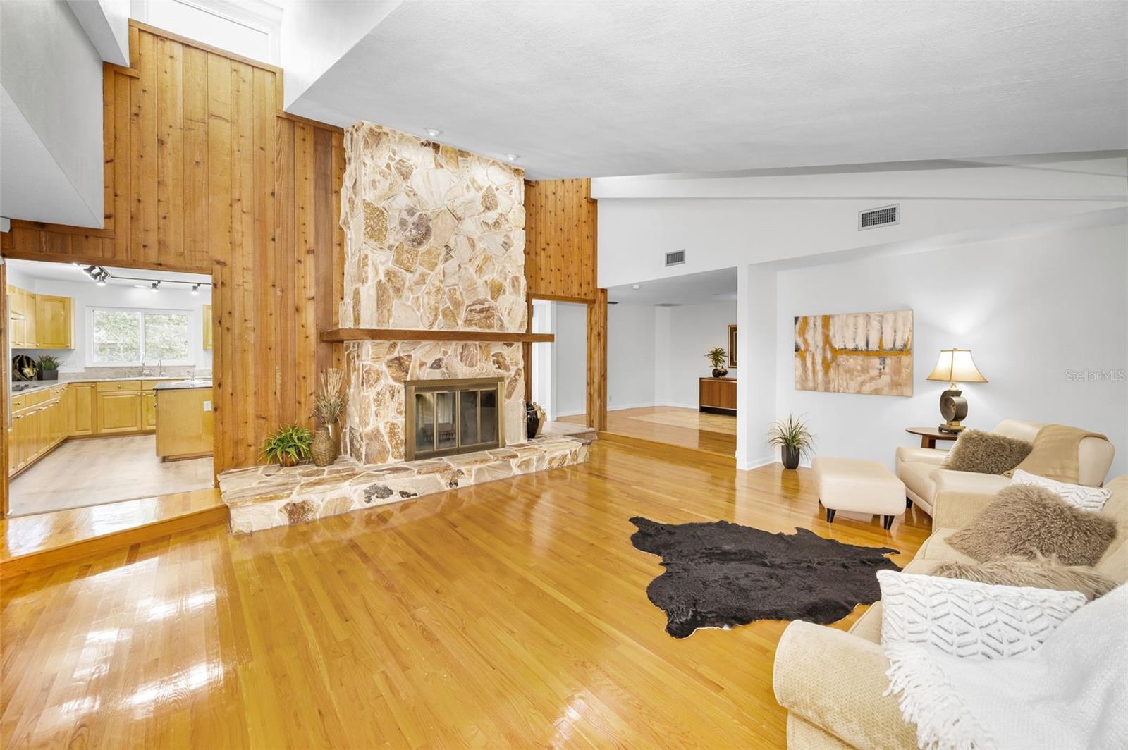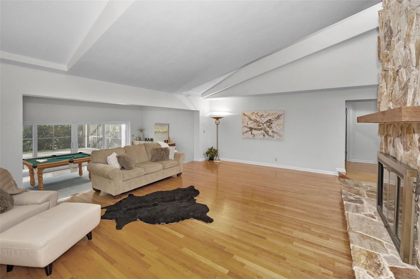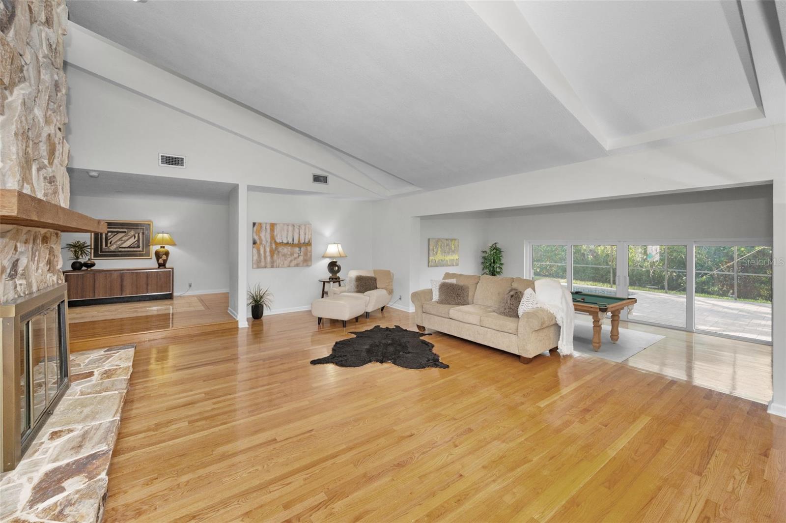 One or more photo(s) has been virtually staged. Back on the market due to Buyer's financing! Boasting myriad updates including NEW exterior coach lights (2025), NEW roof and flat roof (2024), NEW exterior and interior paint (2024), NEW landscaping (2025), NEWER HVAC (2023), NEWER hot water heater and electrical panel, and NEWER windows (2018), this 4 bedroom/3.5 bath home sits on a 0.2686-acre lot and shines with architectural interest -- inside and out. A sweeping pavered courtyard introduces the stunning stained glass double door entry. Inside, solid wood floors gleam beneath the living room’s vaulted ceilings while the two-sided, wood burning fireplace warms both the living room and the kitchen. A sunken bonus room is nestled behind the living room revealing a wall of sliders to access the alfresco space. Ideal as the dance floor for your next party or as a home entertainment area (large enough for a pool table), this room features lovely light, a wet bar, and a wine frig concealed behind decorative cabinets. The separate formal dining room was treated to a spectacular inlaid tile design in its hardwood flooring. As for the spacious eat-in kitchen, a center island with a sink is surrounded by gorgeous cabinetry and an amazing wall of built-in cabinets furnished with glass. Ample shelving above the fireplace is perfect for displaying treasured mementos. Stainless appliances and track lighting complete this welcoming picture. The expansive master suite is beautifully appointed with a skylight, its own set of sliders to the pool (hidden behind plantation shuttered doors), and a large walk-in closet outfitted with plenty of glorious storage space including sets of drawers, baskets, and shoe ledges. The ensuite is decked out like a spa with a deep, jetted tub, dual sinks, heated towel bars, and a shower room accented with glass block and multi-directional shower heads. The three-way split of the remaining three bedrooms offers privacy to guests and family members. All the bedrooms are filled with Florida sunshine. The second and third bedrooms have great walk-in closets and share a Jack and Jill bathroom. The fourth bedroom presents with its own bath that also leads out to the pool and the hot tub on the screened lanai. Besides a whole house vacuum system and a wonderful laundry room, this unique home has been very well maintained. In this lush and leafy community, Westlake Village offers a variety of amenities like a clubhouse, park, playground, pool, walking trail, picnic areas, and tennis/basketball courts. The school district is also highly rated. All this beauty in sought-after Palm Harbor, one of the jewels of Pinellas County.