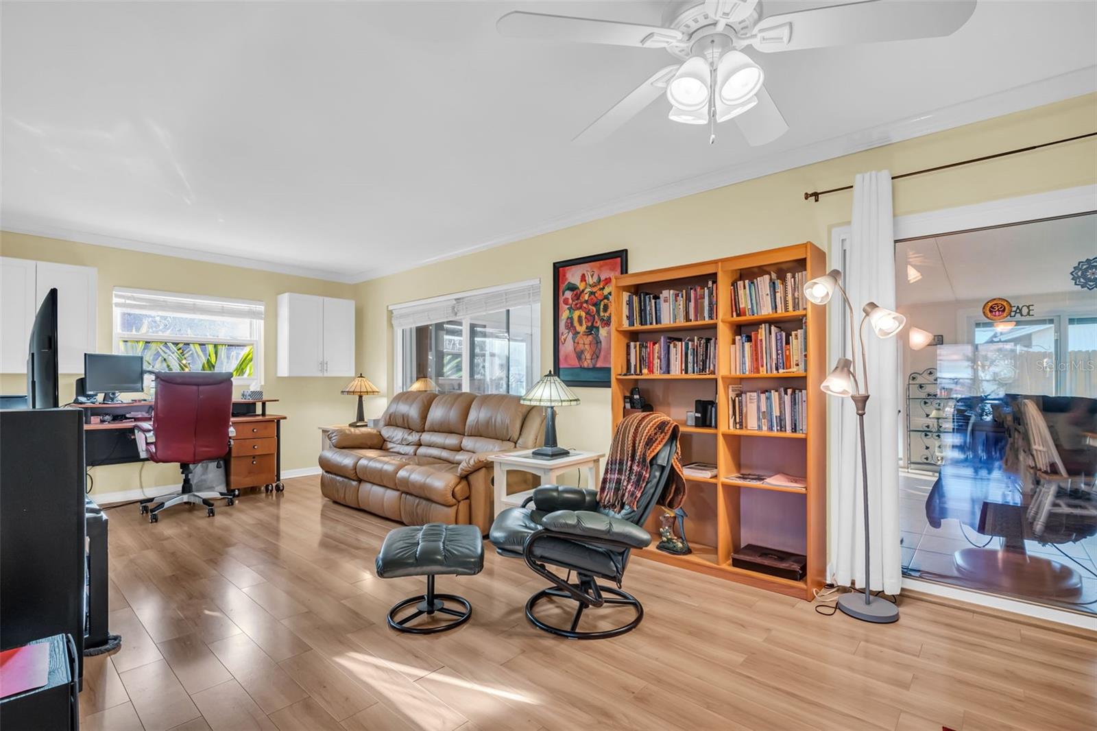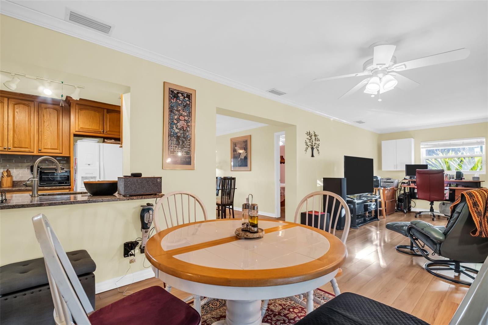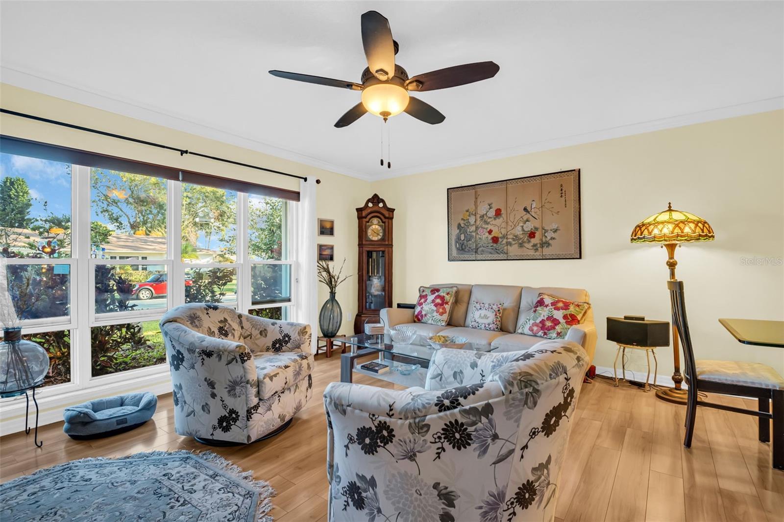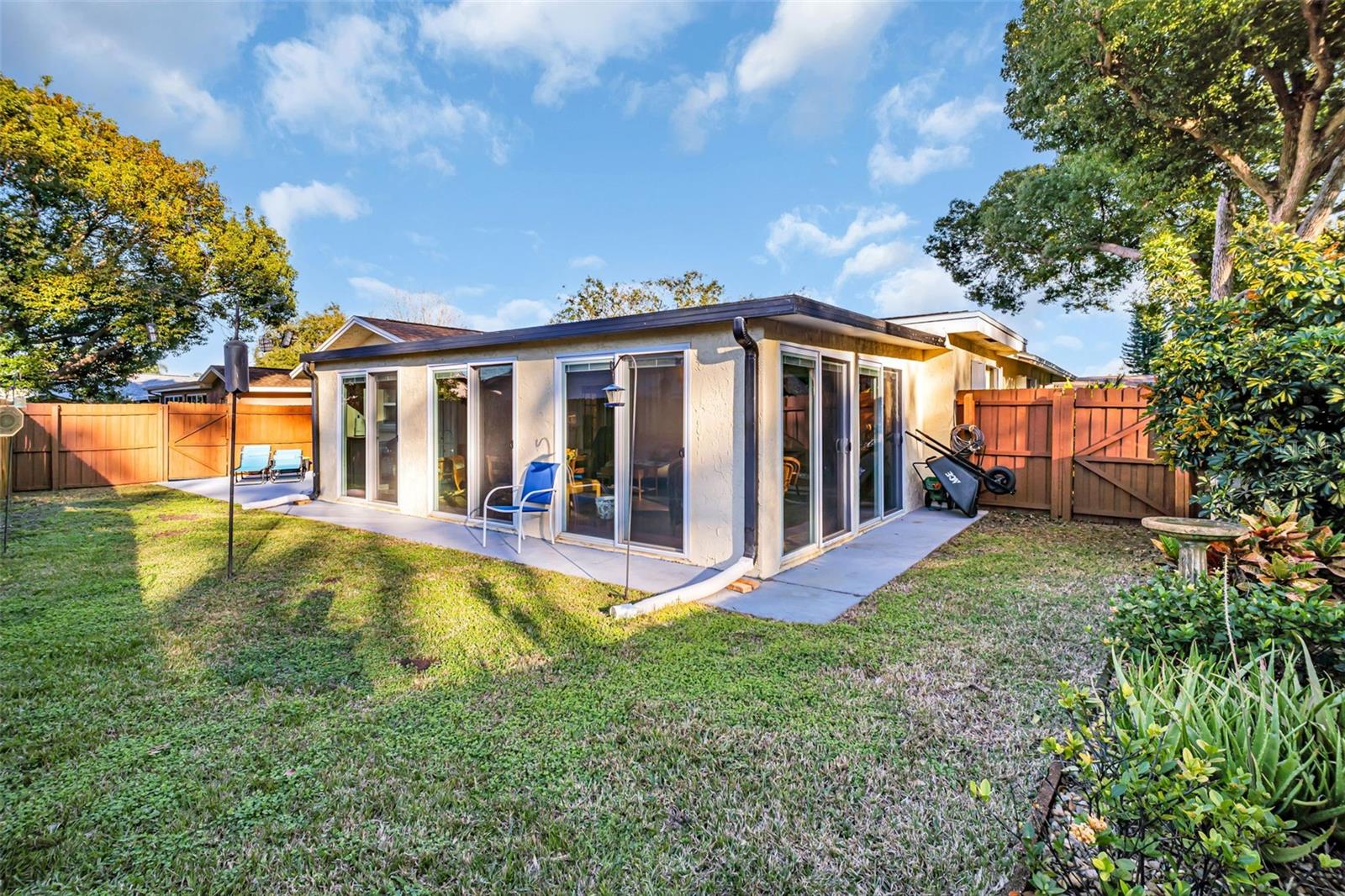 UNBELIEVABLE OPPORTUNITY!! Don't miss this beautifully updated 2-bedroom, 2-bathroom home with a 1-car garage, located in the HIGHLY DESIRED, Friendly, Social 55+ Community! HIGH AND DRY WITH NO PRIOR FLOODING EVER! Could EASILY BE CONVERTED TO 3 BEDROOMS IF DESIRED. This QUIET neighborhood offers a Clubhouse, a GORGEOUS, LARGE Pool, Pool Table, Library, Game Area, Friendly Neighbors and a variety of Social Events. With a LOW HOA fee of only $500 per year, this is an amazing place to call home. This charming CORNER LOT home is directly across from John Chestnut Park, a beautiful park situated on Lake Tarpon. Enjoy scenic trails, boardwalks, boat ramps, and abundant wildlife, including deer that often roam into the neighborhood. Inside, you'll find no carpet—just updated laminate and tile flooring throughout, along with crown molding for an elegant touch. The home also boasts a heated and cooled finished lanai with sliders featuring built-in blinds, providing extra living space. The roof was replaced in 2020, and the AC is 5 years old, ensuring comfort and efficiency. Plus, a tankless hot water heater (only 1 year old) and a new washing machine adds to the home's modern amenities. The house is equipped with hurricane shutters on all doors and windows for peace of mind. Home also includes a water filtration system. The fully fenced backyard offers privacy. There is a well that is used for sprinklers/irrigation. This 55+ community requires at least one resident to be 55 or older, making it the perfect place for those seeking a peaceful, in a friendly, well-maintained environment. Hurry, this won't last long!
