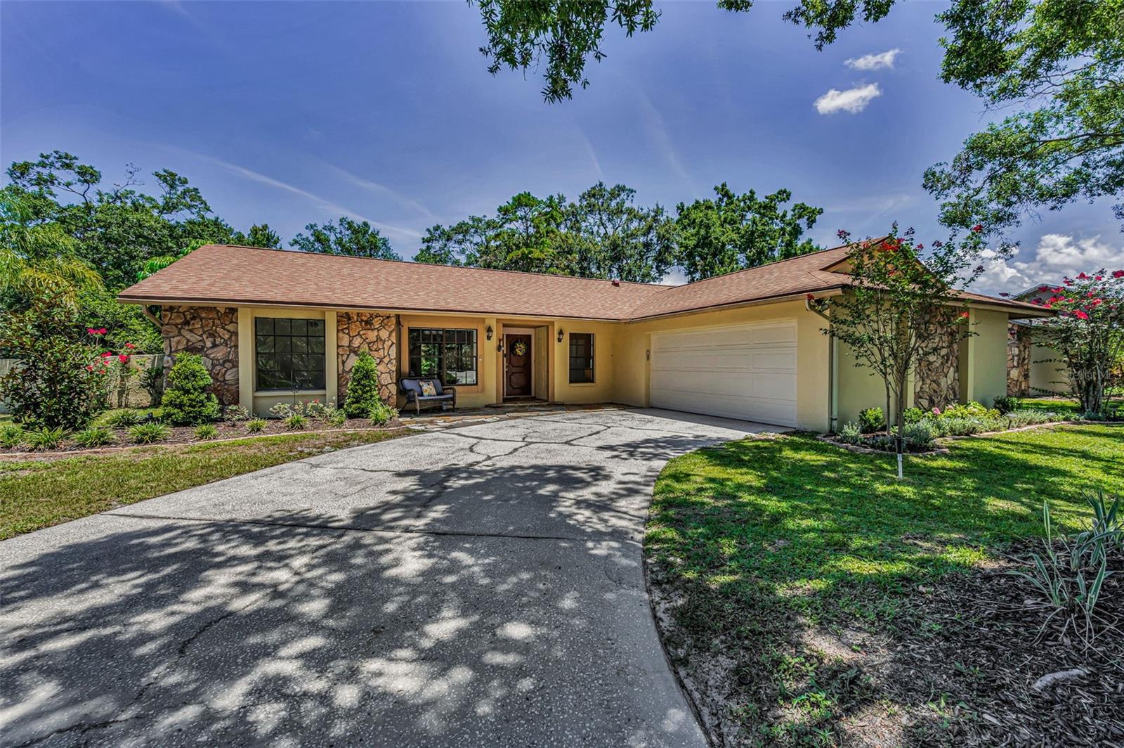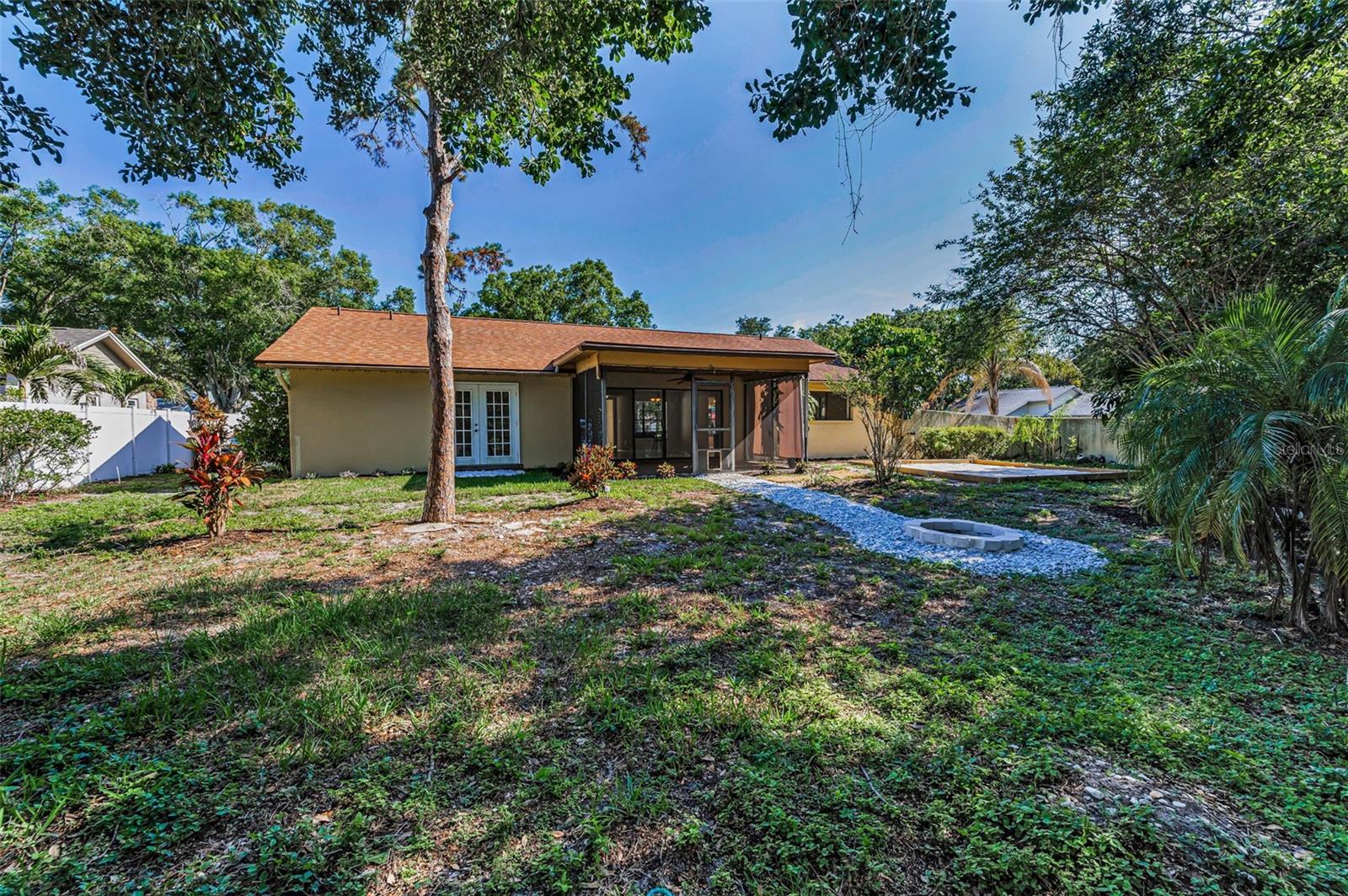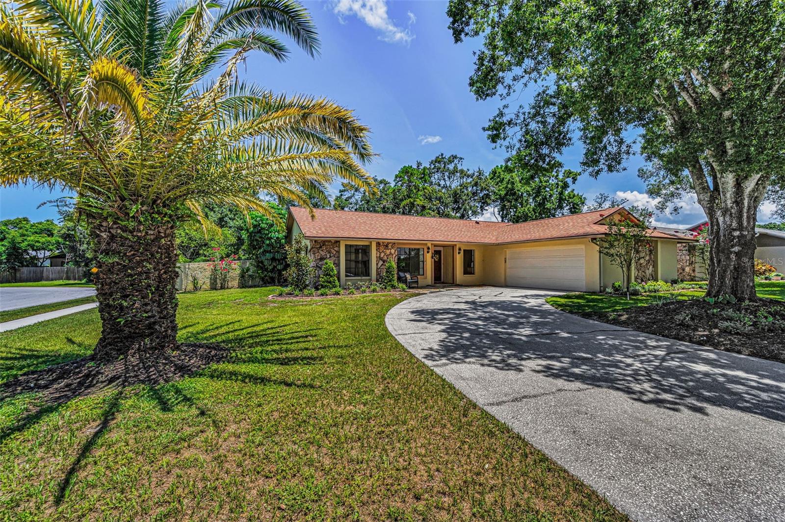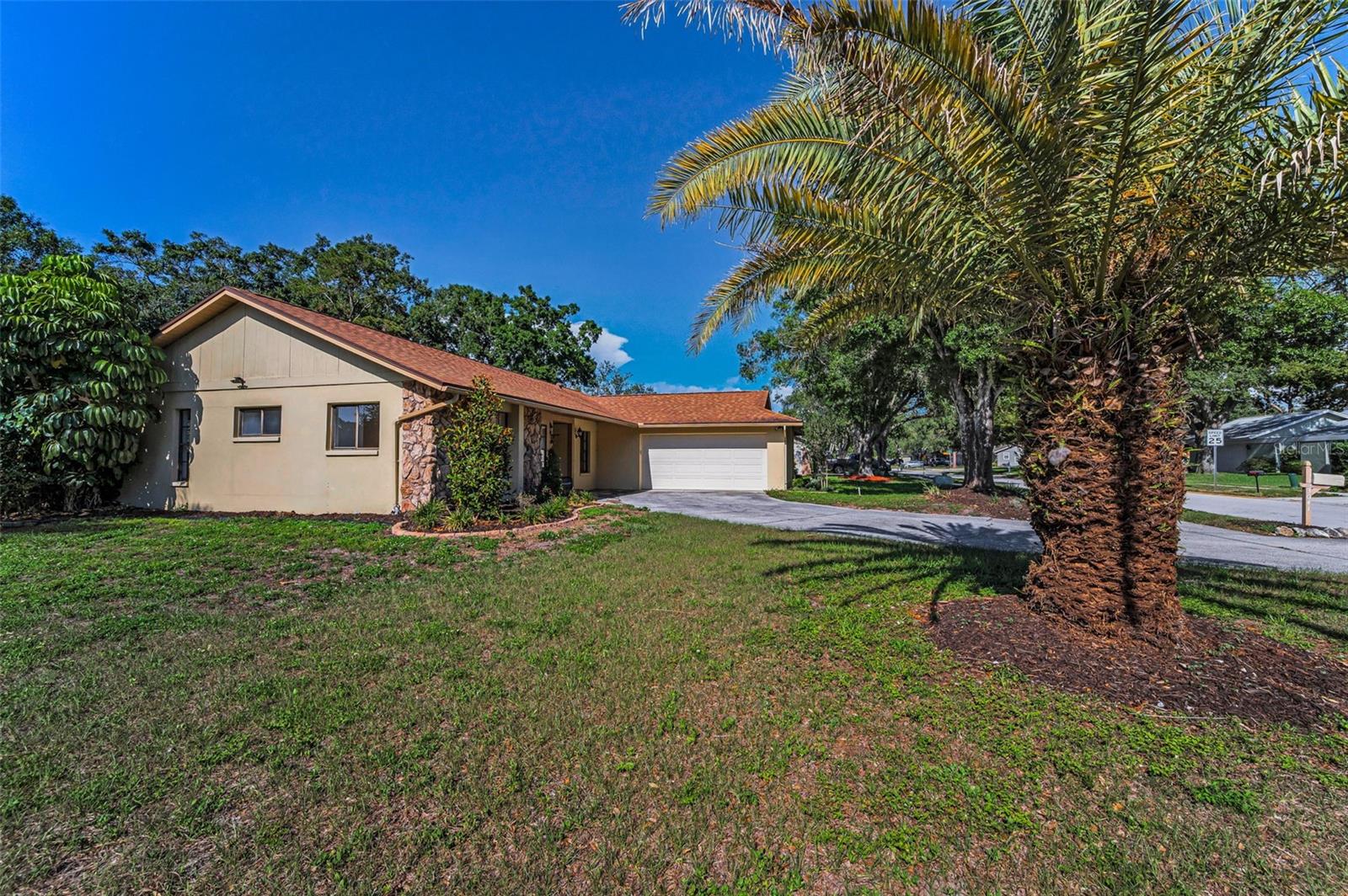 One or more photo(s) has been virtually staged. Welcome to this beautifully maintained 3-bedroom, 2-bathroom single-family home, perfectly situated on a private corner lot in one of Palm Harbor’s most desirable neighborhoods. Enjoy quintessential Florida living in a community with an optional HOA, no flood insurance requirement, and located in a non-evacuation zone. The home features a split-bedroom floor plan with an open, airy layout, highlighted by tile and wood laminate flooring throughout. Natural light pours in through large windows and sliding glass doors that lead to a spacious screened-in lanai—ideal for relaxing or entertaining. The heart of the home is the updated kitchen, complete with stainless steel appliances, wood cabinetry with under-cabinet lighting, recessed lighting, a movable island, and a generous walk-in pantry. Adjacent to the kitchen is a convenient laundry room with direct access to the attached two-car garage. The primary suite offers a tranquil retreat, featuring a large walk-in closet with custom shelving, double vanity sinks, and a step-down shower that doubles as a soaking tub. French doors open from the primary bedroom to a newly added rock patio and freshly landscaped lawn—perfect for enjoying the outdoors. The partially fenced backyard also includes a spacious sandbox area, easily convertible into an above-ground pool. Updates include a roof replaced in February 2020 and HVAC system upgraded in August 2021. Located just minutes from top-rated schools, shopping, dining, and the stunning Gulf Coast beaches, with Tampa International Airport and St. Pete-Clearwater Airport only 30–35 minutes away, this move-in ready home offers Florida charm and convenience without extra fees. Don’t miss this rare opportunity!