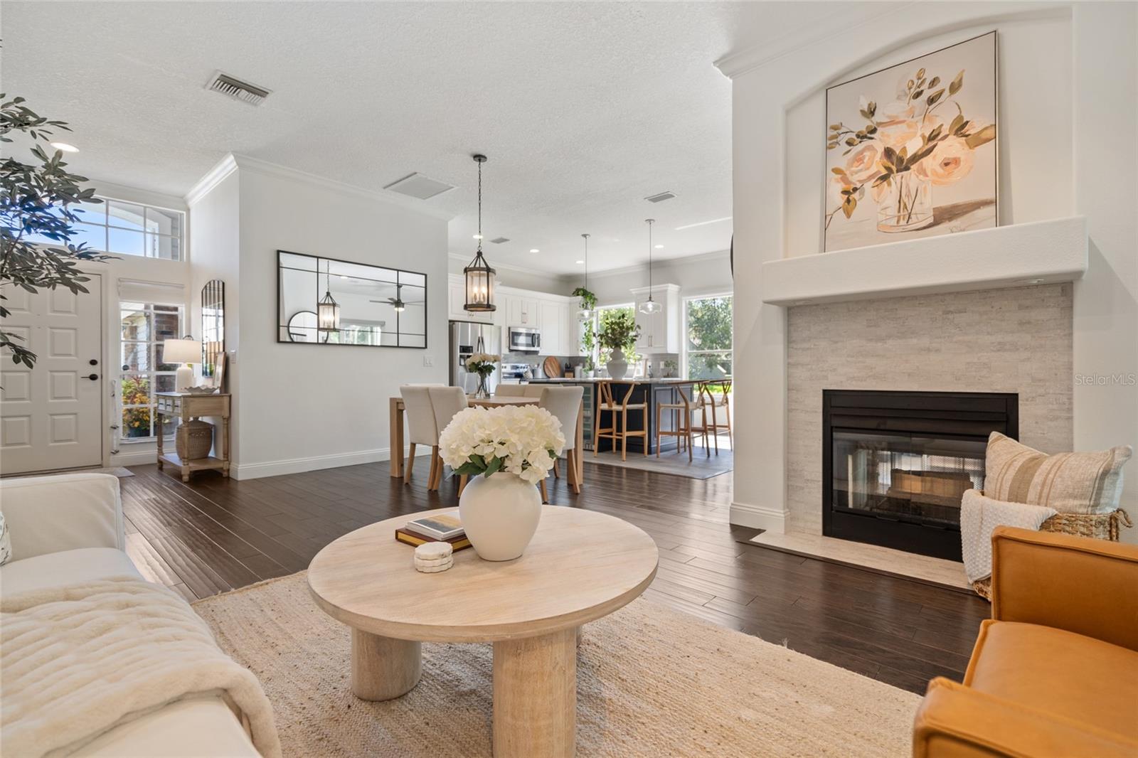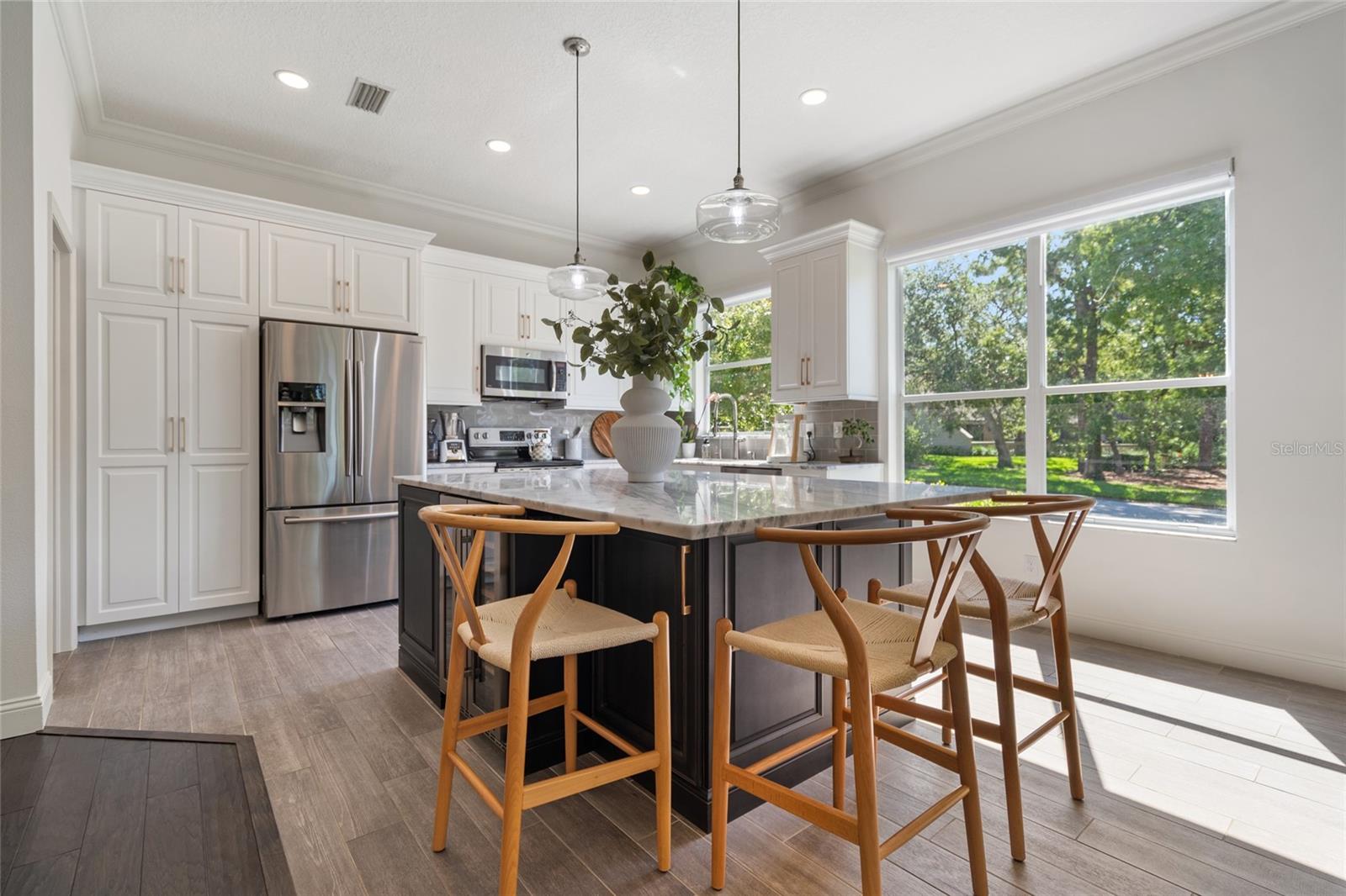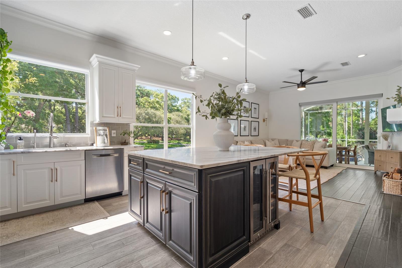 Welcome to 2182 Trevor Rd, an extensively updated 4-bedroom, 2-bath home located in the Enclave at Gleneagles, one of Palm Harbor’s most desirable neighborhoods. Situated on a quiet corner lot with no rear neighbors, this property offers both privacy and a sense of open space rarely found in residential settings. Once you step inside this beauty you are welcomed by 10-foot ceilings, engineered hardwood floors throughout the main living areas, and a bright, open-concept layout designed for both everyday comfort and elegant entertaining. Large windows and NEW hurricane-impact sliding glass doors flood the home with natural light and feature remote-controlled custom blinds for added ease and style. At the heart of the home is a stunning, oversized gourmet kitchen, truly the centerpiece of the residence. Designed for both beauty and functionality, it boasts solid surface countertops, a massive center island with cabinet storage on both sides, stainless steel appliances, a wine refrigerator, and sleek modern finishes. The kitchen flows seamlessly into the main living and dining areas, making it the perfect gathering space for family and friends. The home includes four generously sized bedrooms, including a private owner’s suite with a large walk-in closet and direct access to the screened lanai. The fourth bedroom offers great flexibility as a den, office, or guest room. All secondary bedrooms feature newly installed custom California closets. Additional Highlights: • Three NEW high-impact hurricane-rated sliding doors • Updated modern lighting and ceiling fans • NEW interior paint and upgraded door hardware • Popcorn ceilings removed and professionally retextured • NEW Epoxy-coated garage floor • NEW Reverse osmosis system and water softener • NEW irrigation system and well pump • Renovated guest bathroom Enjoy tranquil evenings in the screened lanai, where you can relax and unwind while overlooking the open green space behind—no rear neighbors, just peace and privacy. Located in the established Gleneagles community with mature trees, well-kept surroundings, and quiet streets. Also, close to great shopping including a brand new TRADER JOE'S nearby. With 1,964 square feet of thoughtfully designed living space, a 2-car garage, and an HOA that includes cable and internet, this beautifully remodeled home is move-in ready and offers exceptional value in one of Palm Harbor’s most desirable locations. Additionally, this home is not in a flood zone, providing peace of mind. A true standout...don’t miss the opportunity to make this remarkable home yours.