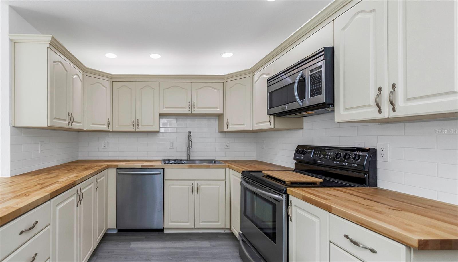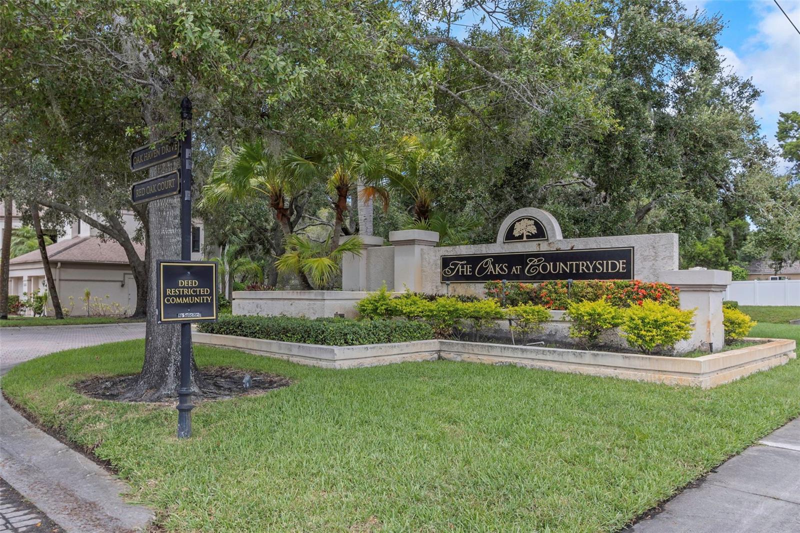 PRICED FOR QUICK SALE - Beautiful turn-key, recently updated 3-bedroom, 2-bathroom condo in the Oaks at Countryside community. Private, deep 1-car garage with plenty of storage space and shelving. Recent upgrades include new waterproof vinyl floors, light fixtures, bathroom vanities, tile showers, butcher block countertops, and newer hot water heater, AC unit, roof, and stainless steel appliances. Spacious primary bedroom with walk-in closet and private en-suite bathroom. End unit with extra windows. Washer/dryer hook-up in the condo. First-floor unit for ease of access. Screened in back patio/lanai with a hurricane shutter for extra protection. Condo is a short distance to the pool, heated spa, tennis court, and clubhouse with full kitchen perfect for entertaining guests. Up to 2 pets are allowed with board approval. Close to restaurants and shopping. Water is included in the monthly condo fee. No pending or upcoming special assessments. Condo building is only 2 stories total, so the community is exempt from a Milestone Inspection Report and Structural Integrity Reserve Study which should help keep condo fees lower.